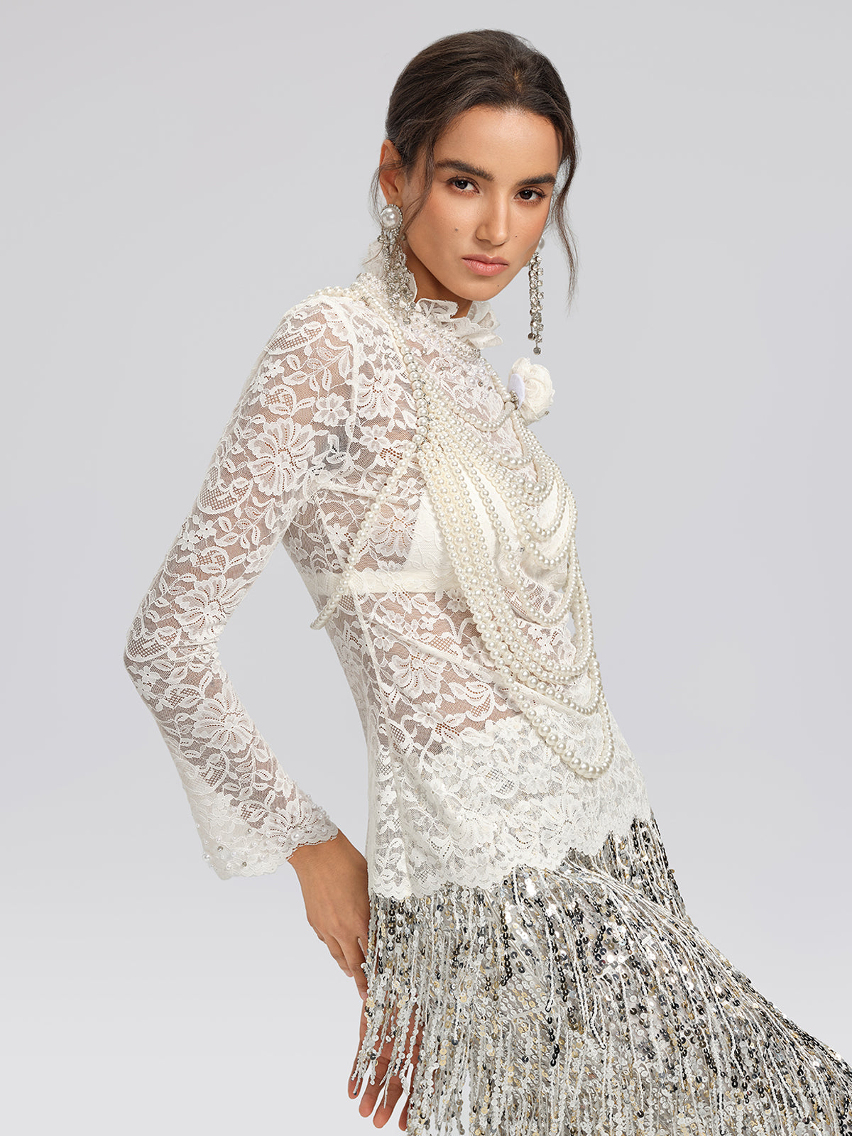 Lace Hand-Beaded Mock Neck Top (Detachable Flower Included)