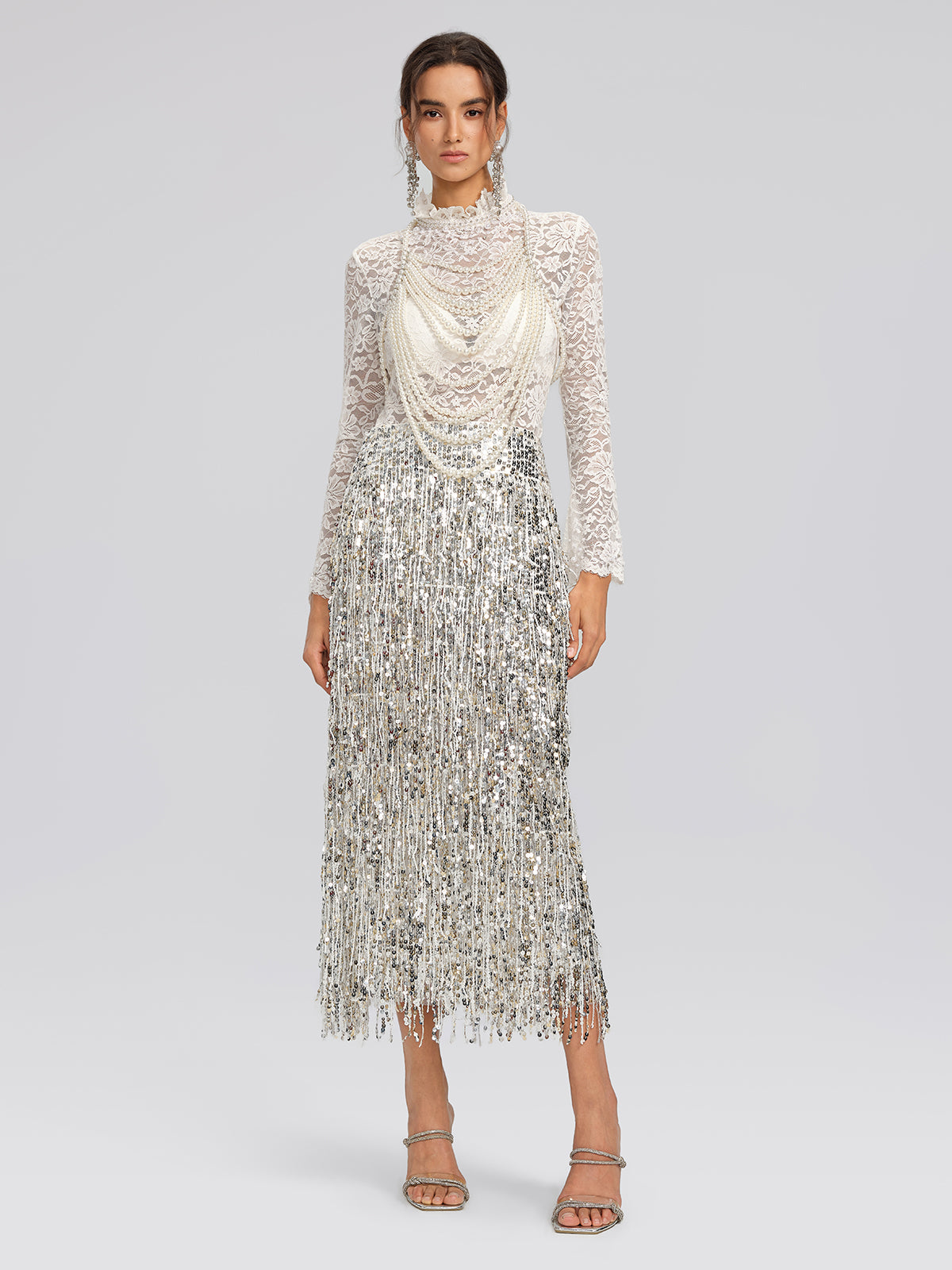 The neckline and cuffs feature hand-stitched pearls and rhinestones, meticulously placed to form layered 3D detailing. Subtle sparkle and pearl sheen add refined highlights to daily outfits. The hem is trimmed with delicate lace, and slight bell sleeves enhance arm lines. Detachable 3D flower decorations allow versatile styling.