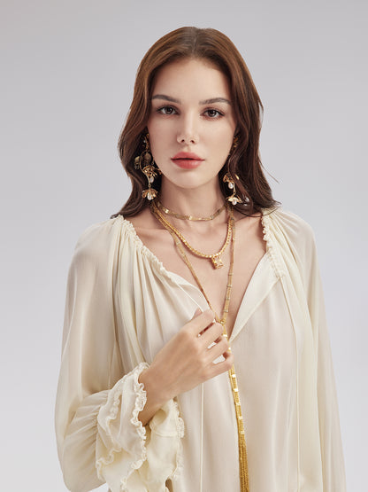 Made from top-grade silk, this blouse offers unparalleled softness and breathability. The pleated front and lace details enhance elegance, while the relaxed fit flatters various body types. Perfect for both formal and casual settings.