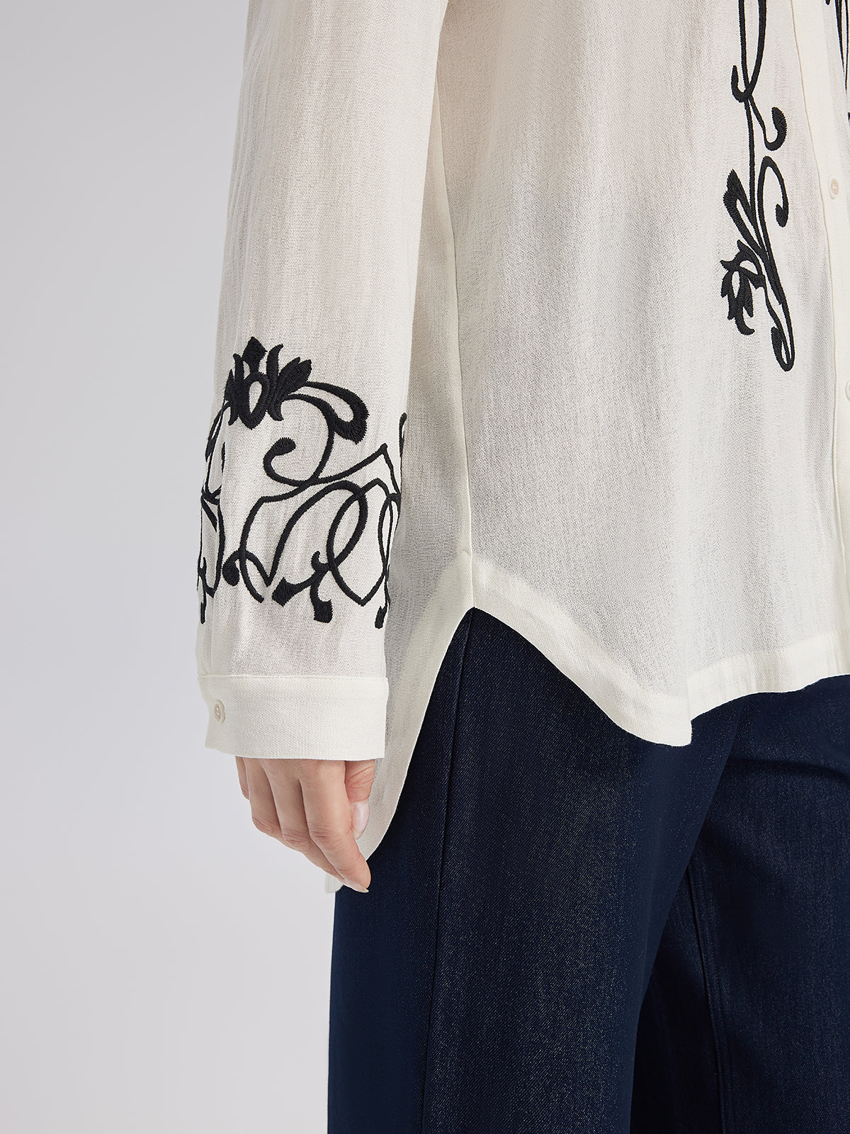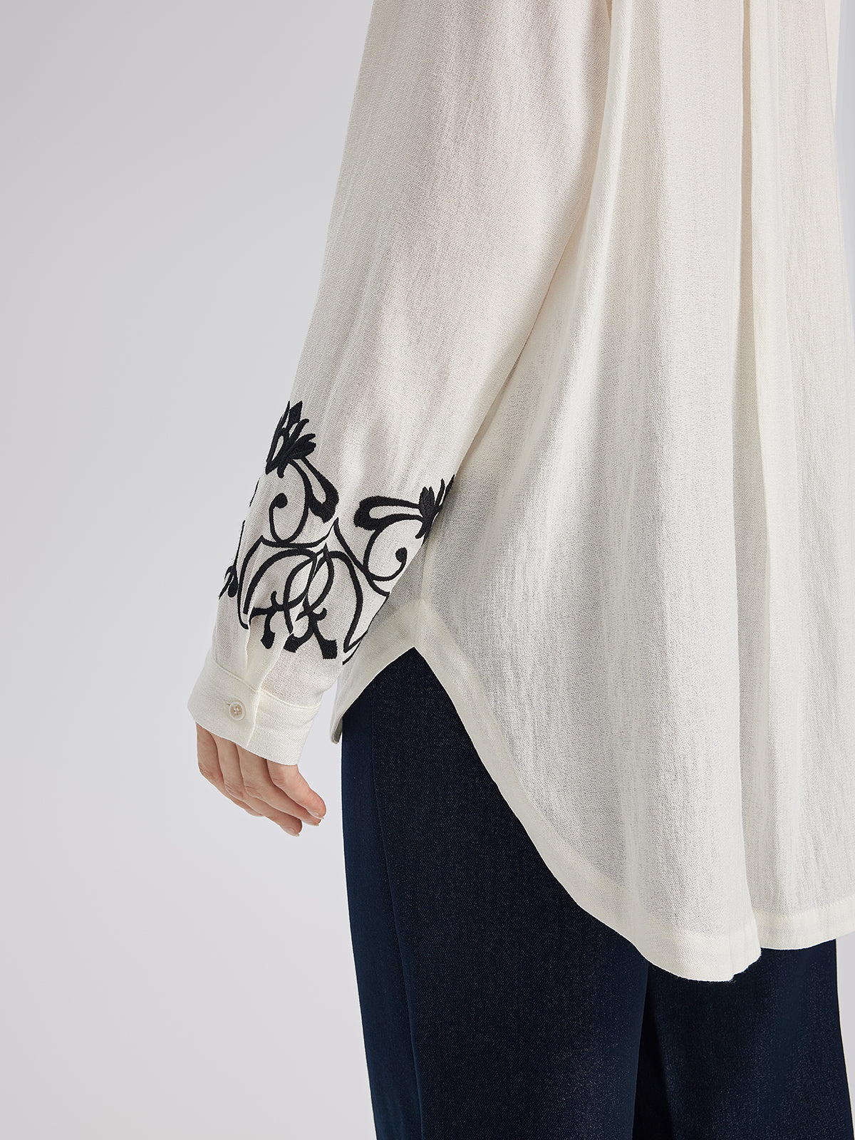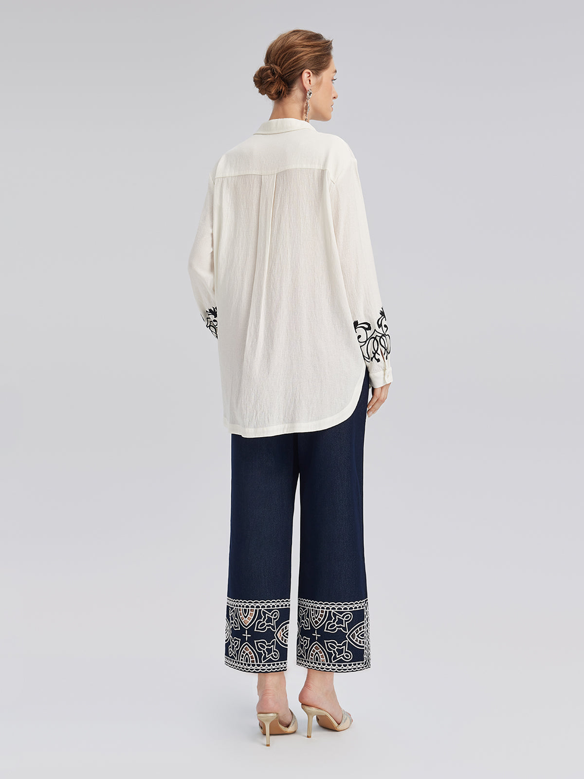 Crafted from premium linen for a soft, breathable hand, this shirt balances classic white with modern embroidery for a look that is both timeless and contemporary. Intricate embroidery highlights the collar, cuffs, and placket, creating a harmonious design with refined detail. Cut in a relaxed silhouette, it offers effortless elegance and comfort.