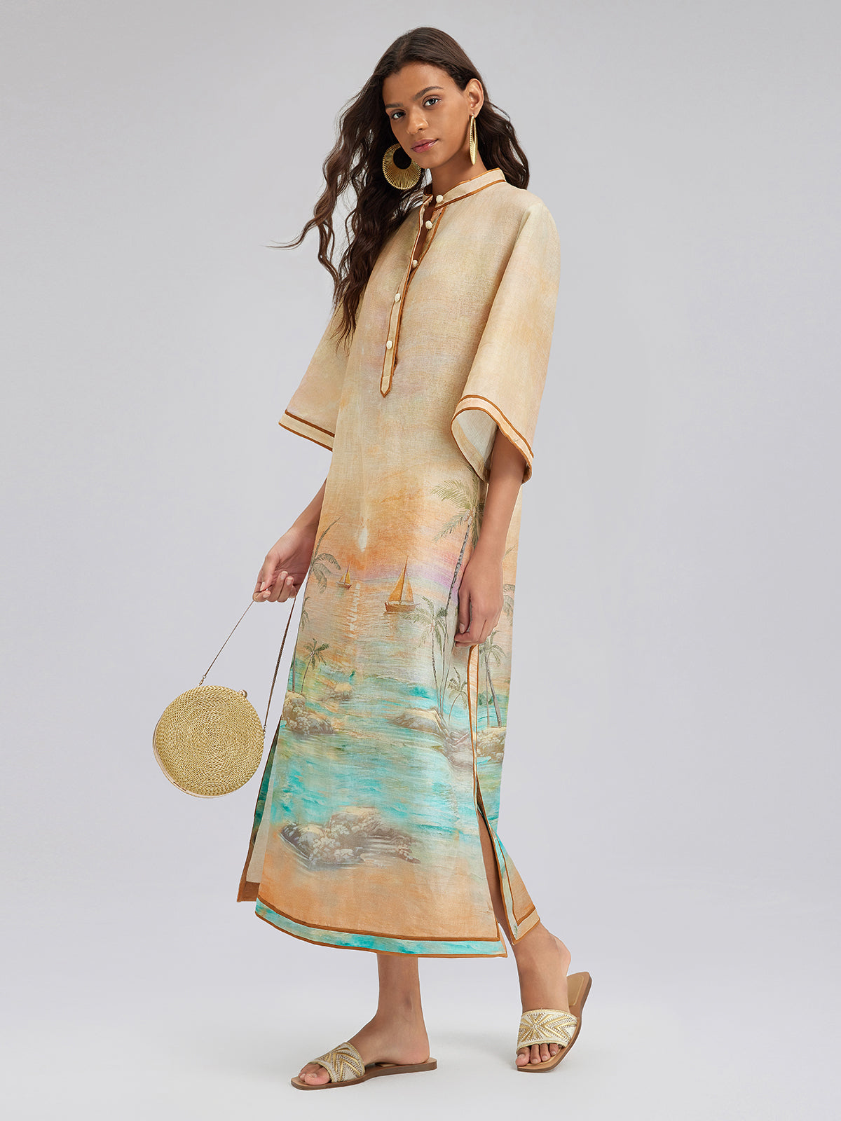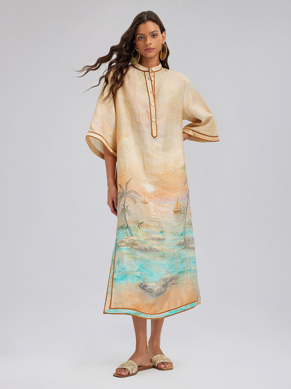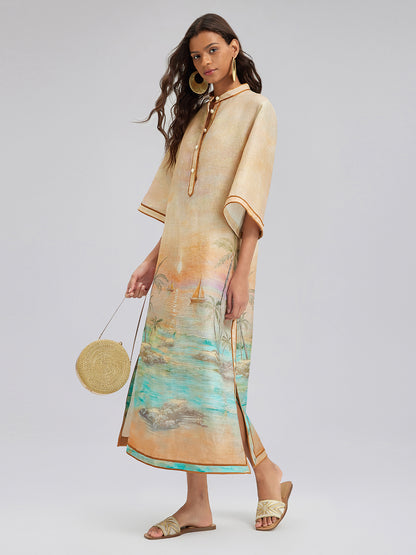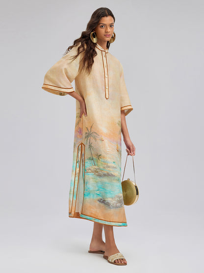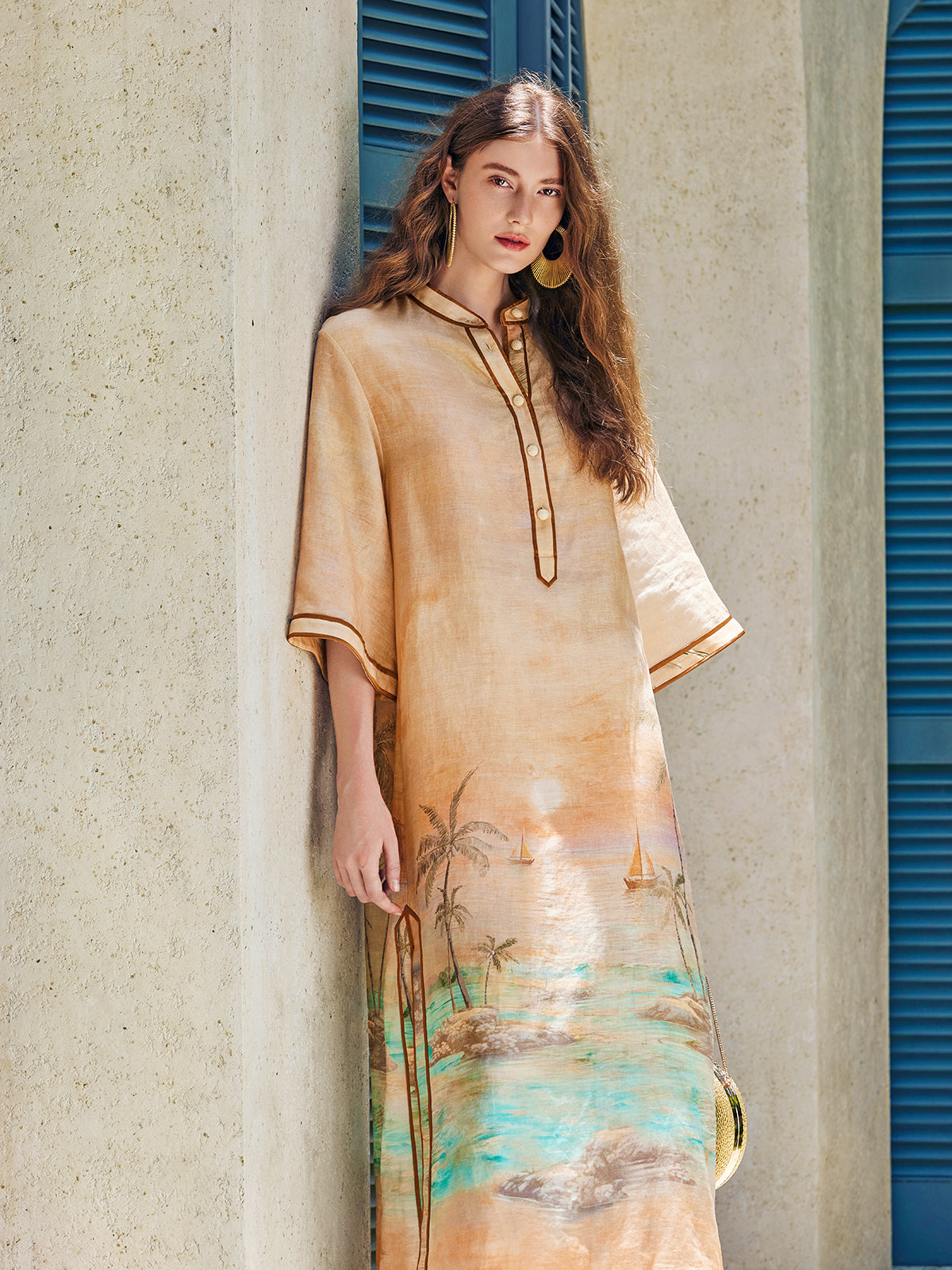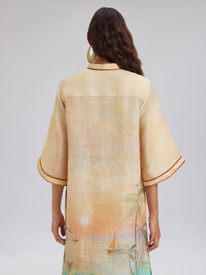 Crafted from soft, breathable linen with a relaxed drape. Features a retro beach print in sunlit tones and bold contrast accents for added depth. A relaxed silhouette featuring flared sleeves and a Japanese-style stand collar. Side slits add a laid-back feel with a hint of understated allure.