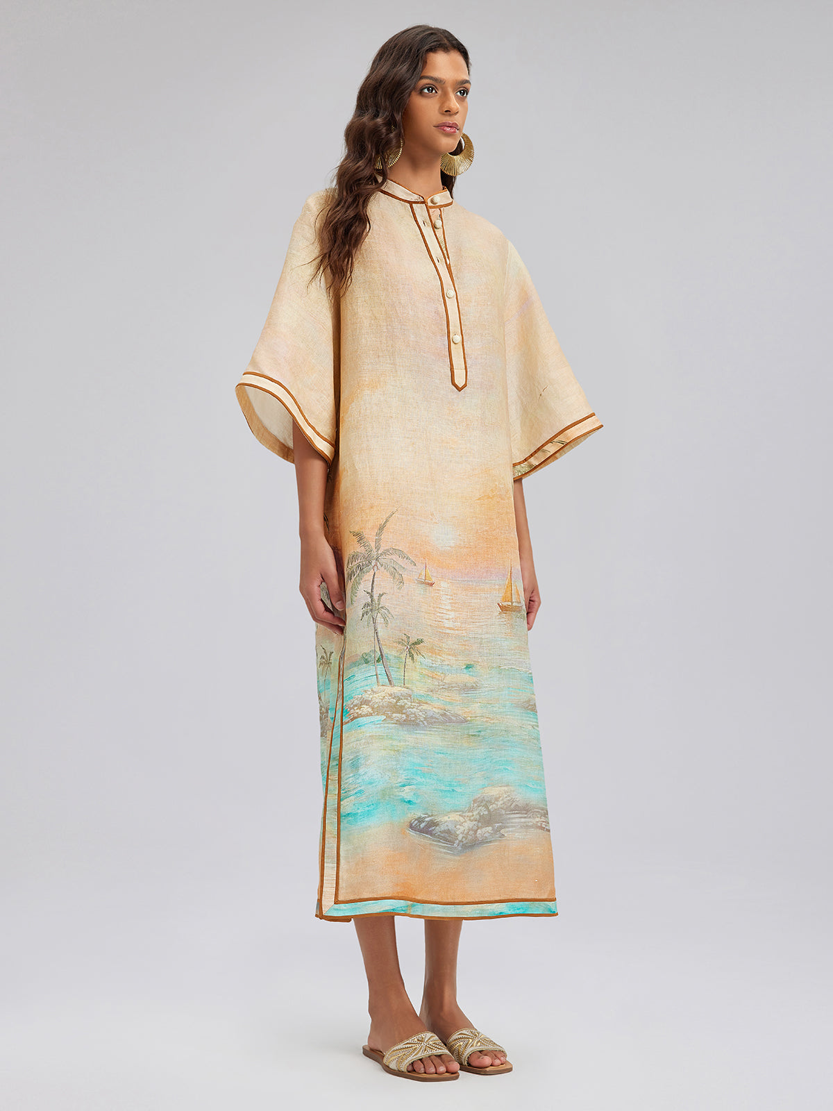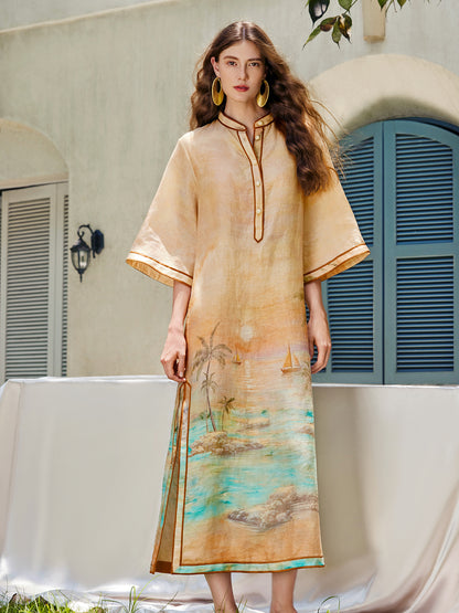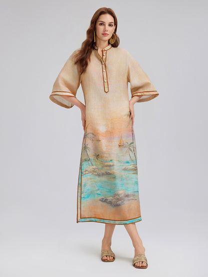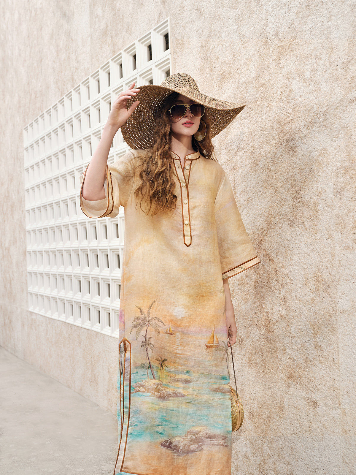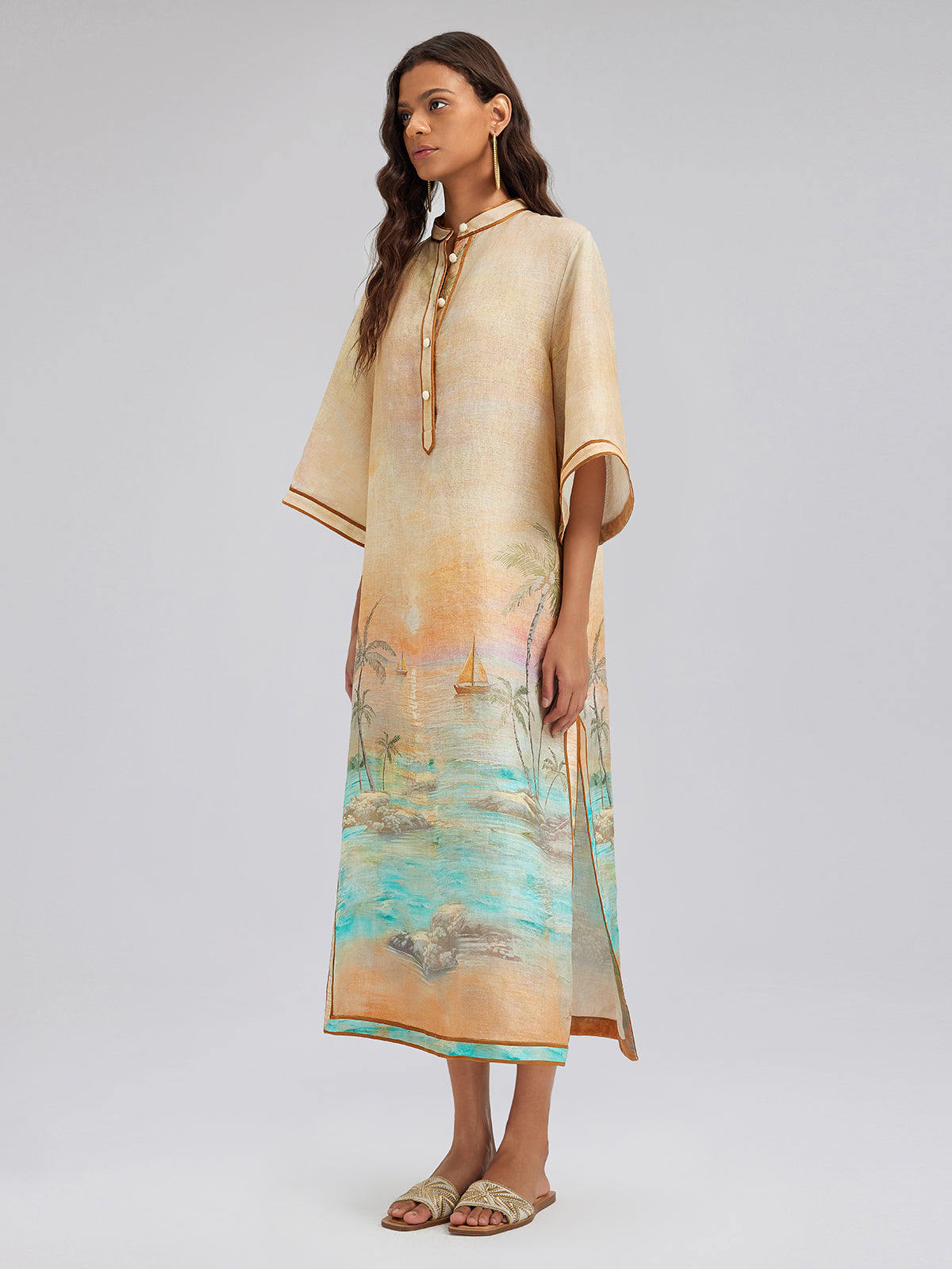 Crafted from soft, breathable linen with a relaxed drape. Features a retro beach print in sunlit tones and bold contrast accents for added depth. A relaxed silhouette featuring flared sleeves and a Japanese-style stand collar. Side slits add a laid-back feel with a hint of understated allure.