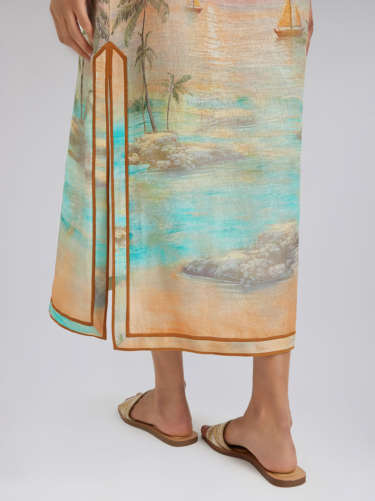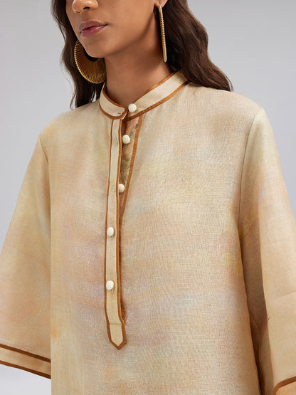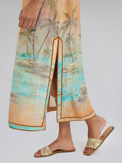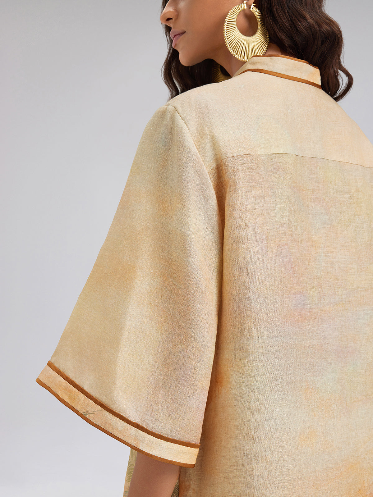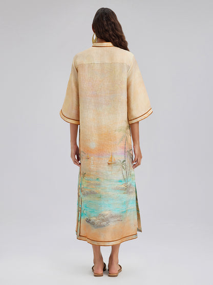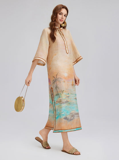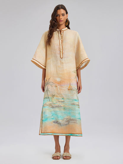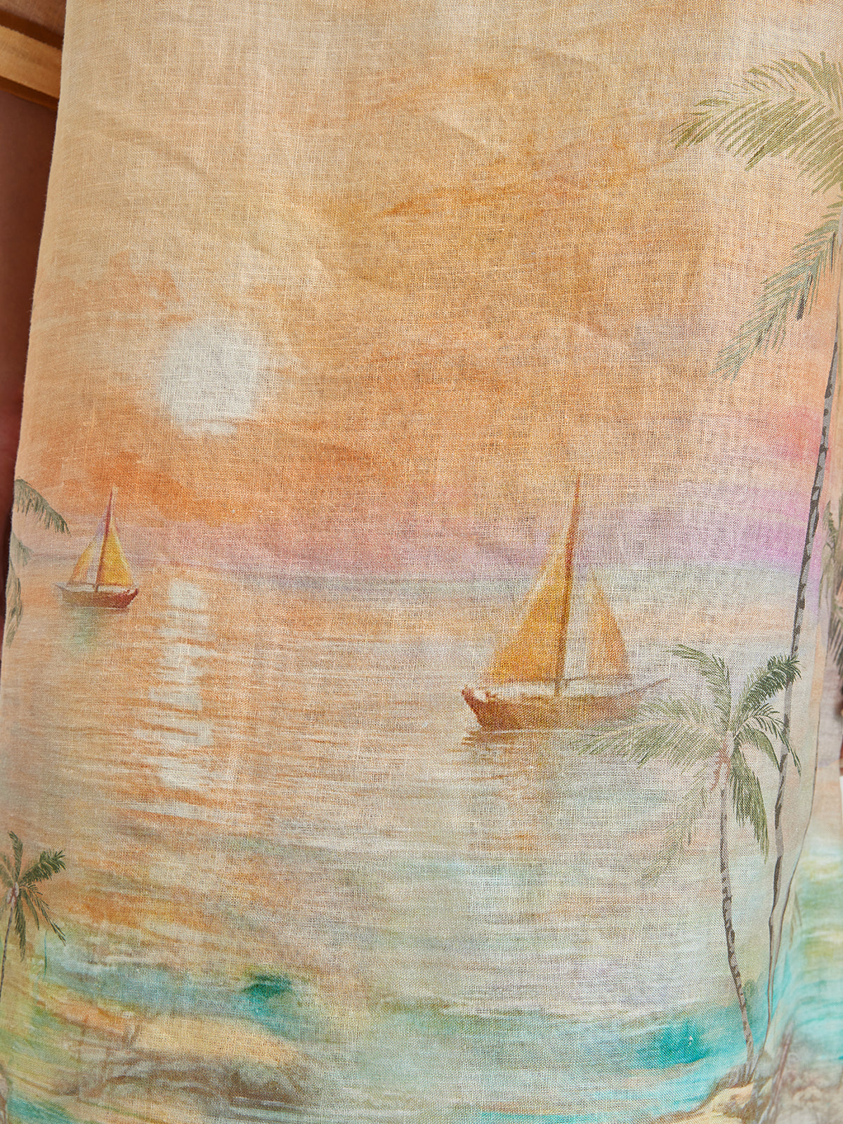 Crafted from soft, breathable linen with a relaxed drape. Features a retro beach print in sunlit tones and bold contrast accents for added depth. A relaxed silhouette featuring flared sleeves and a Japanese-style stand collar. Side slits add a laid-back feel with a hint of understated allure.