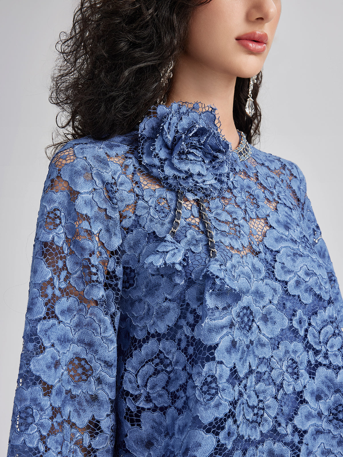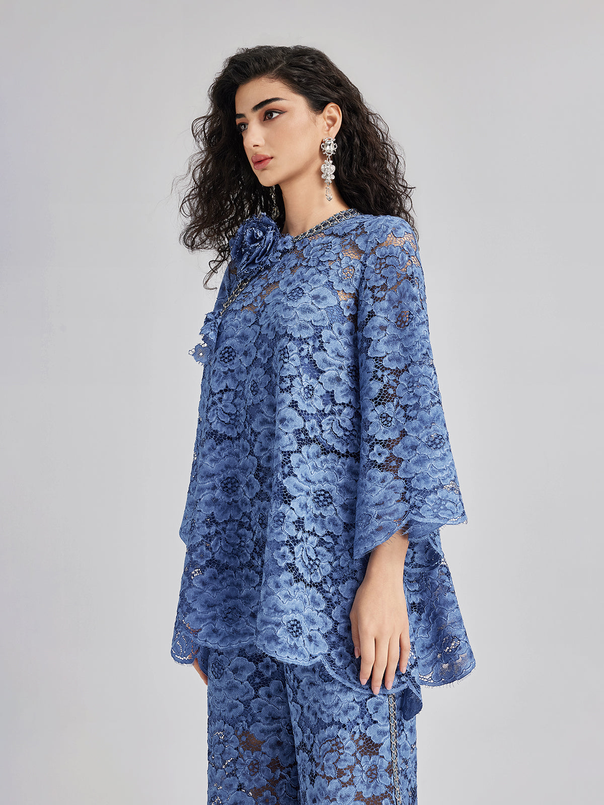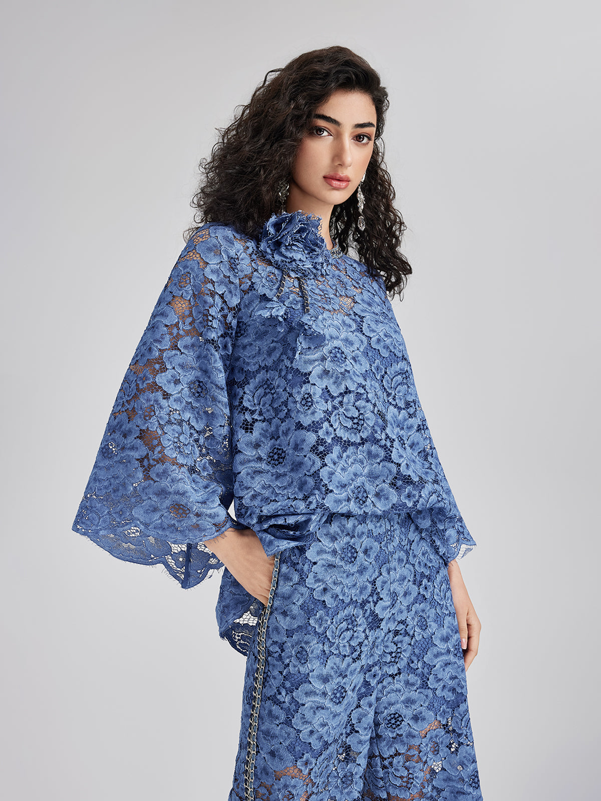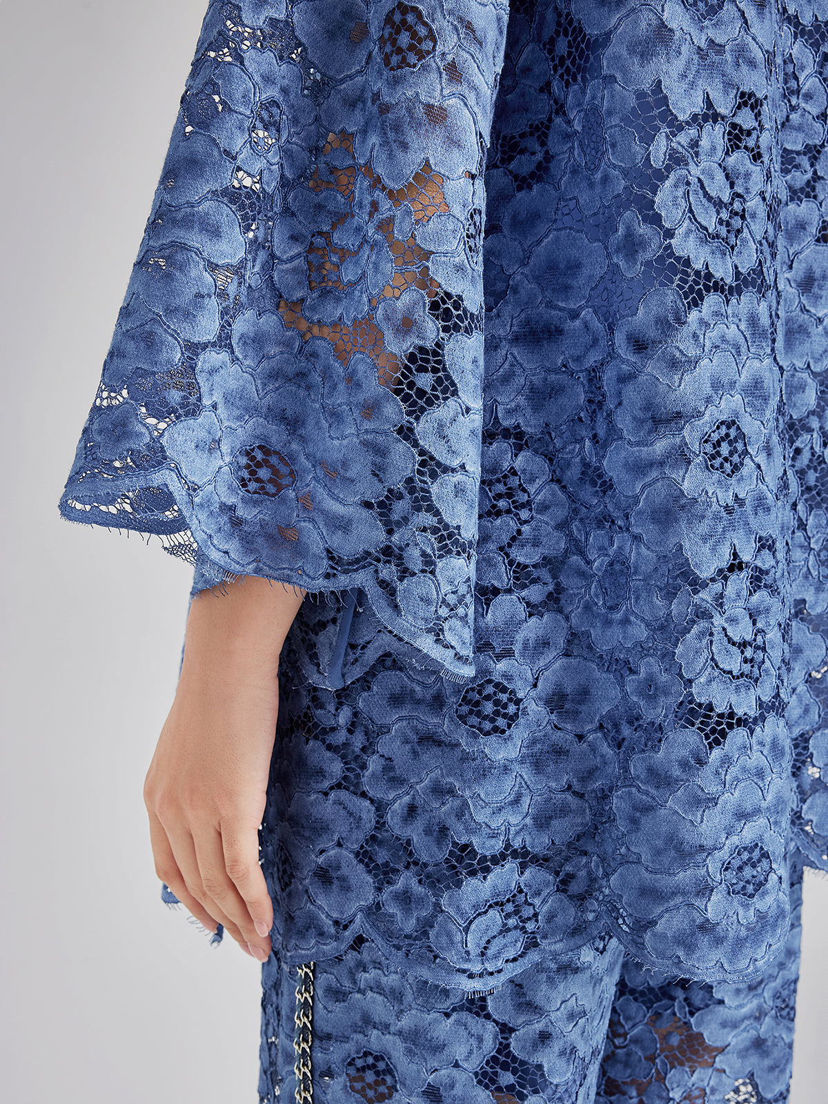 Hand-washed lace creates a one-of-a-kind vintage texture for each piece. Removable matching fabric flower lets you switch up the look. Tone-on-tone chain trim subtly accents the neckline. Premium lace holds its shape. Comes with a matching camisole for coverage and comfort. Relaxed fit suits all body types.