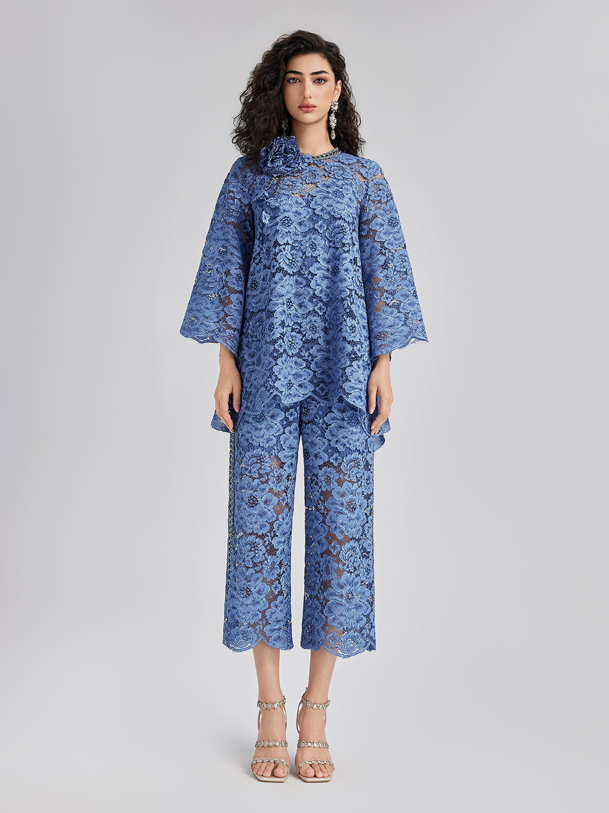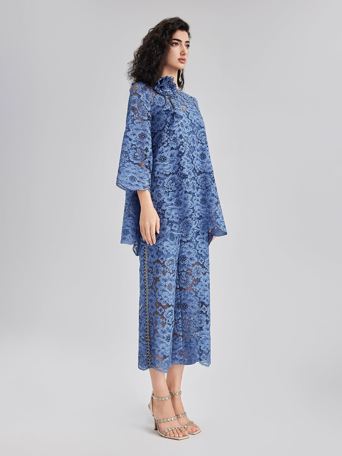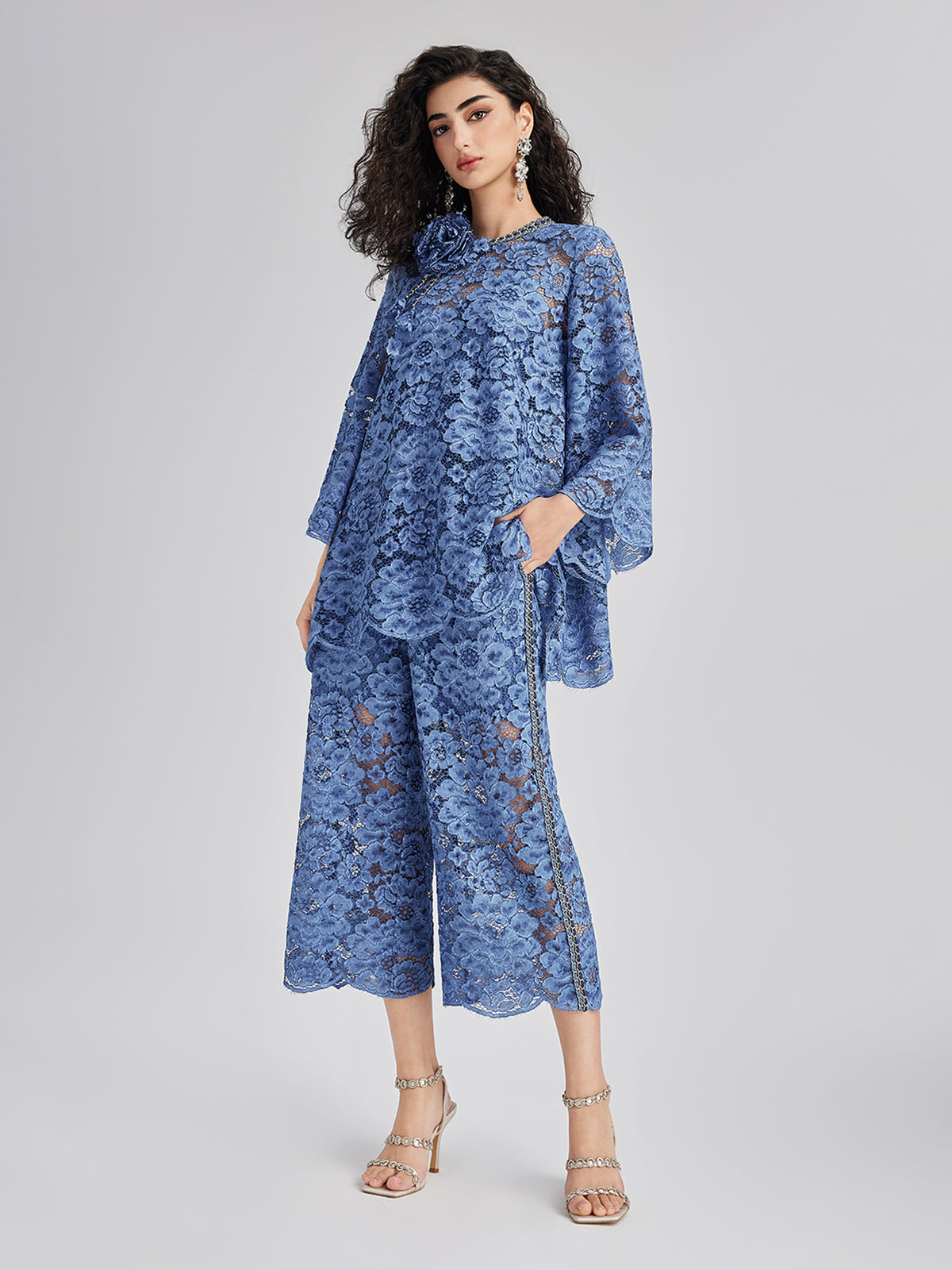 Hand-washed lace creates a one-of-a-kind vintage texture for each piece. Removable matching fabric flower lets you switch up the look. Tone-on-tone chain trim subtly accents the neckline. Premium lace holds its shape. Comes with a matching camisole for coverage and comfort. Relaxed fit suits all body types.