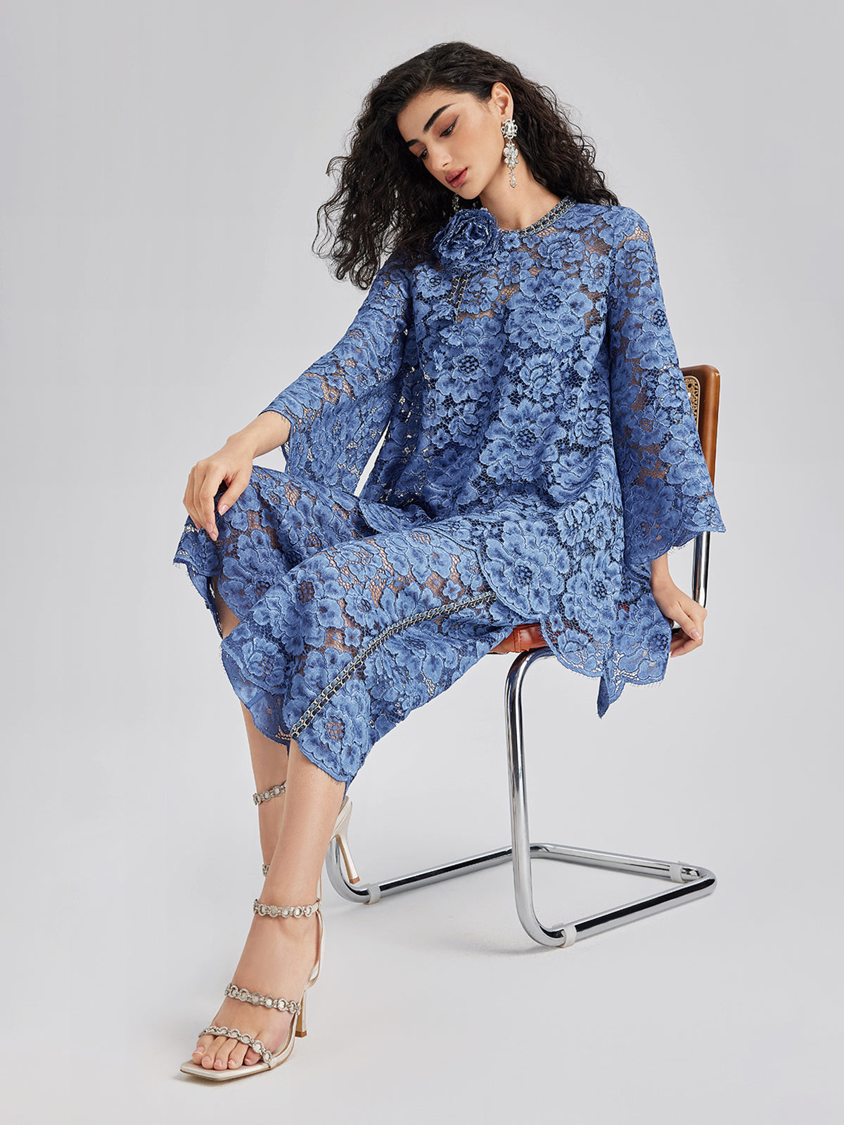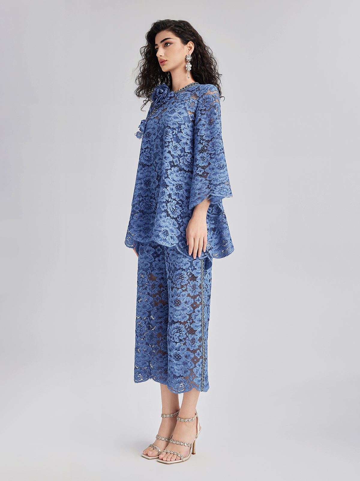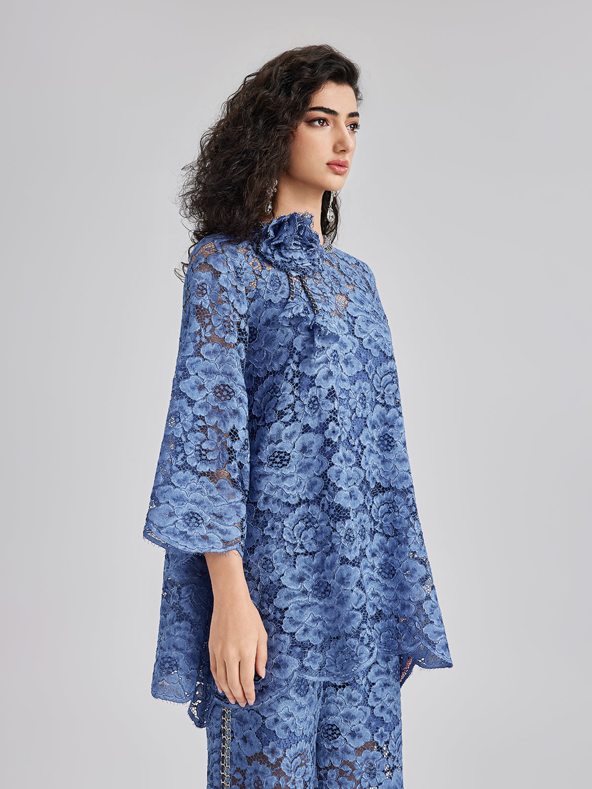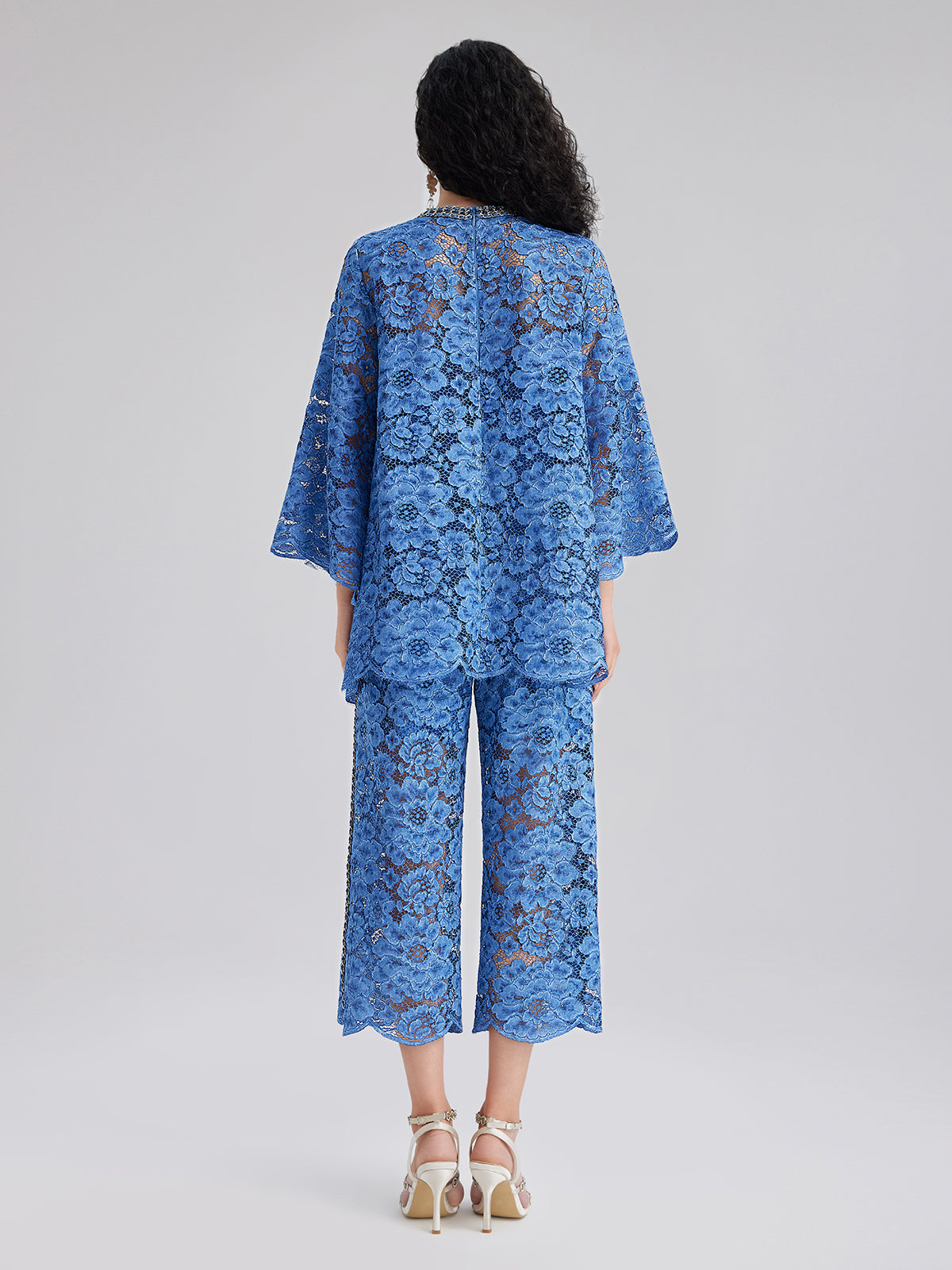 Hand-washed lace creates a one-of-a-kind vintage texture for each piece. Removable matching fabric flower lets you switch up the look. Tone-on-tone chain trim subtly accents the neckline. Premium lace holds its shape. Comes with a matching camisole for coverage and comfort. Relaxed fit suits all body types.