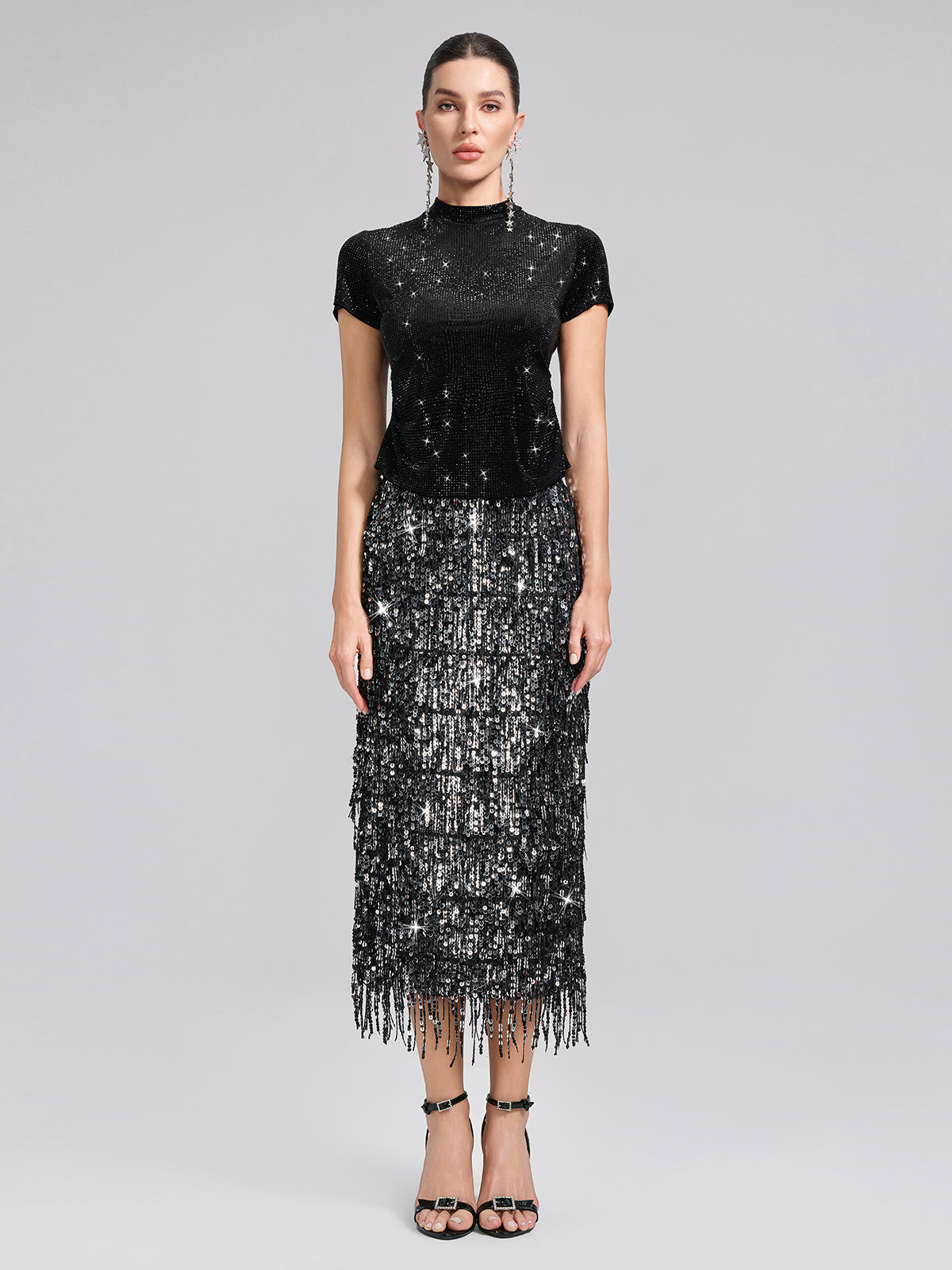 Made from high-stretch velvet, this top feels soft, flattering, and comfortably flexible. The fully rhinestoned surface delivers a striking, luxurious sparkle, while side hand-ruching and a fitted cut refine the silhouette. A chic high neckline and a back zipper complete the design—perfect for party entrances or elevated everyday style.