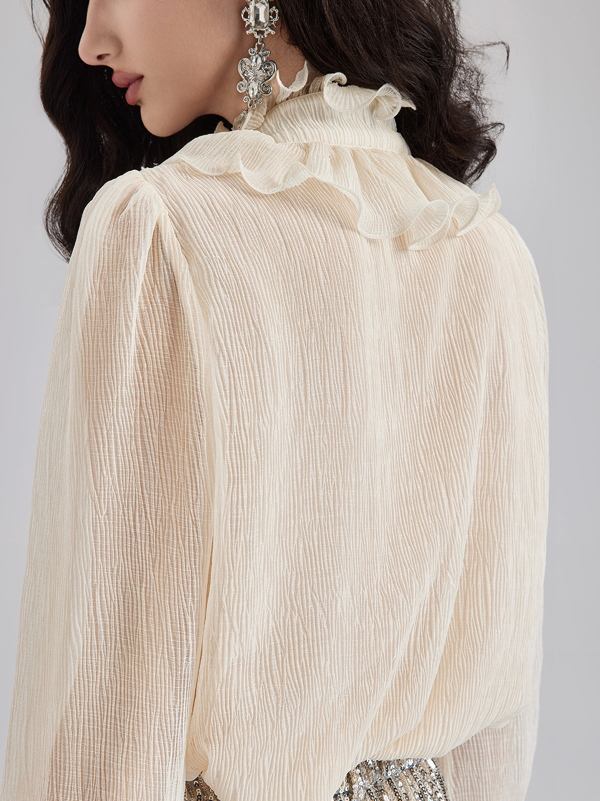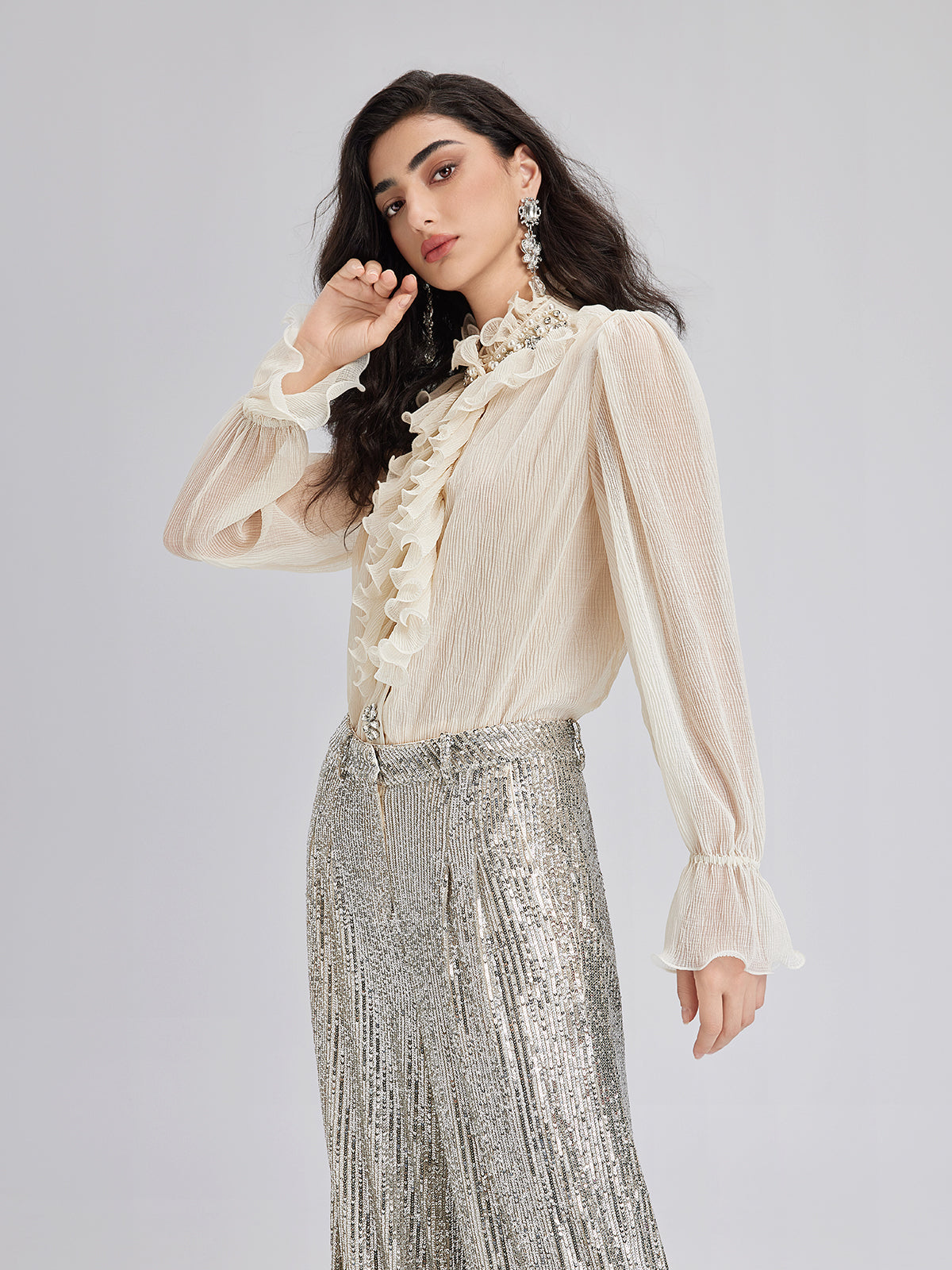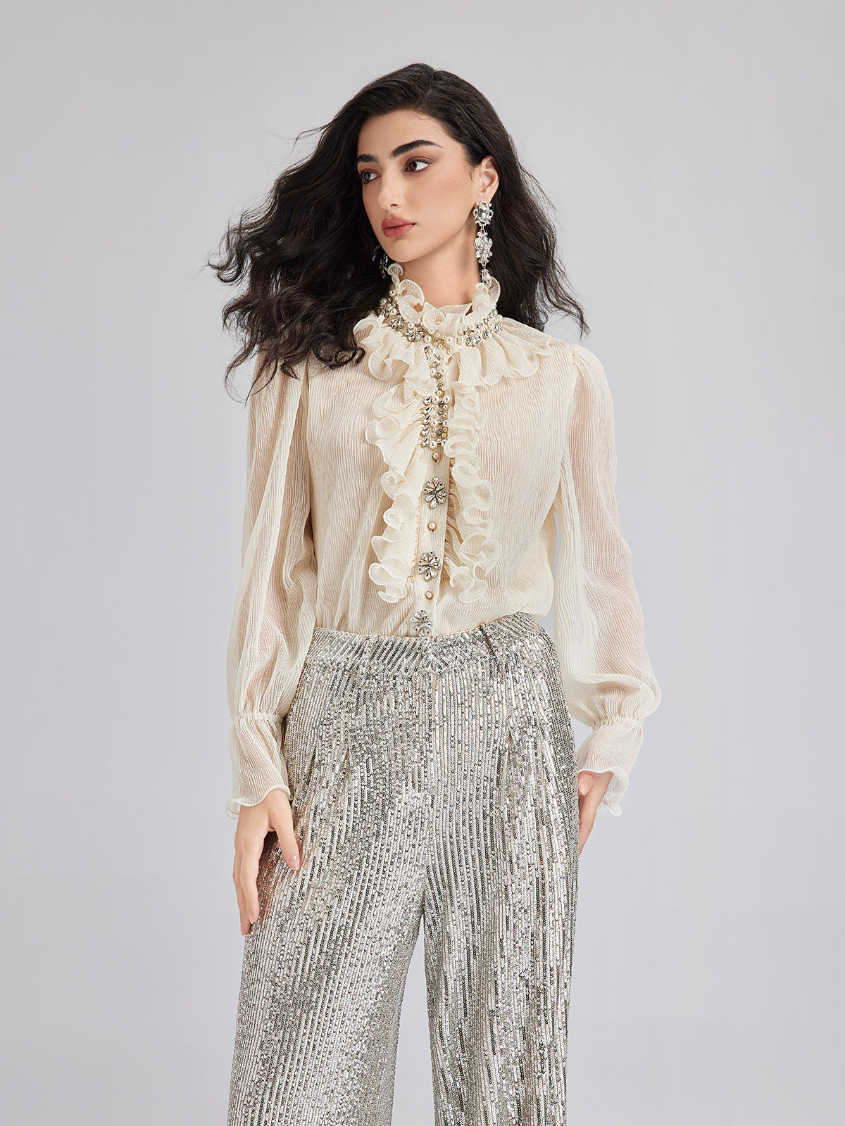 Ruffled Stand Collar Beaded Shirt - Chic Style