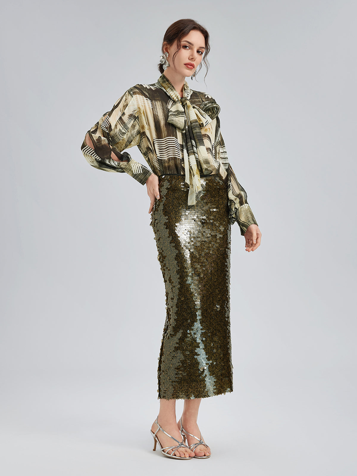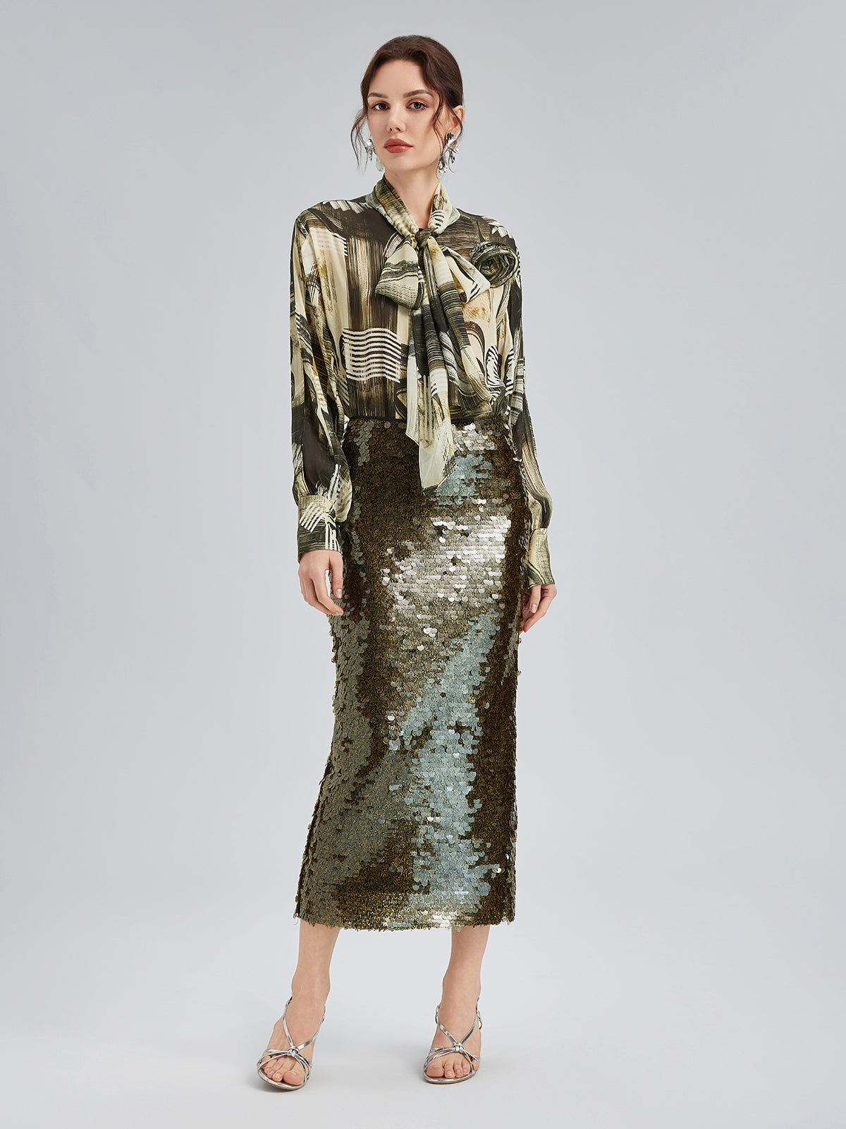 This sequin-covered skirt features a striking color contrast and stretchy fabric for comfort. Handmade sequins add a luxurious feel, perfect for parties or formal occasions. Sleek design ensures elegance with every step.