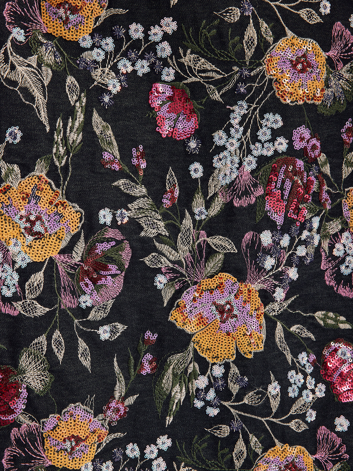 High-density embroidered fabric sparkles with sequined florals, shifting with the light. A lace V-neck with crochet details accentuates femininity, while fringed cuffs sway gracefully, lending a free-spirited bohemian touch. The rich florals and sequins merge with lace and tassels, forming a balance of opulence, softness, and movement.