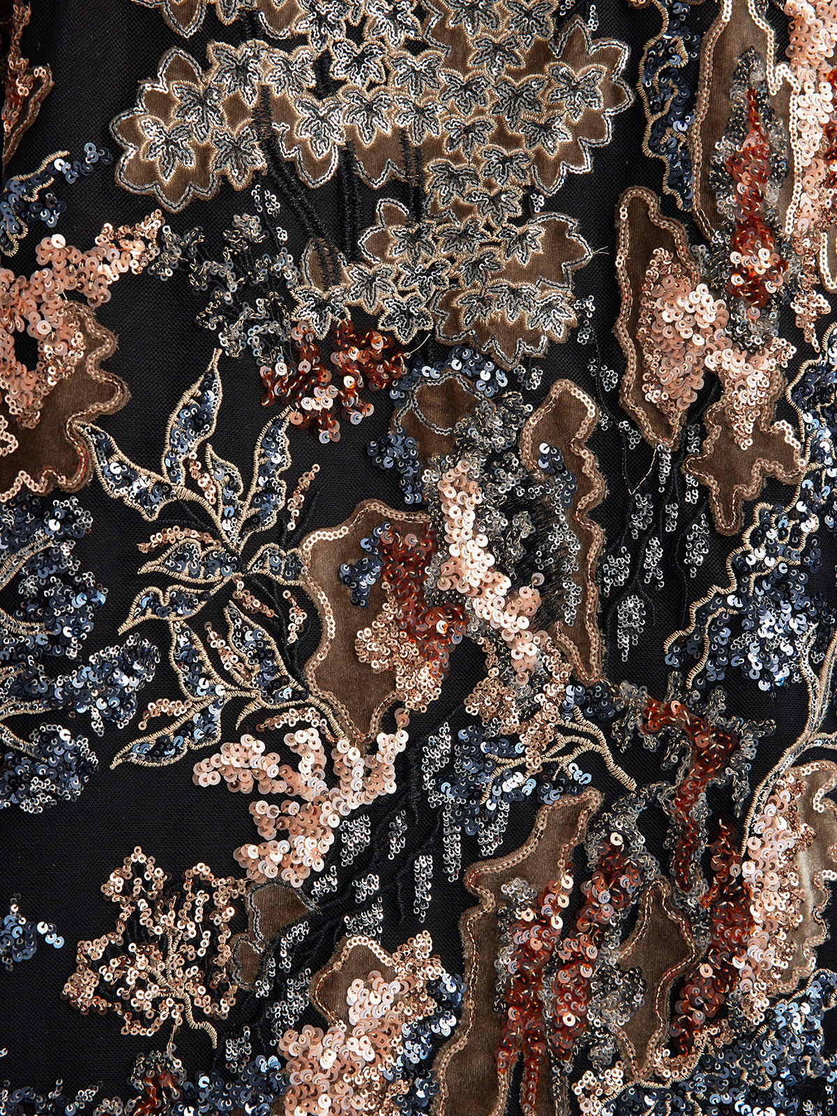 Crafted on airy mesh, this jacket features intricate sequin embroidery forming dimensional vine patterns with gold velvet appliqué for a touch of opulence. The organza tie-neck drape flows gracefully or knots into a bow, while the A-line silhouette offers an effortlessly elegant, lightweight fit.