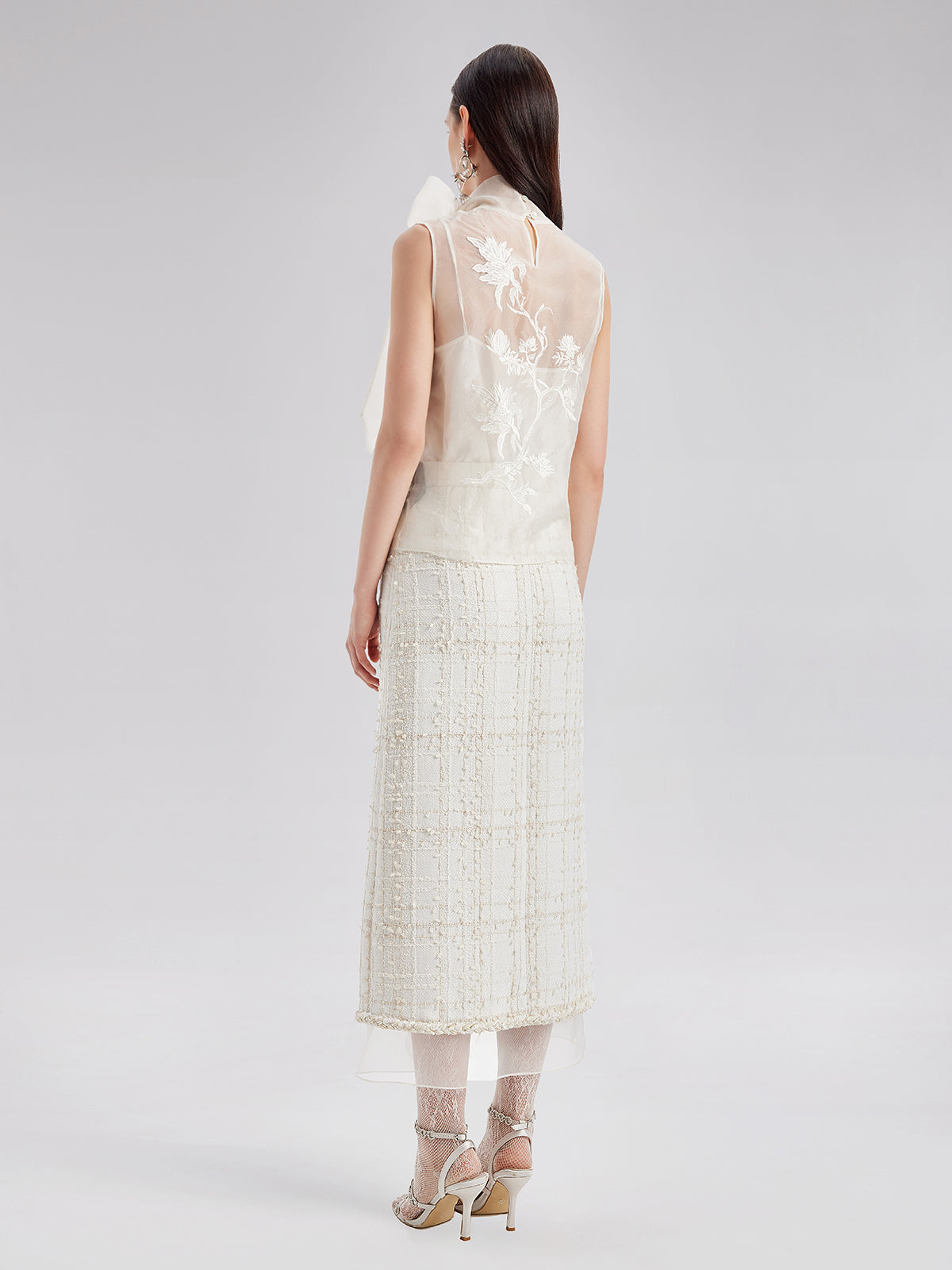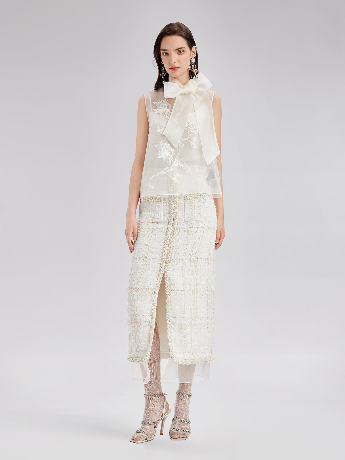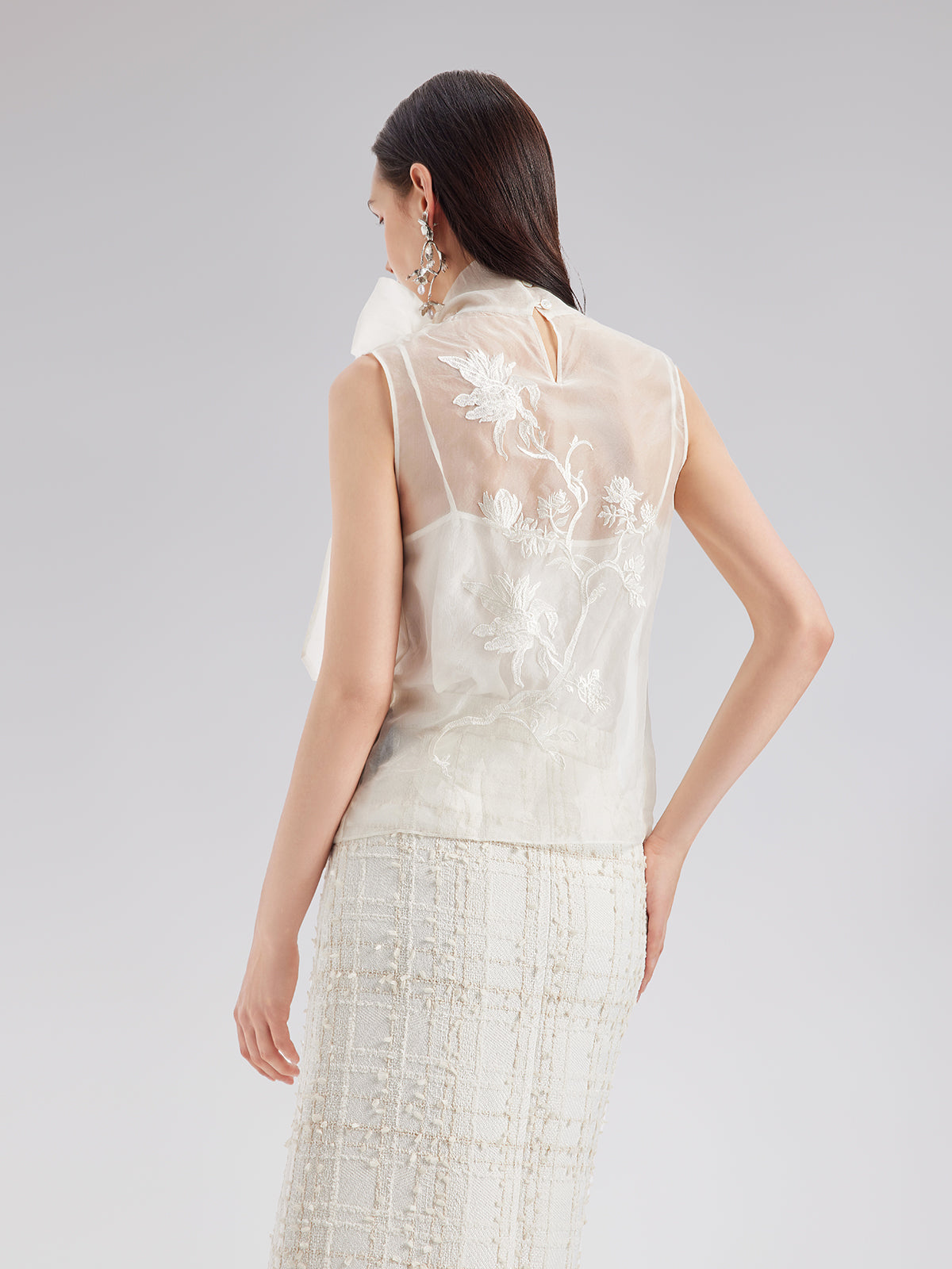 Made from premium mulberry silk, this blouse offers a luxurious feel with a natural sheen. Intricate floral embroidery adds texture and elegance, while the adjustable tie-neck detail creates a romantic touch. The semi-sheer fabric enhances its airy, graceful look. Perfect for both work and formal occasions, it's a versatile piece that pairs effortlessly with trousers or skirts for a refined yet stylish outfit. (Comes with a camisole.)