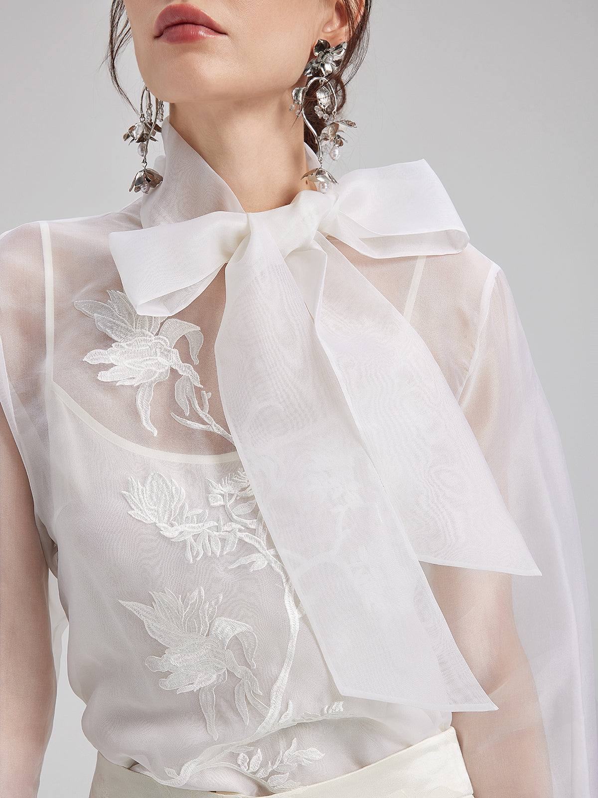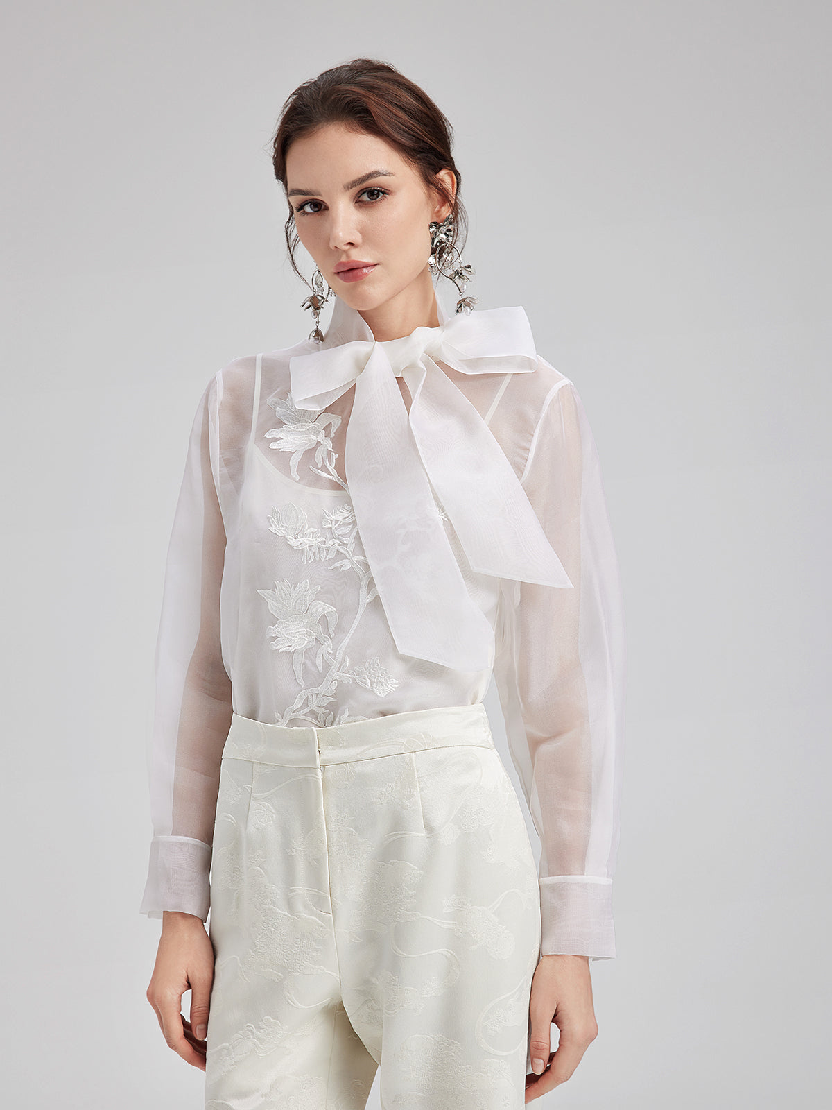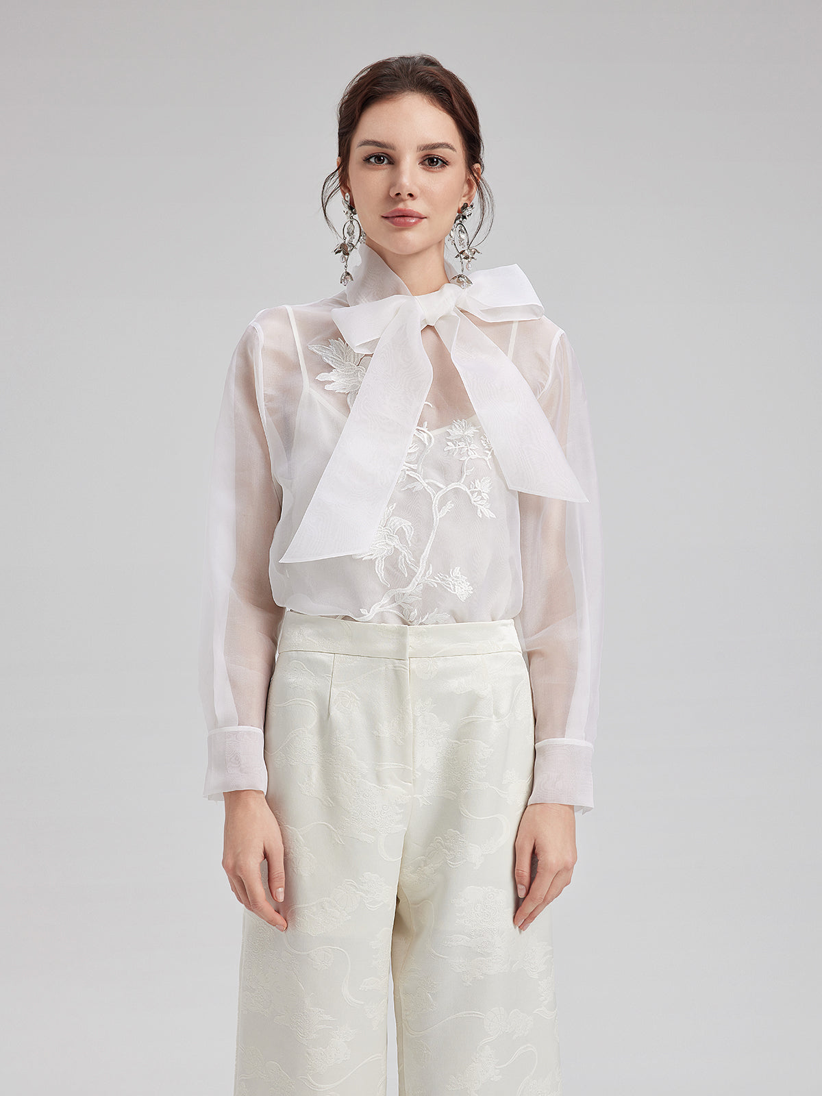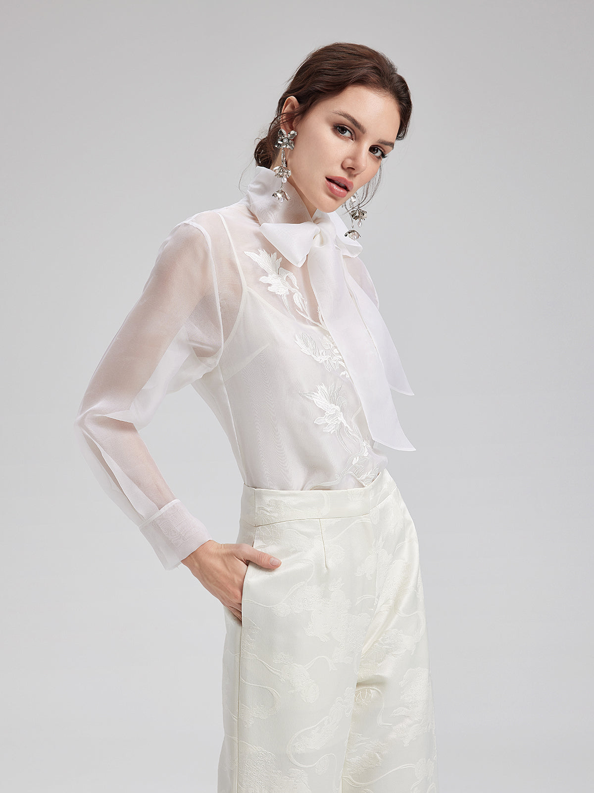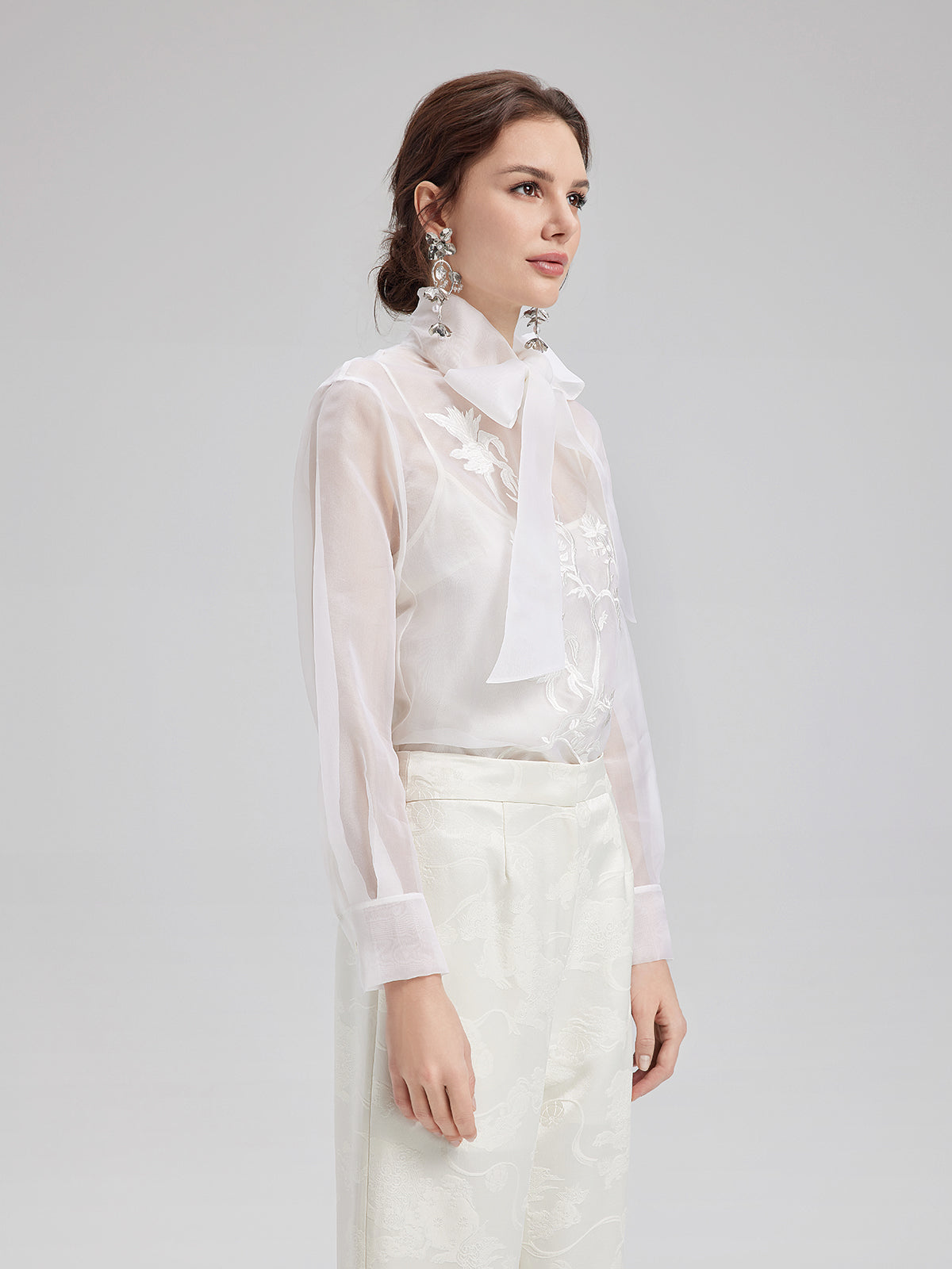 Made from 100% natural silk, this blouse features delicate floral embroidery, a sheer design, and a playful bow tie at the neck. The elegant white tone is perfect for both formal and casual occasions.