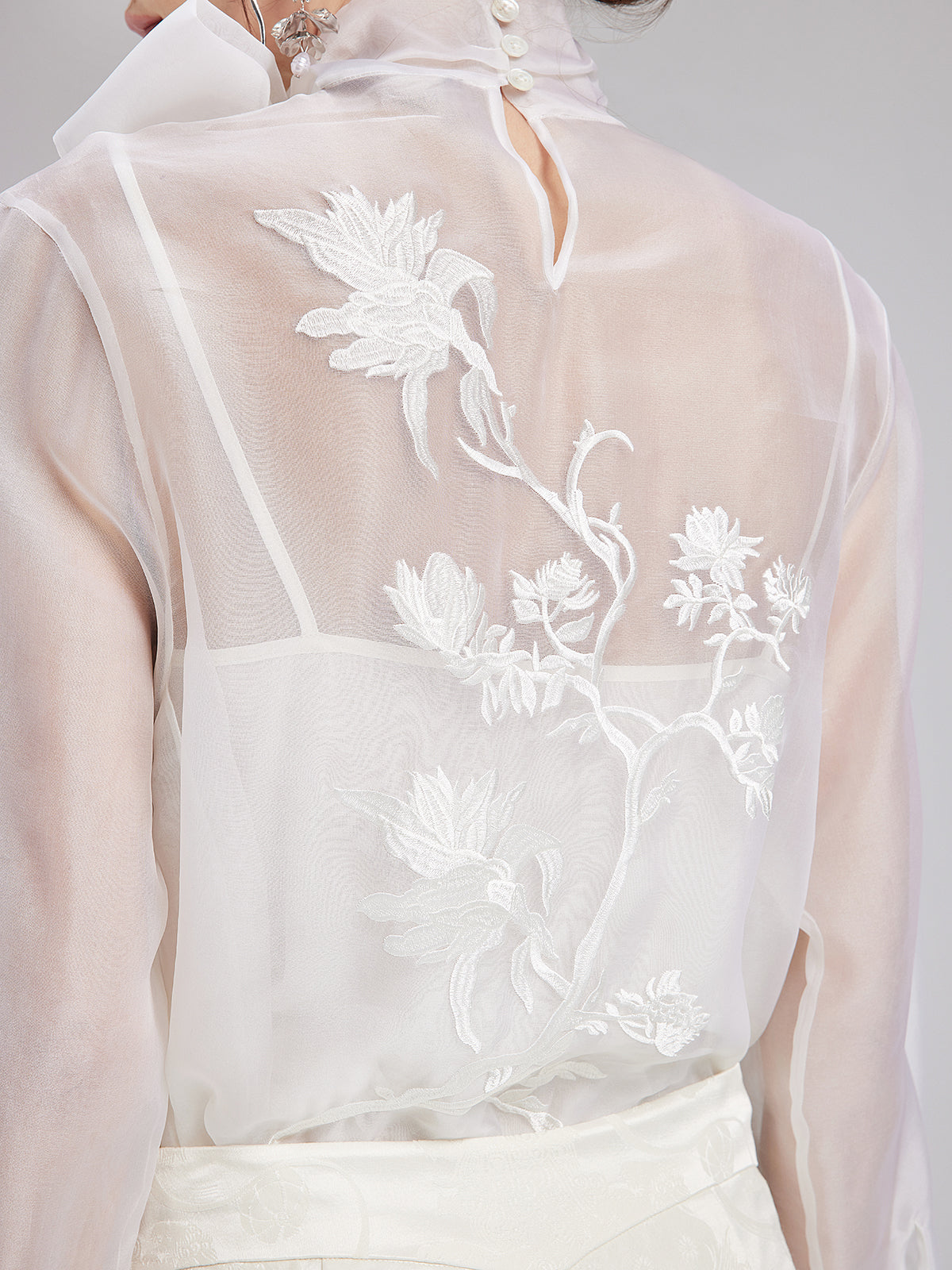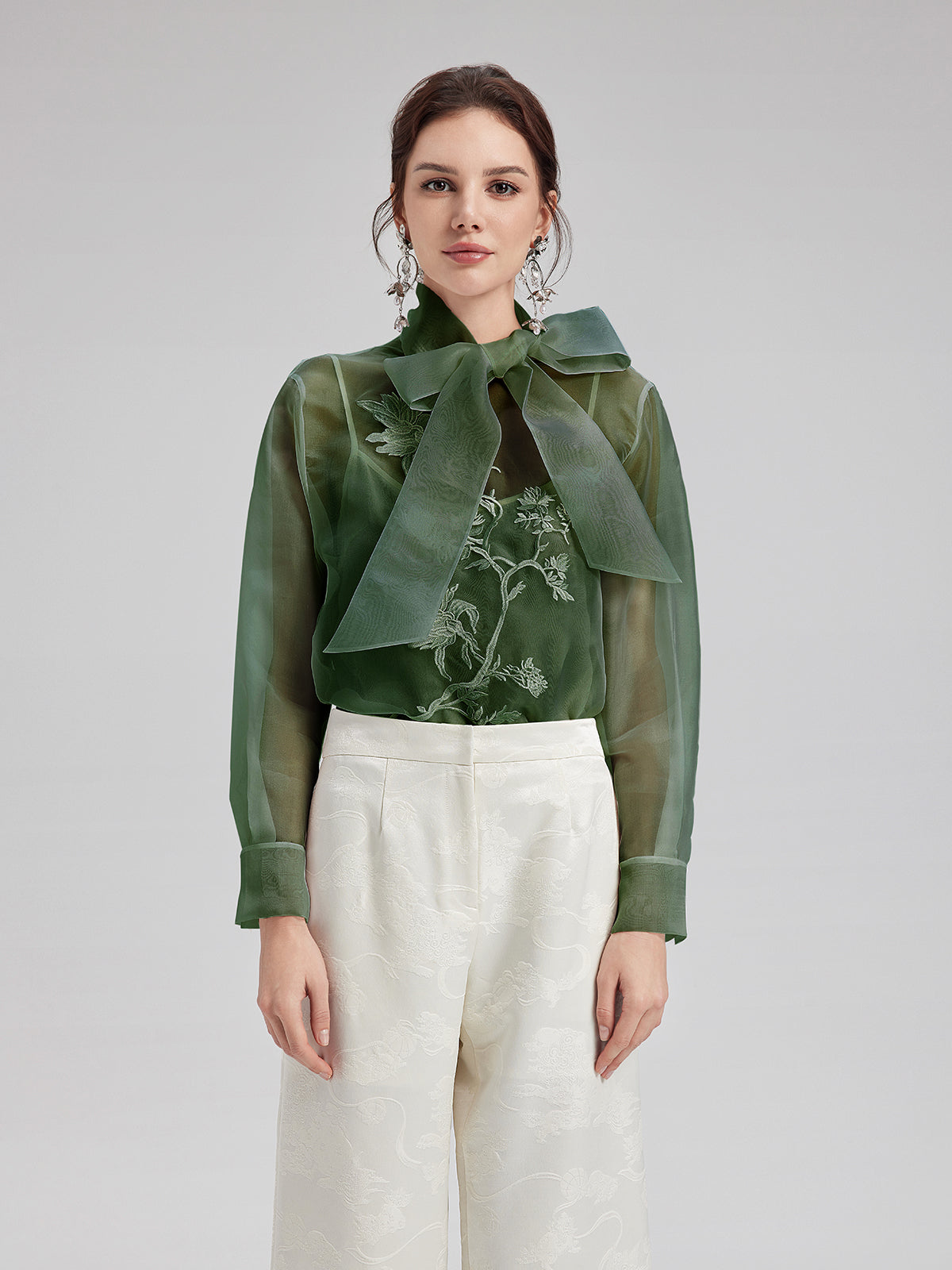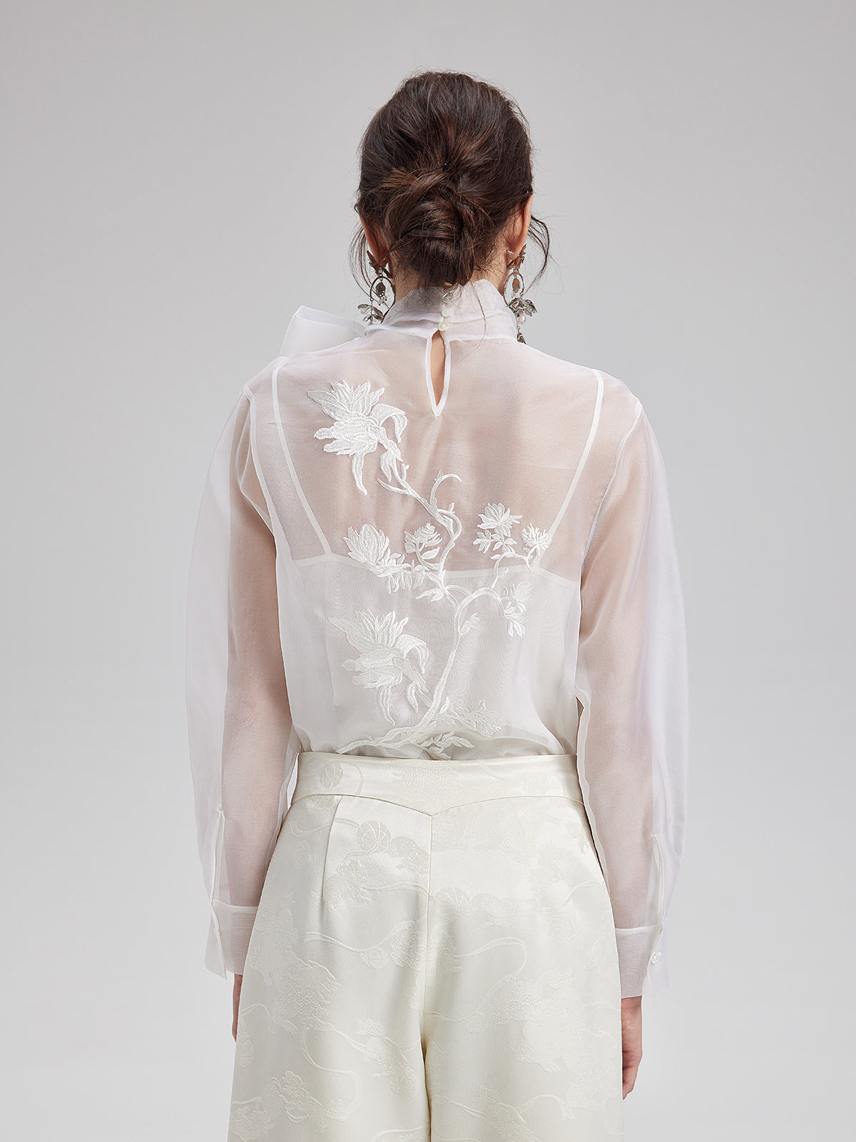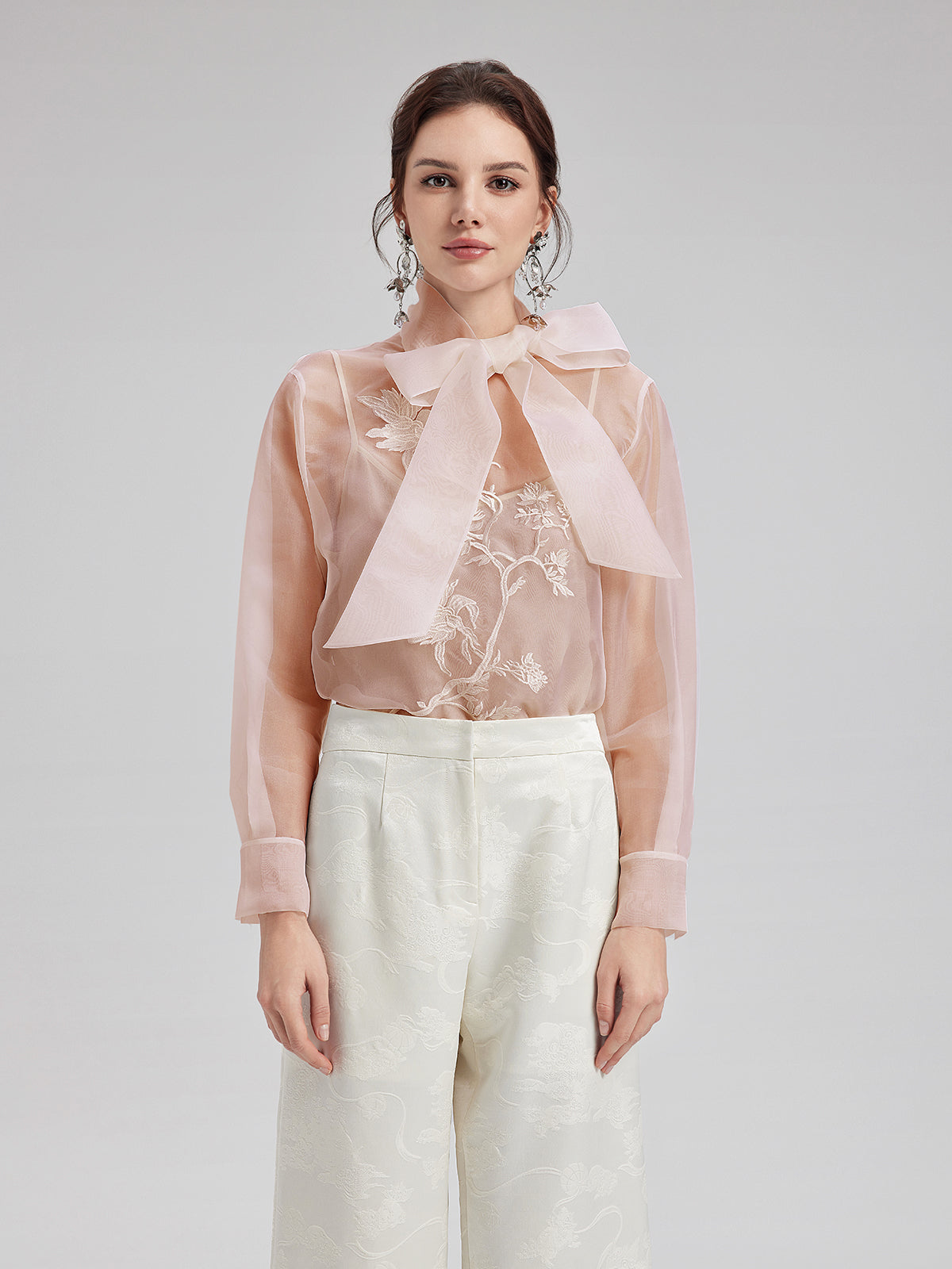 Made from 100% natural silk, this blouse features delicate floral embroidery, a sheer design, and a playful bow tie at the neck. The elegant white tone is perfect for both formal and casual occasions.
