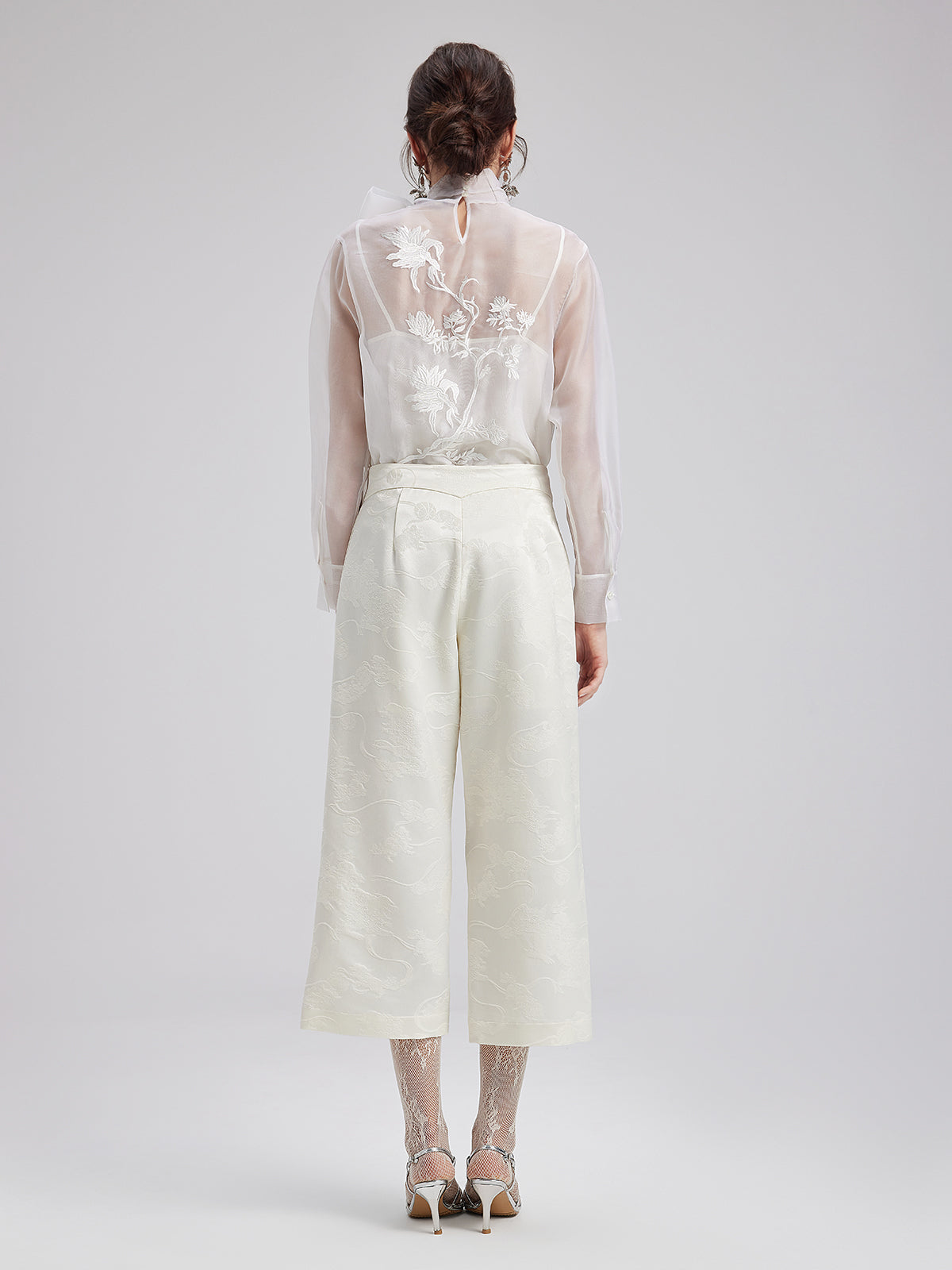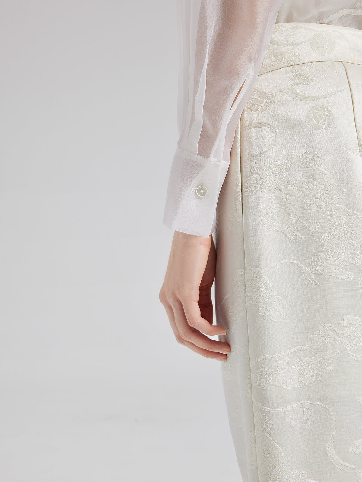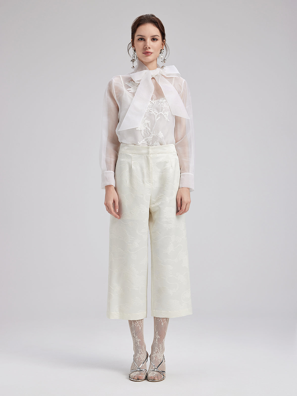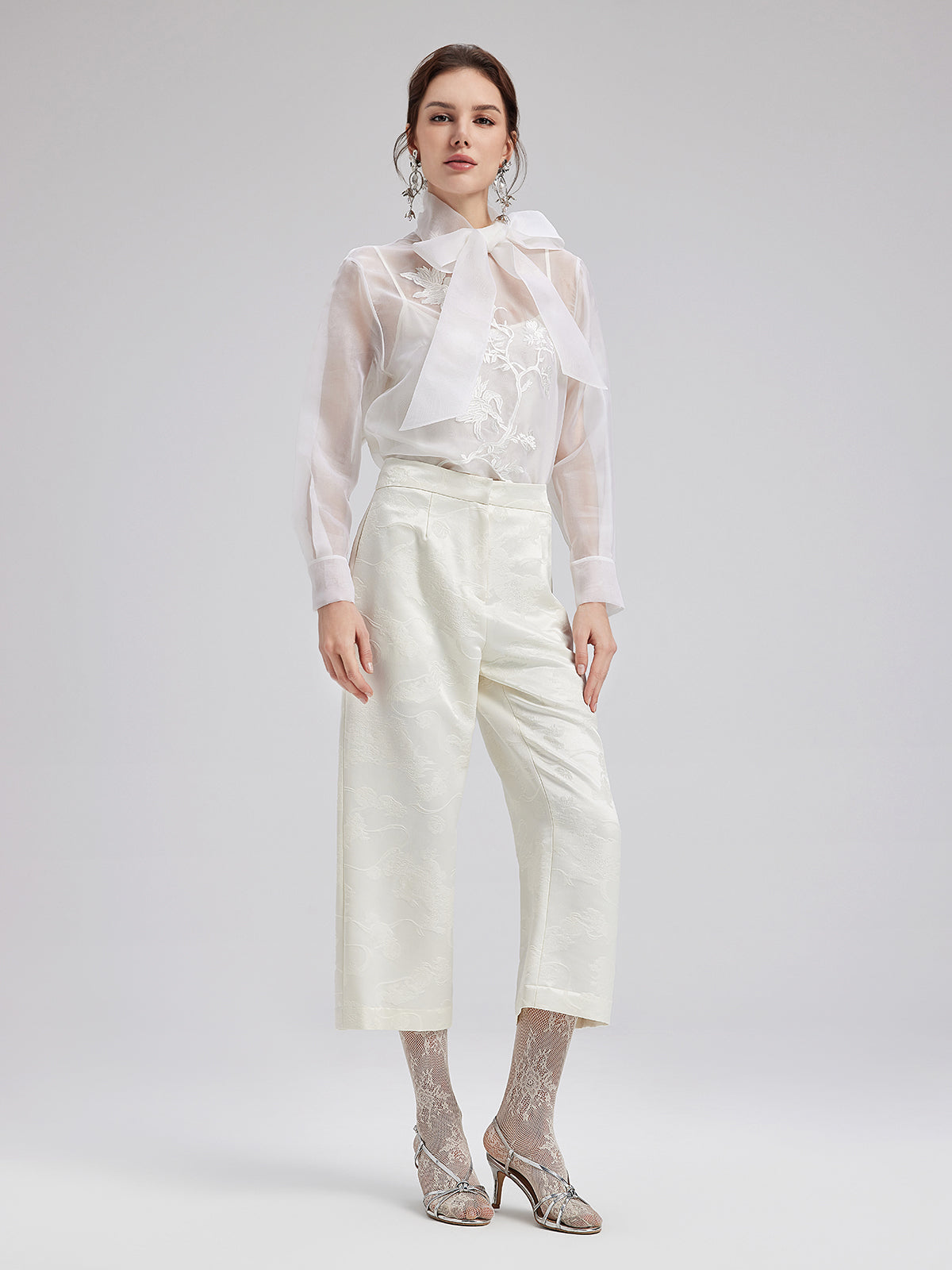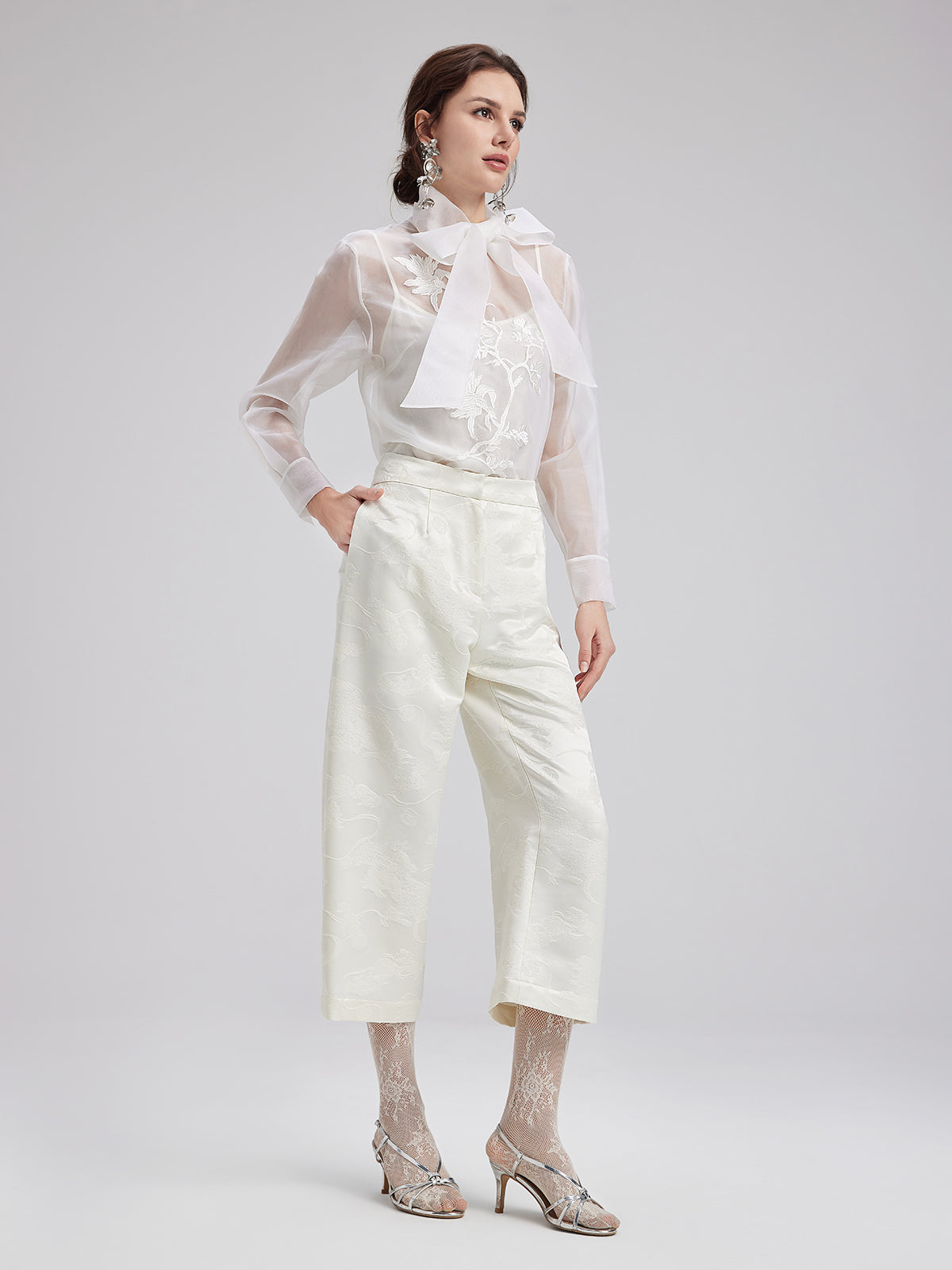 Made from 100% natural silk, this blouse features delicate floral embroidery, a sheer design, and a playful bow tie at the neck. The elegant white tone is perfect for both formal and casual occasions.