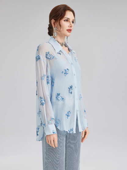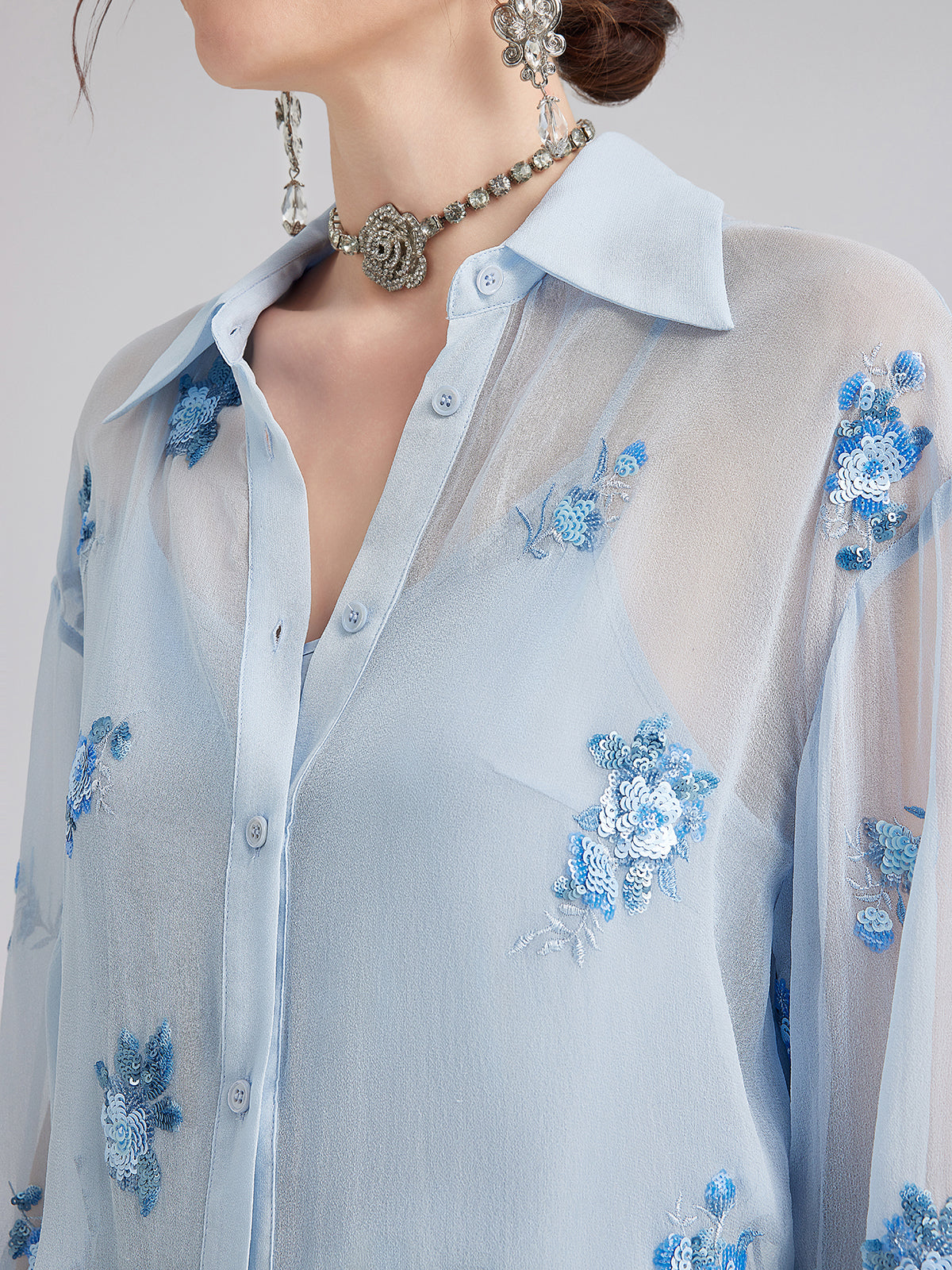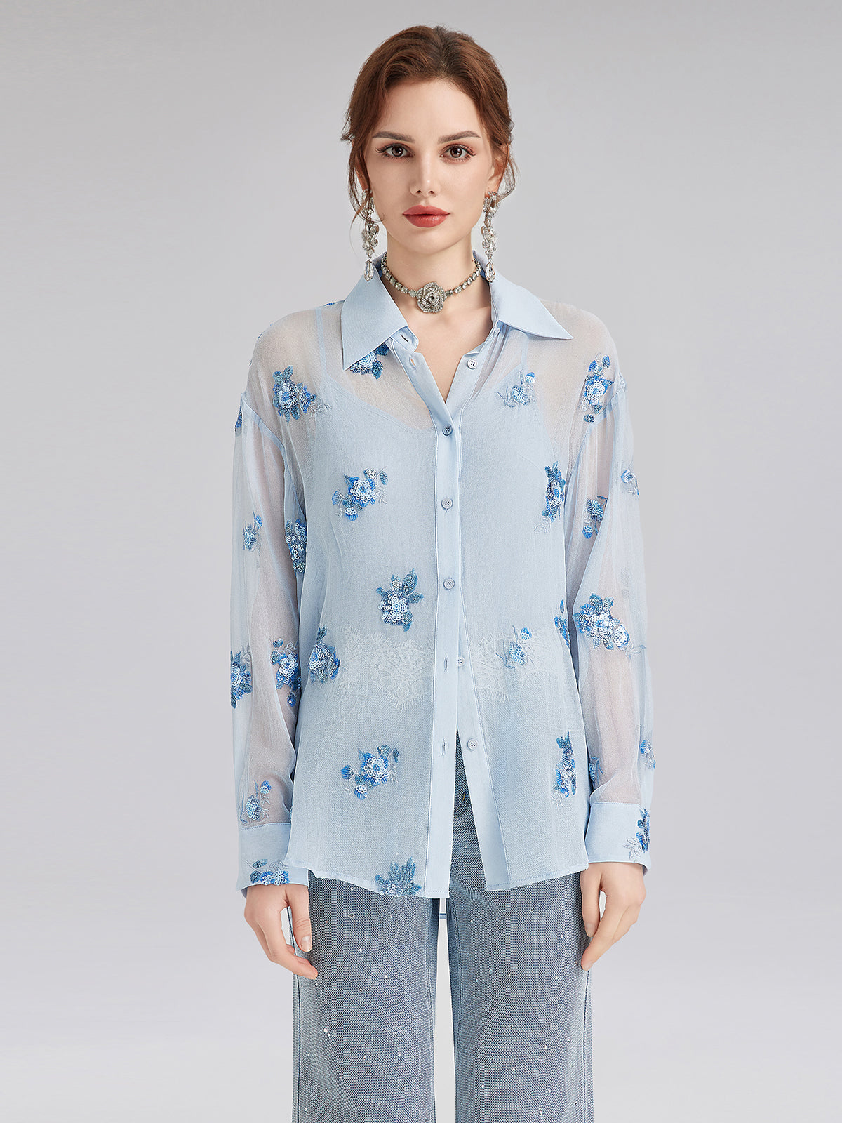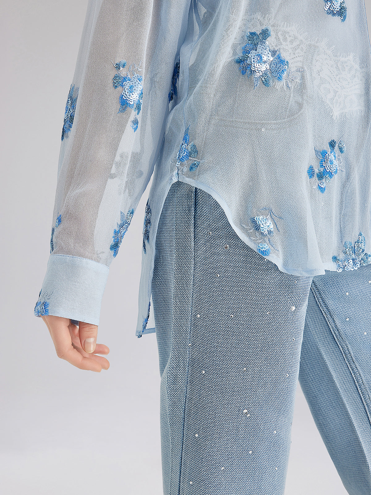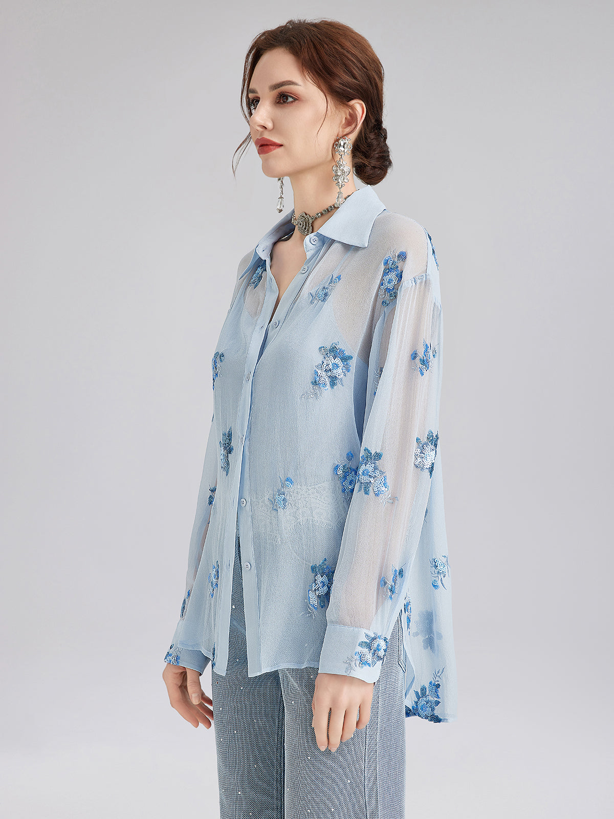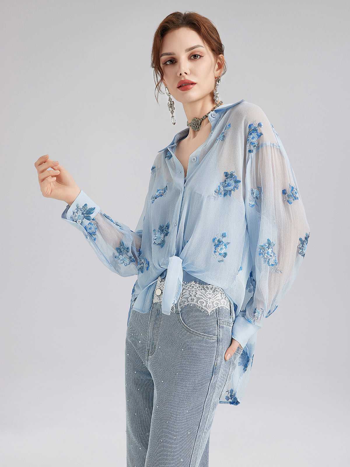 The shirt features blue and grey floral sequin embroidery, adding an artistic touch with layered colors. Made from lightweight, breathable silk, it's perfect for spring and summer, offering cool comfort. The combination of silk and embroidery reflects exquisite craftsmanship. (Includes inner camisole.)