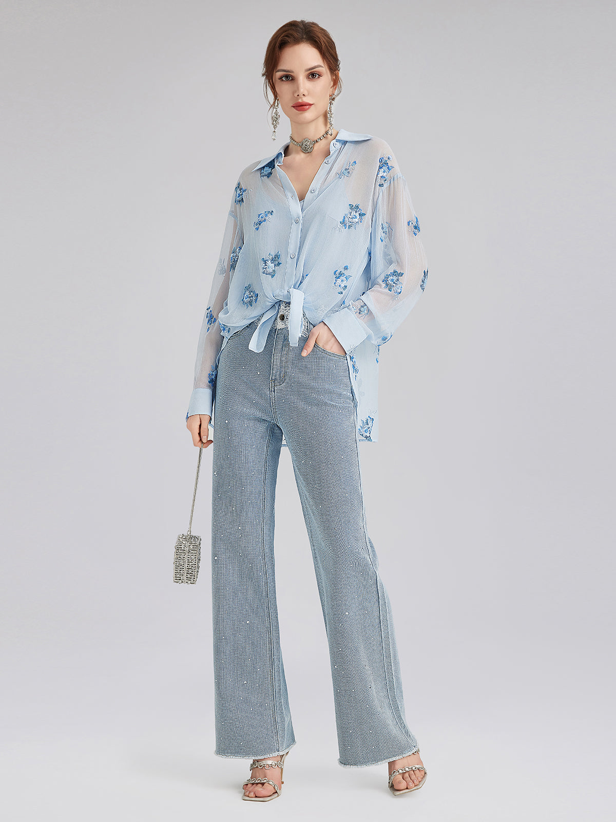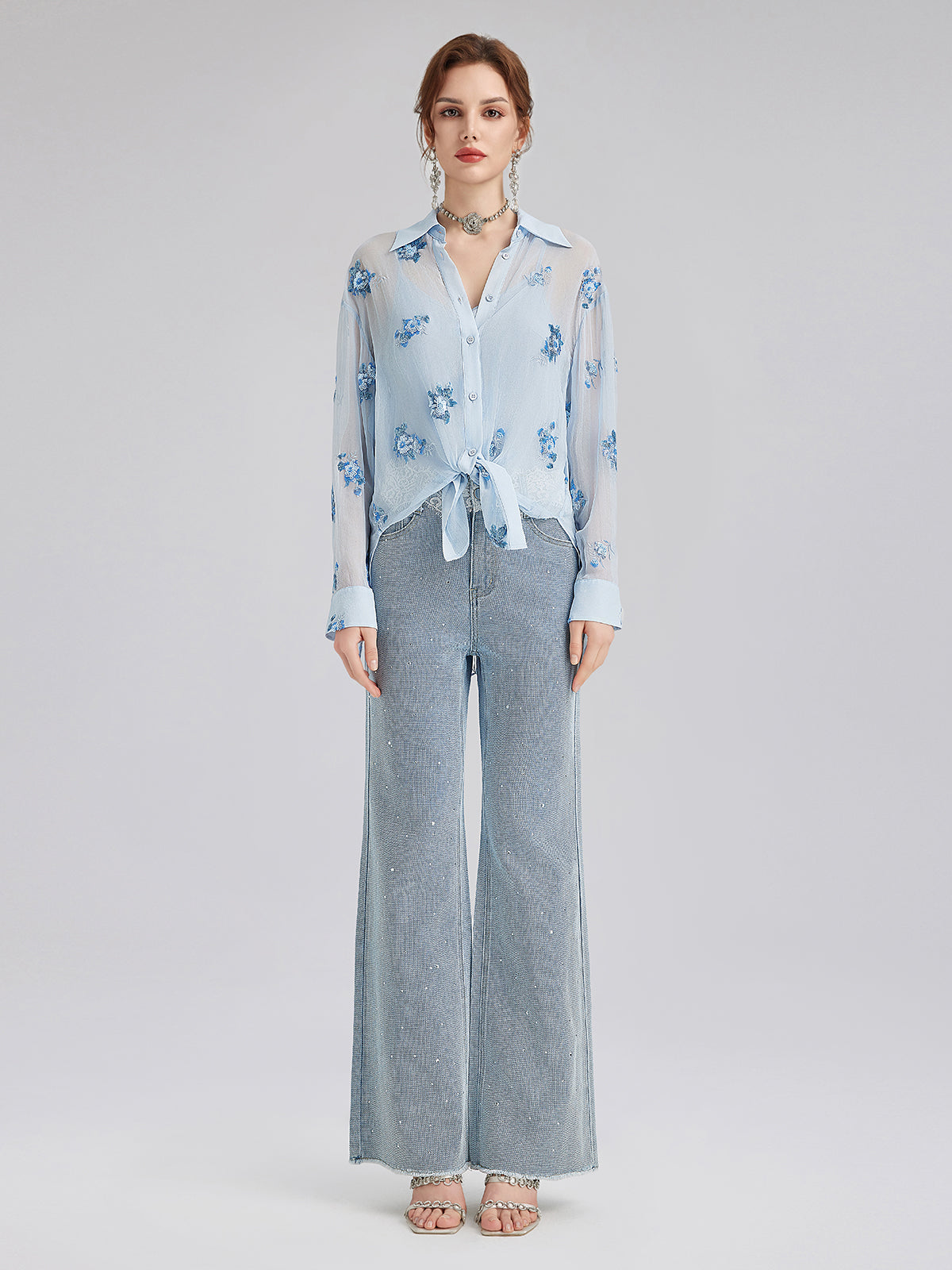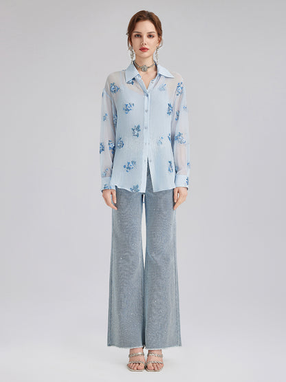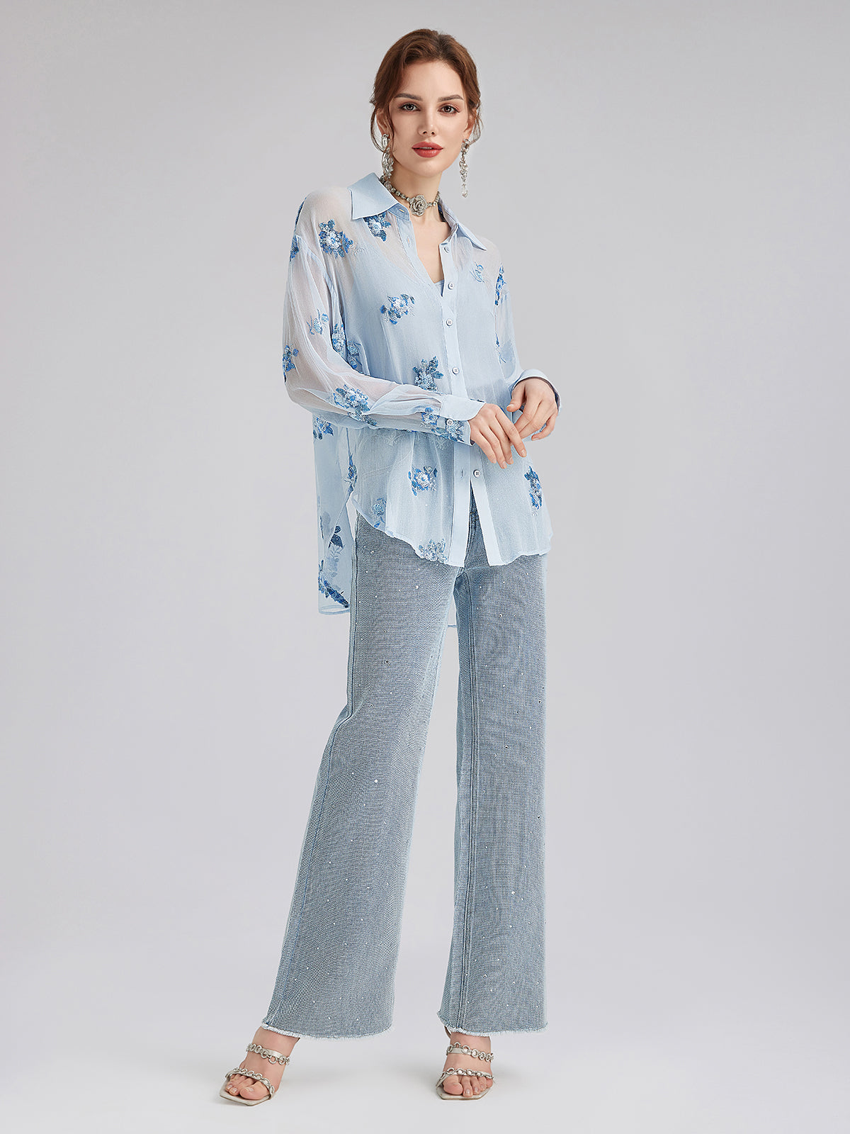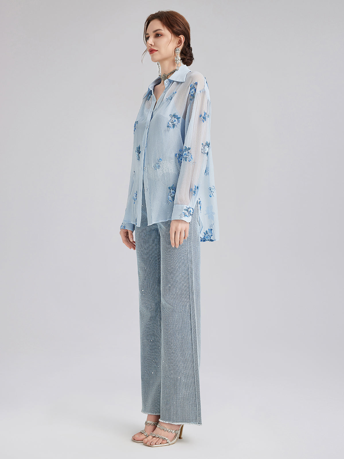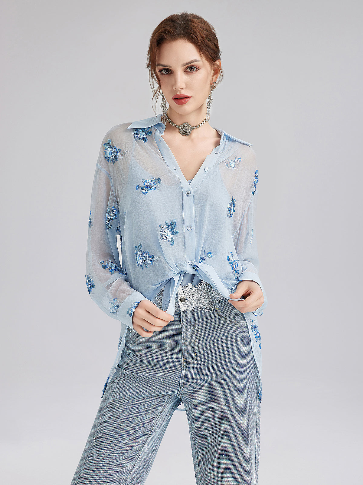 The shirt features blue and grey floral sequin embroidery, adding an artistic touch with layered colors. Made from lightweight, breathable silk, it's perfect for spring and summer, offering cool comfort. The combination of silk and embroidery reflects exquisite craftsmanship. (Includes inner camisole.)