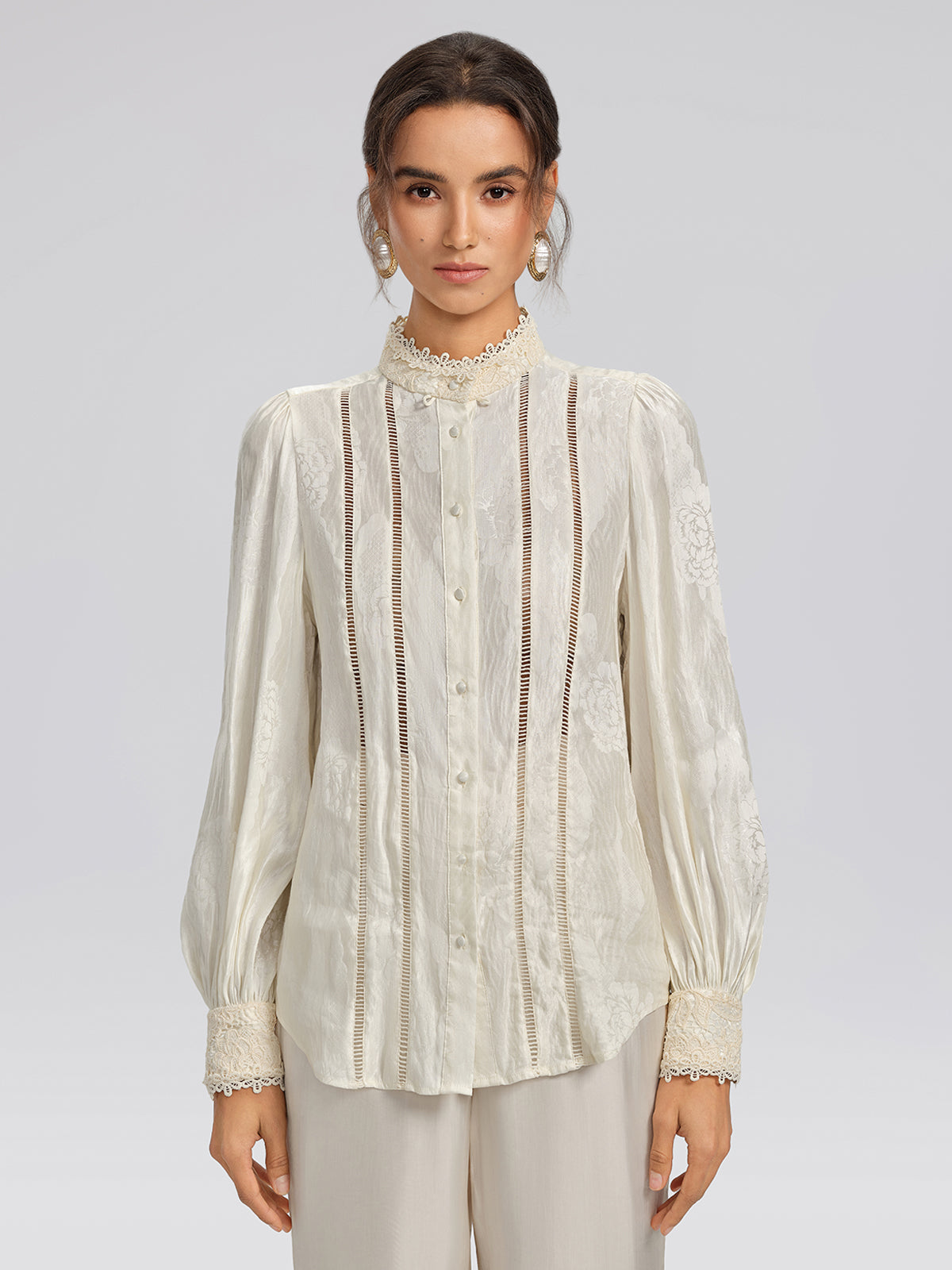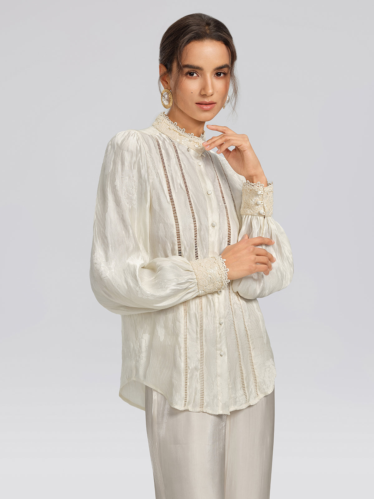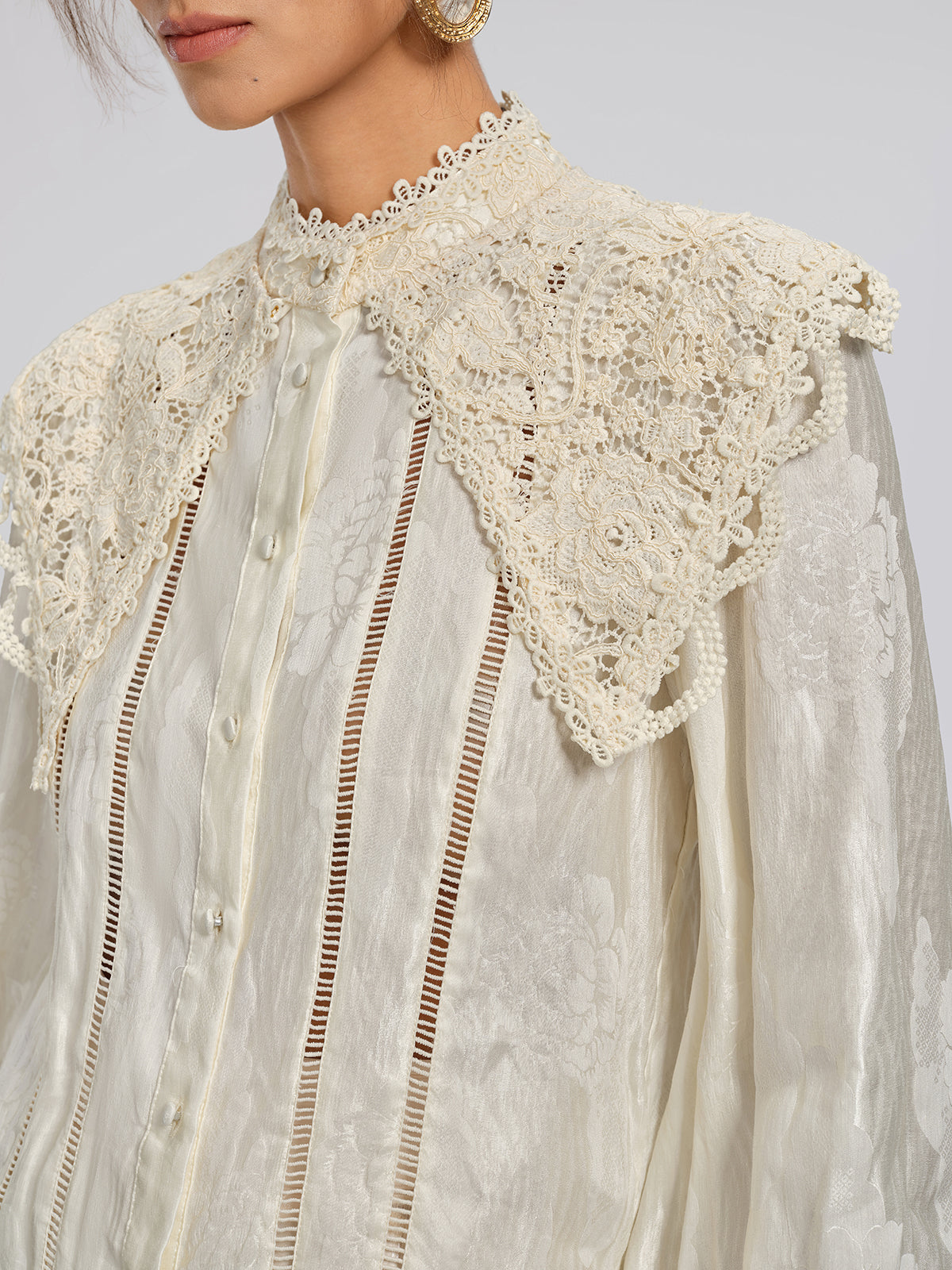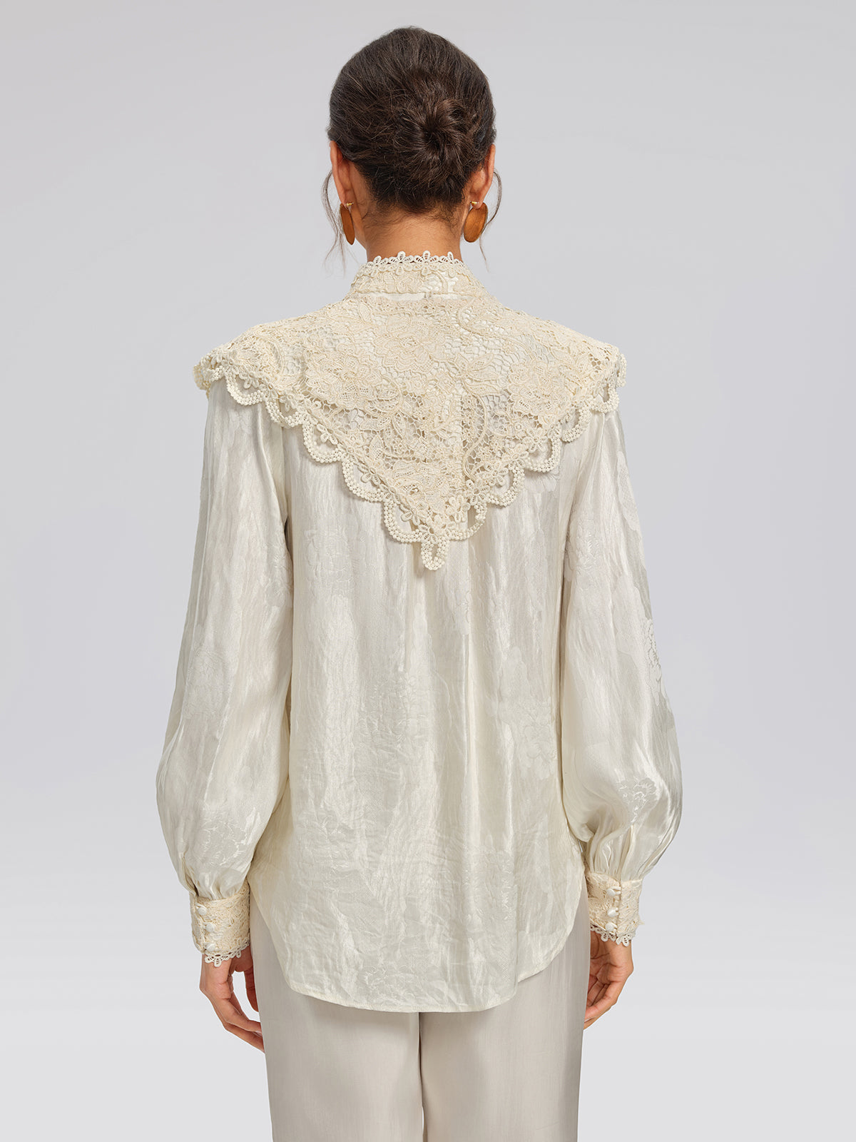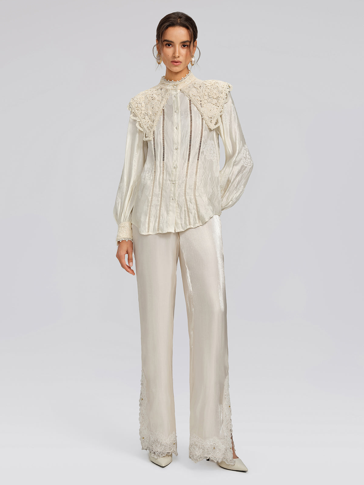 Crafted from custom silk-linen jacquard with a subtle sheen, this blouse features discreet woven patterns that enhance texture. Cutwork embroidery adds layered depth. A detachable lace collar allows two distinct styling options, shifting effortlessly between refined elegance and relaxed sophistication.