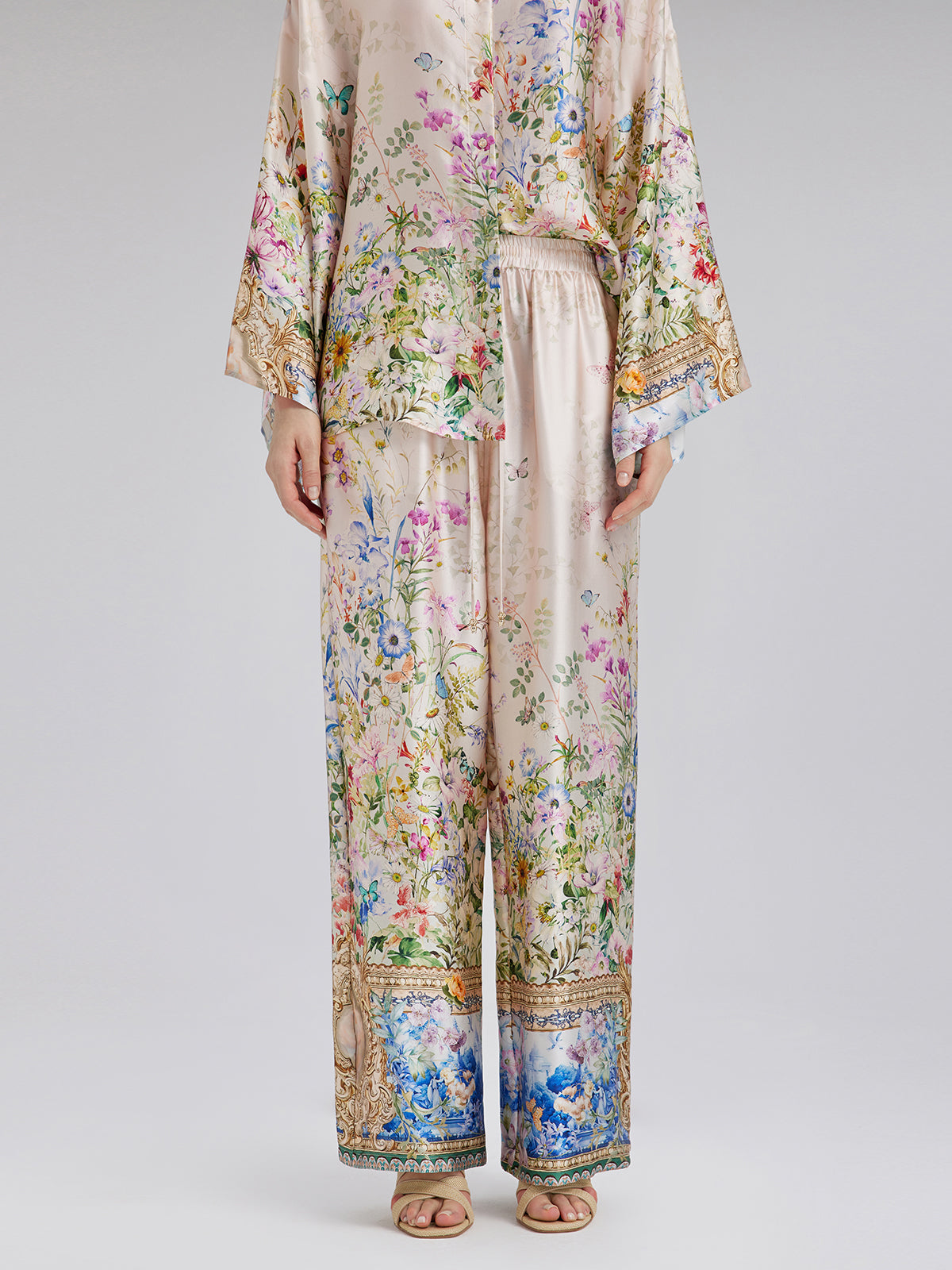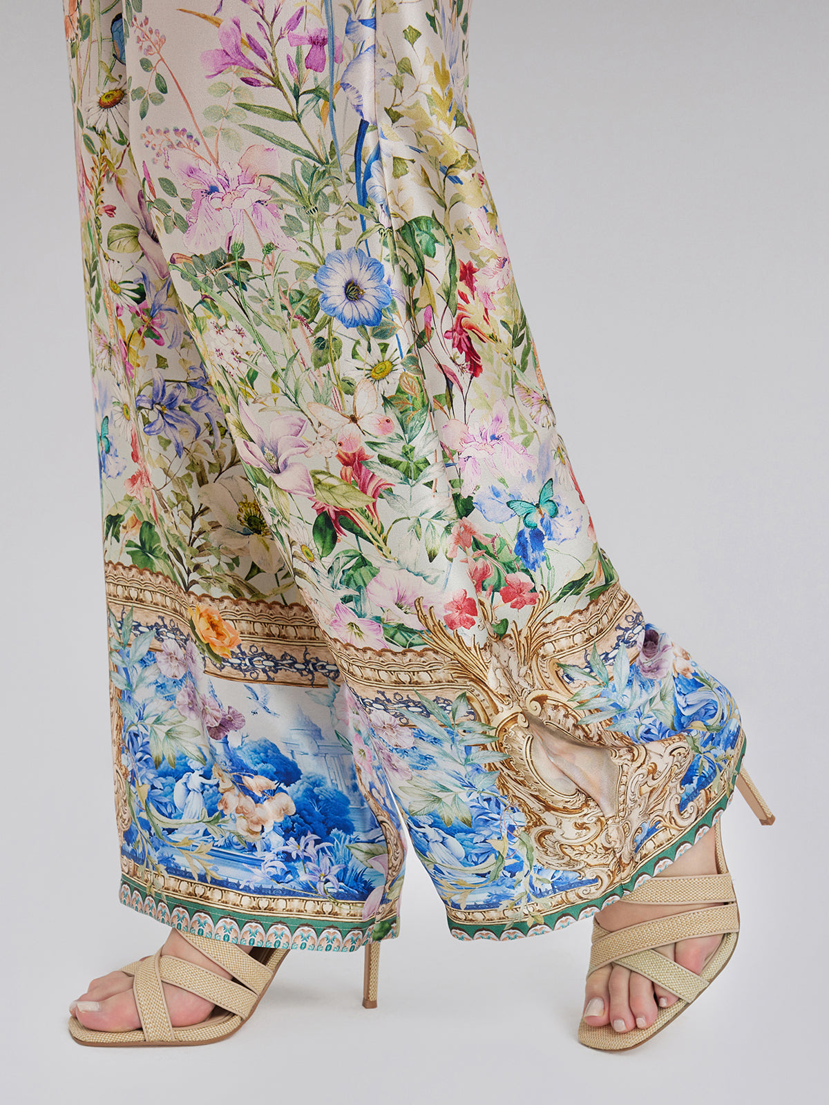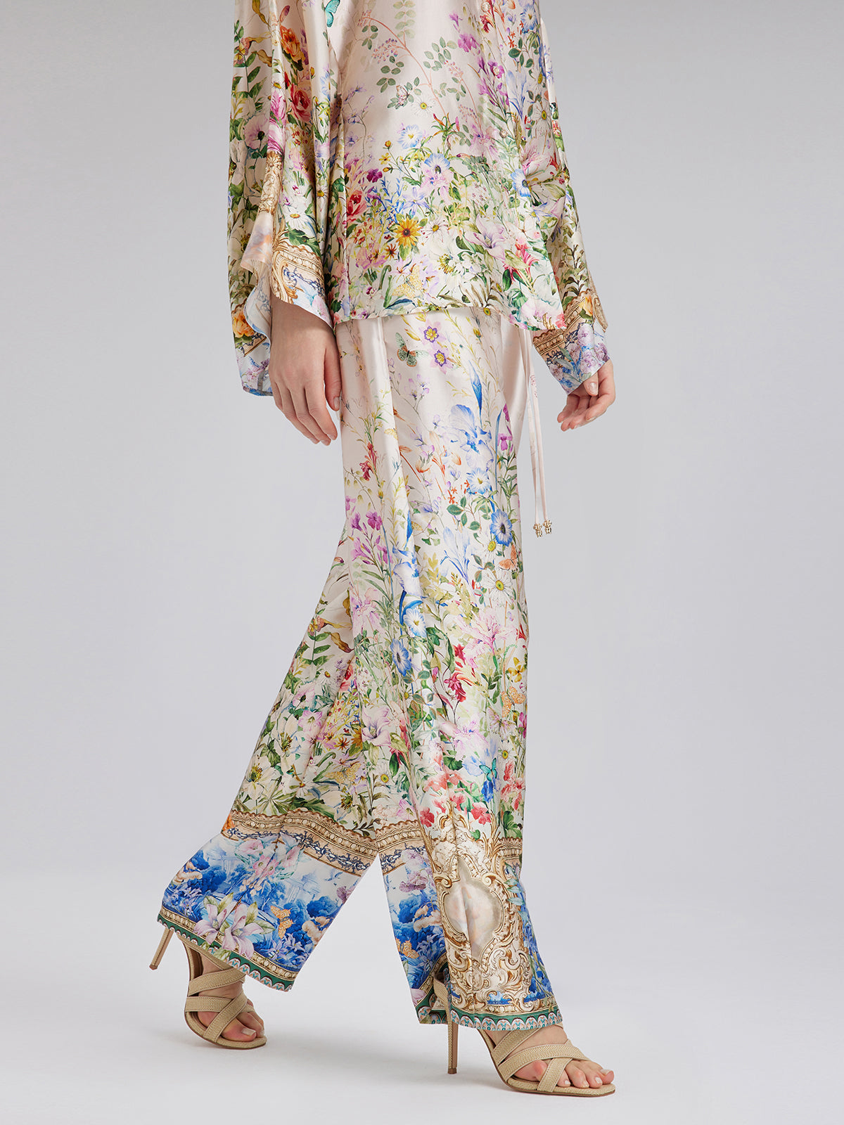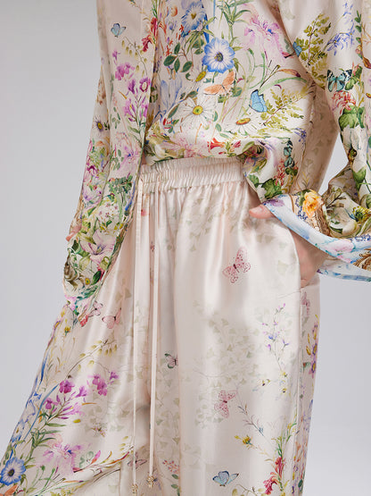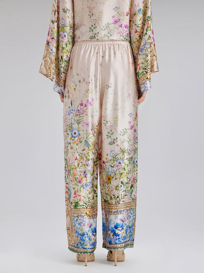 Made from 100% silk satin, these pants feature floral prints with a hand-painted look, showcasing rich colors and layered depth. Precision-cut flowers are tailored for a custom fit. The relaxed straight-leg silhouette flatters the legs, while the elastic waistband offers comfort and fit. Side pockets add practical style.