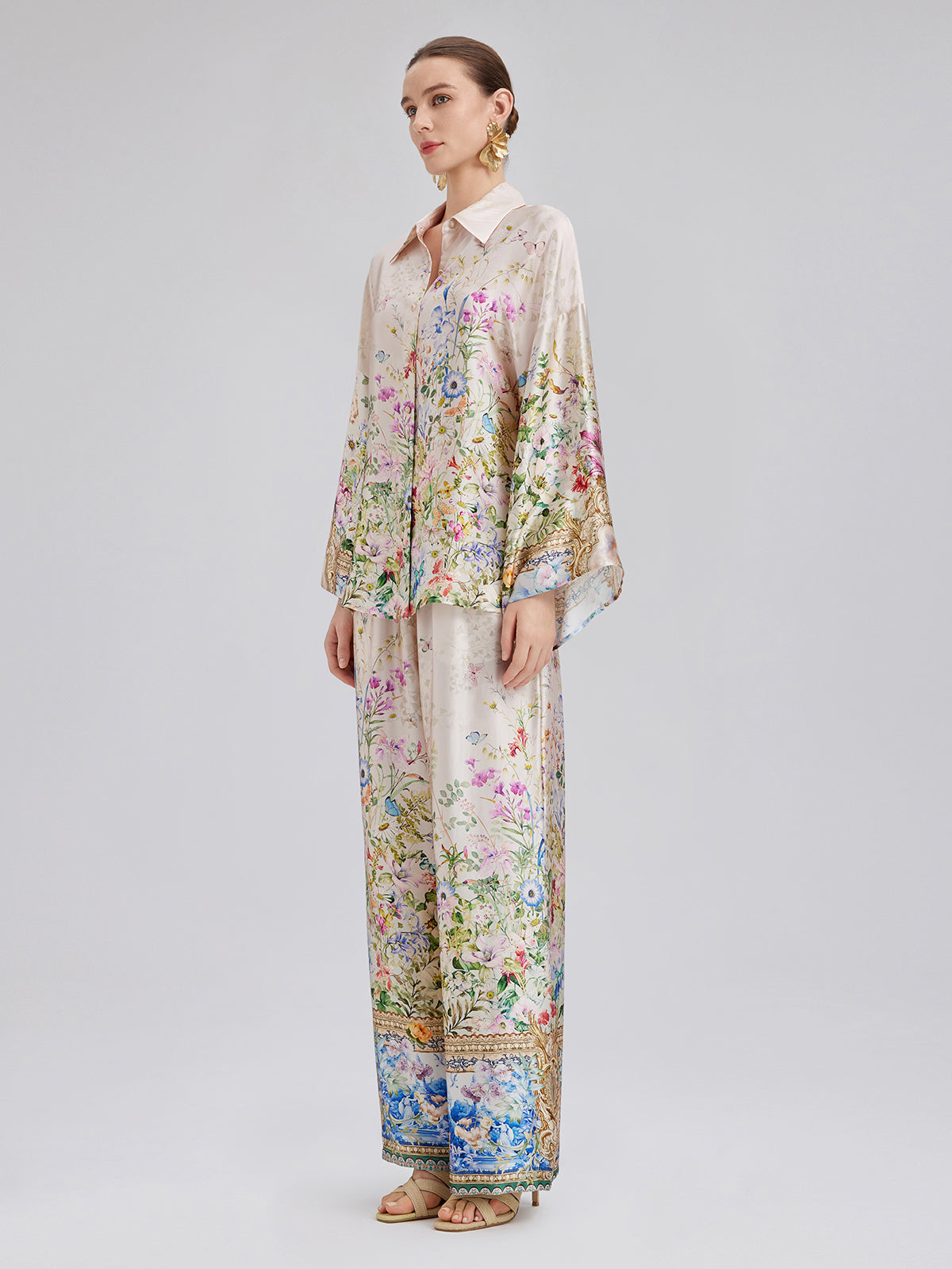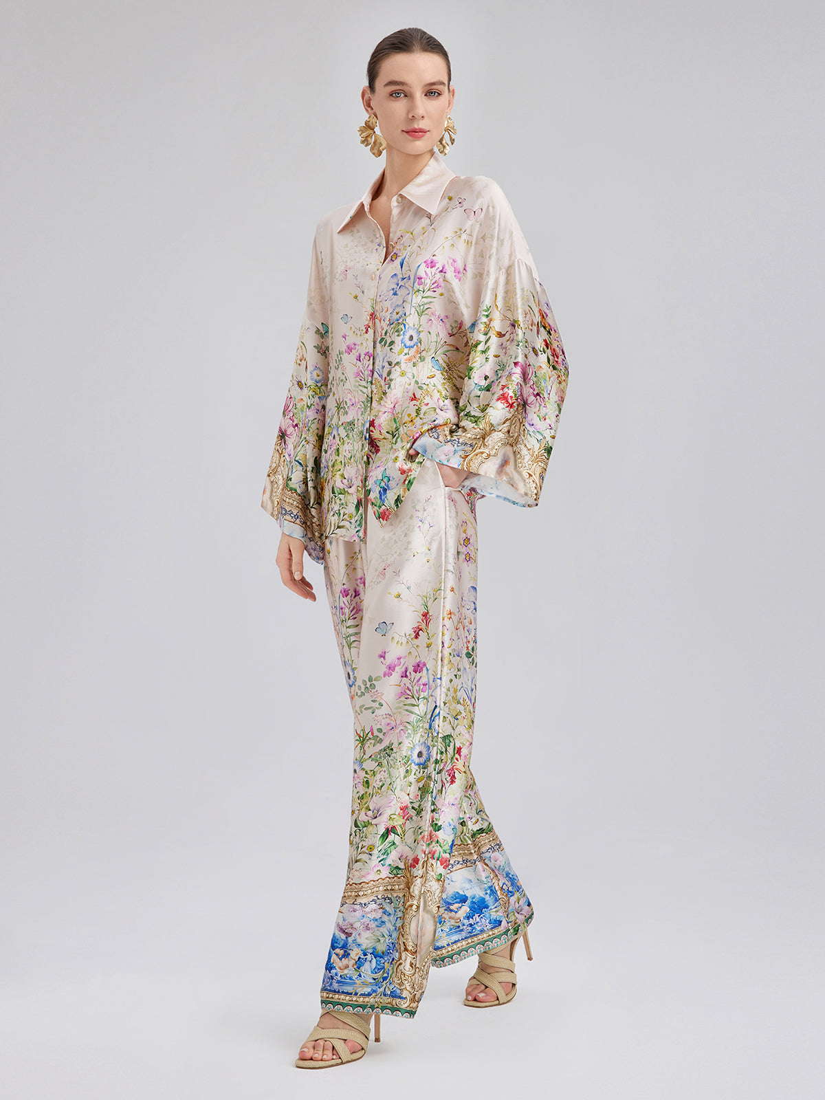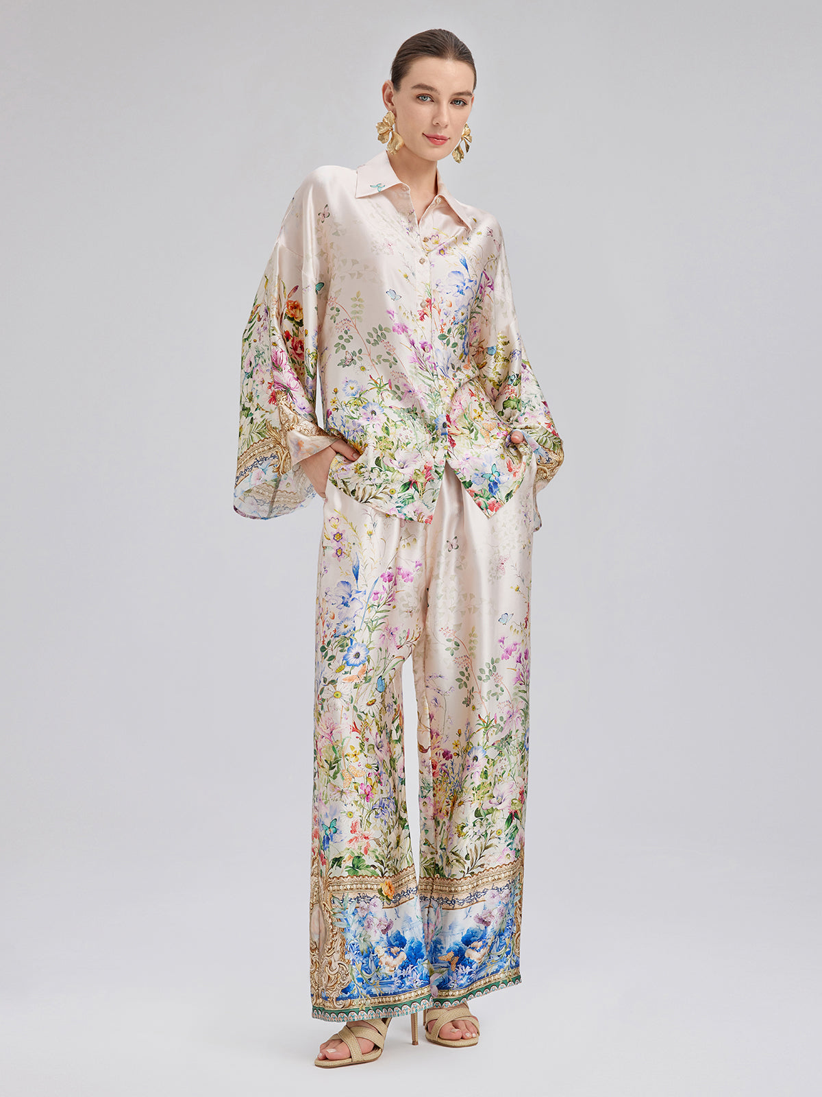 Made from 100% silk satin, these pants feature floral prints with a hand-painted look, showcasing rich colors and layered depth. Precision-cut flowers are tailored for a custom fit. The relaxed straight-leg silhouette flatters the legs, while the elastic waistband offers comfort and fit. Side pockets add practical style.