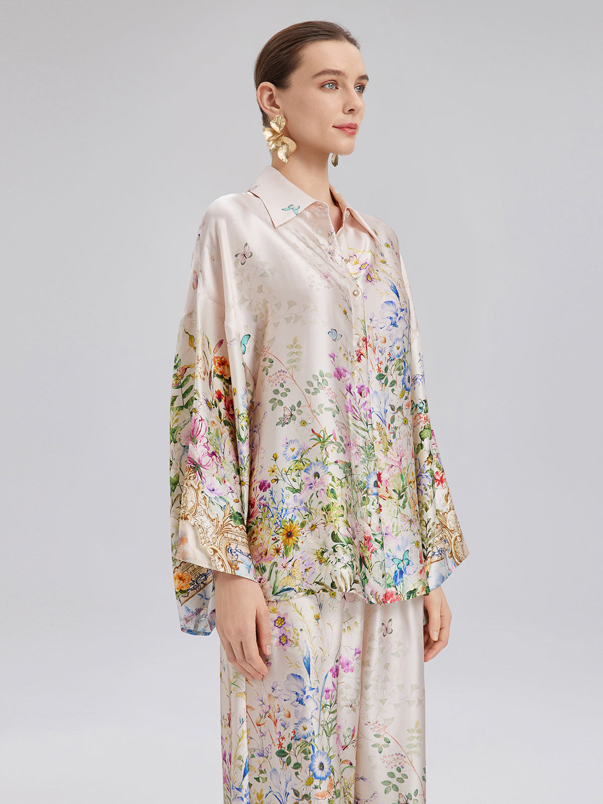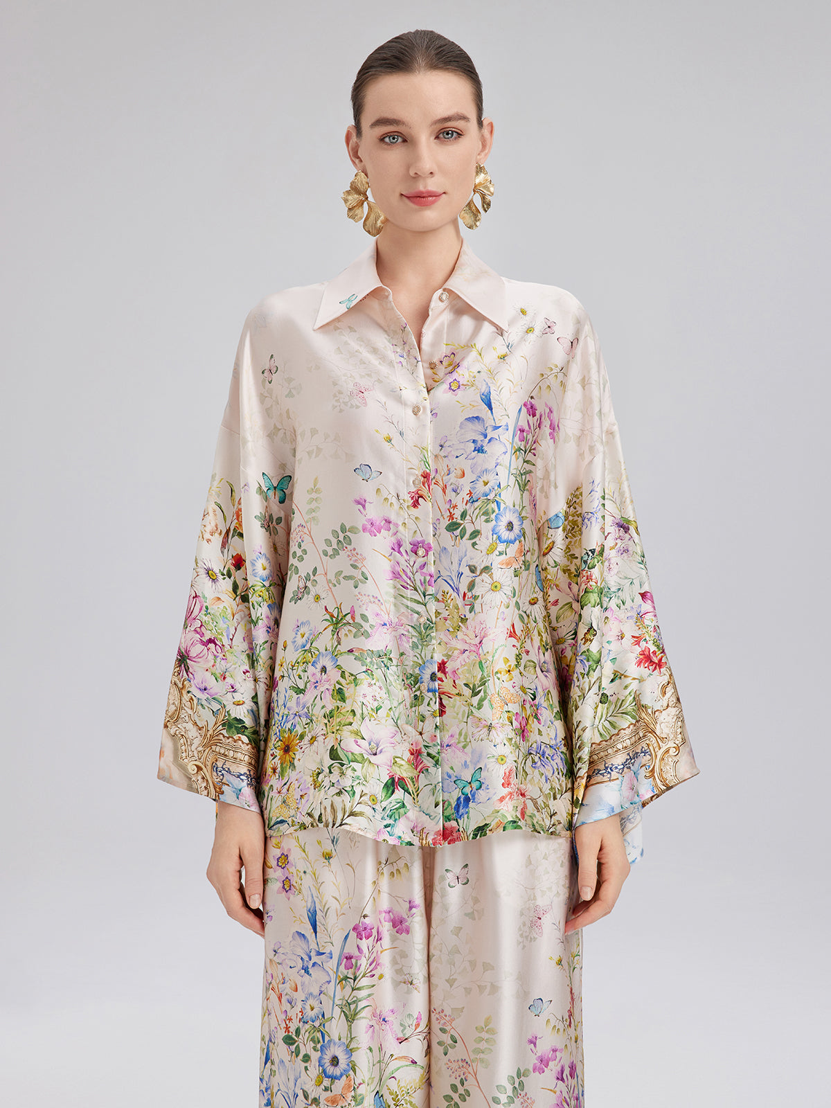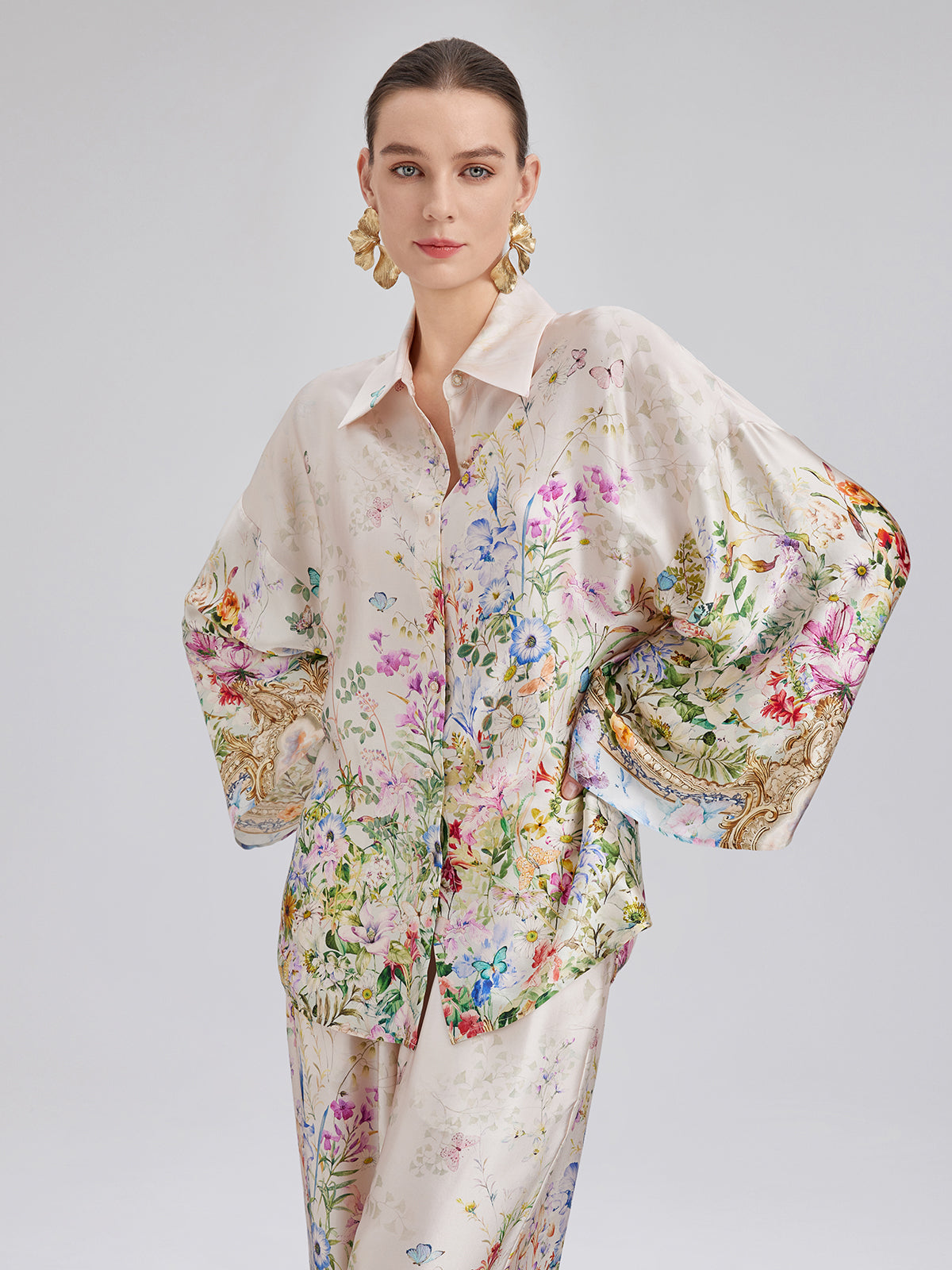 Made from 100% silk satin, this shirt offers a silky-smooth touch and understated luxury. Featuring floral prints with a hand-painted look, each flower is precisely positioned using advanced cutting techniques. The relaxed fit and slight bell sleeves flatter the figure effortlessly.