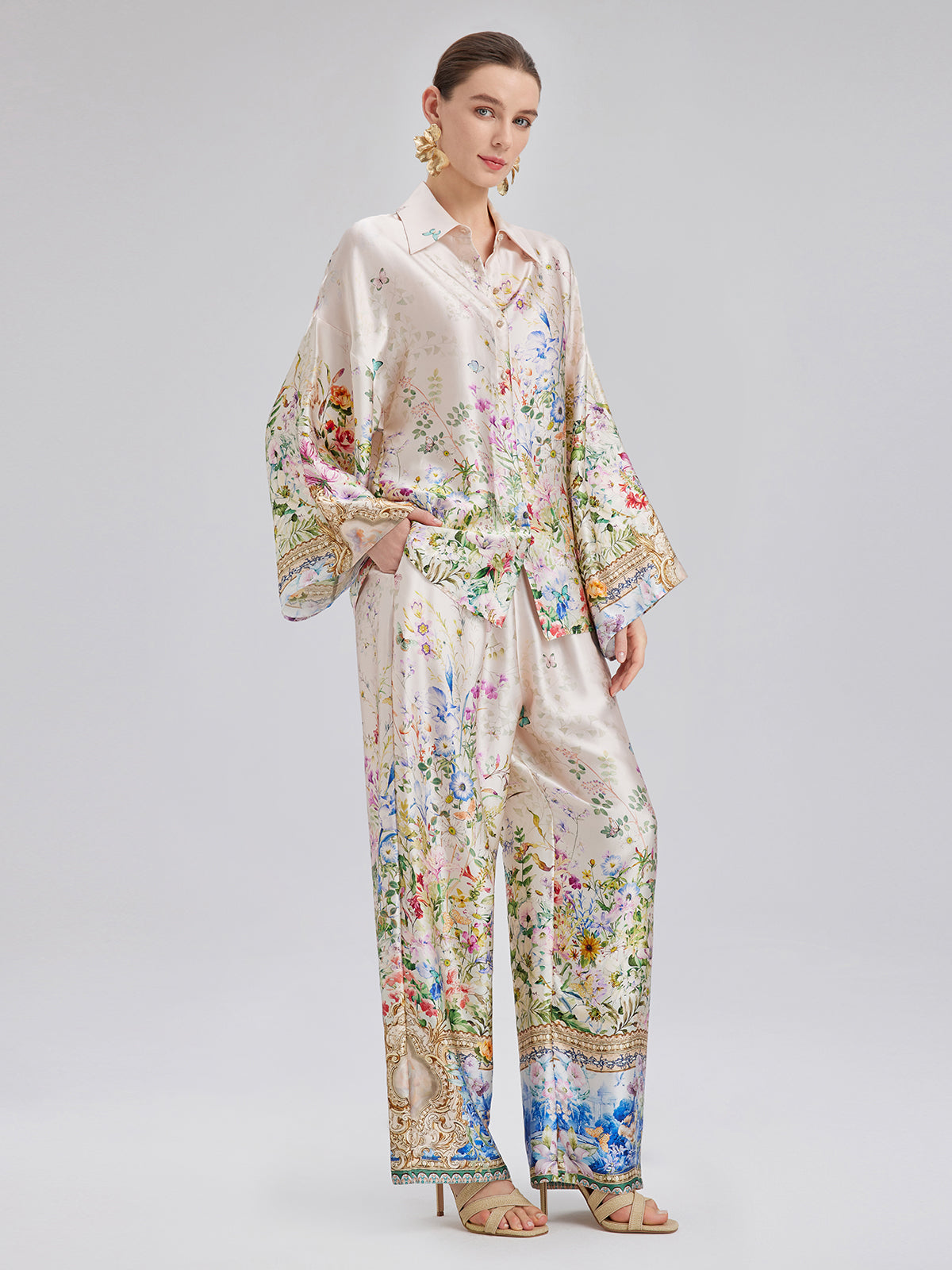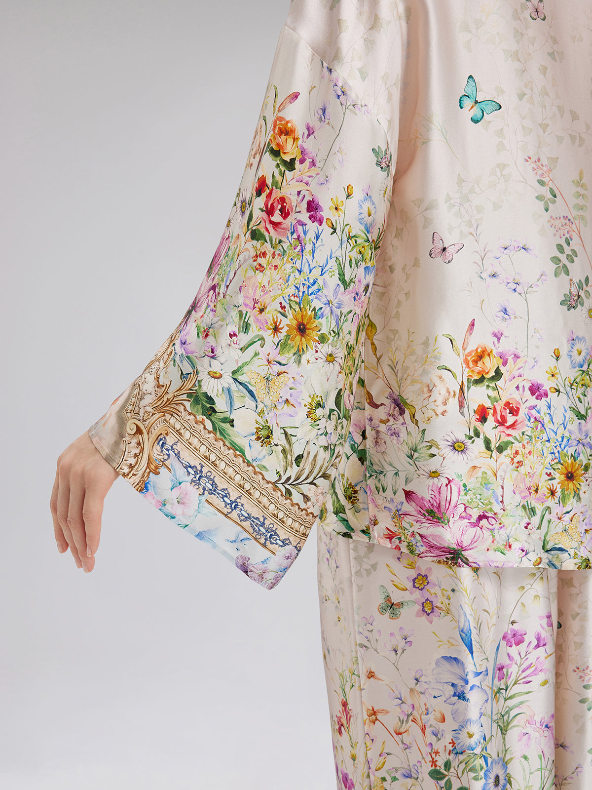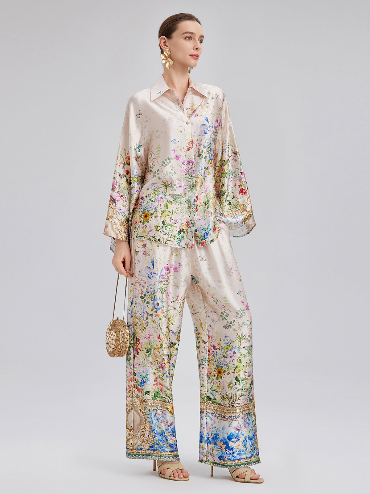 Made from 100% silk satin, this shirt offers a silky-smooth touch and understated luxury. Featuring floral prints with a hand-painted look, each flower is precisely positioned using advanced cutting techniques. The relaxed fit and slight bell sleeves flatter the figure effortlessly.