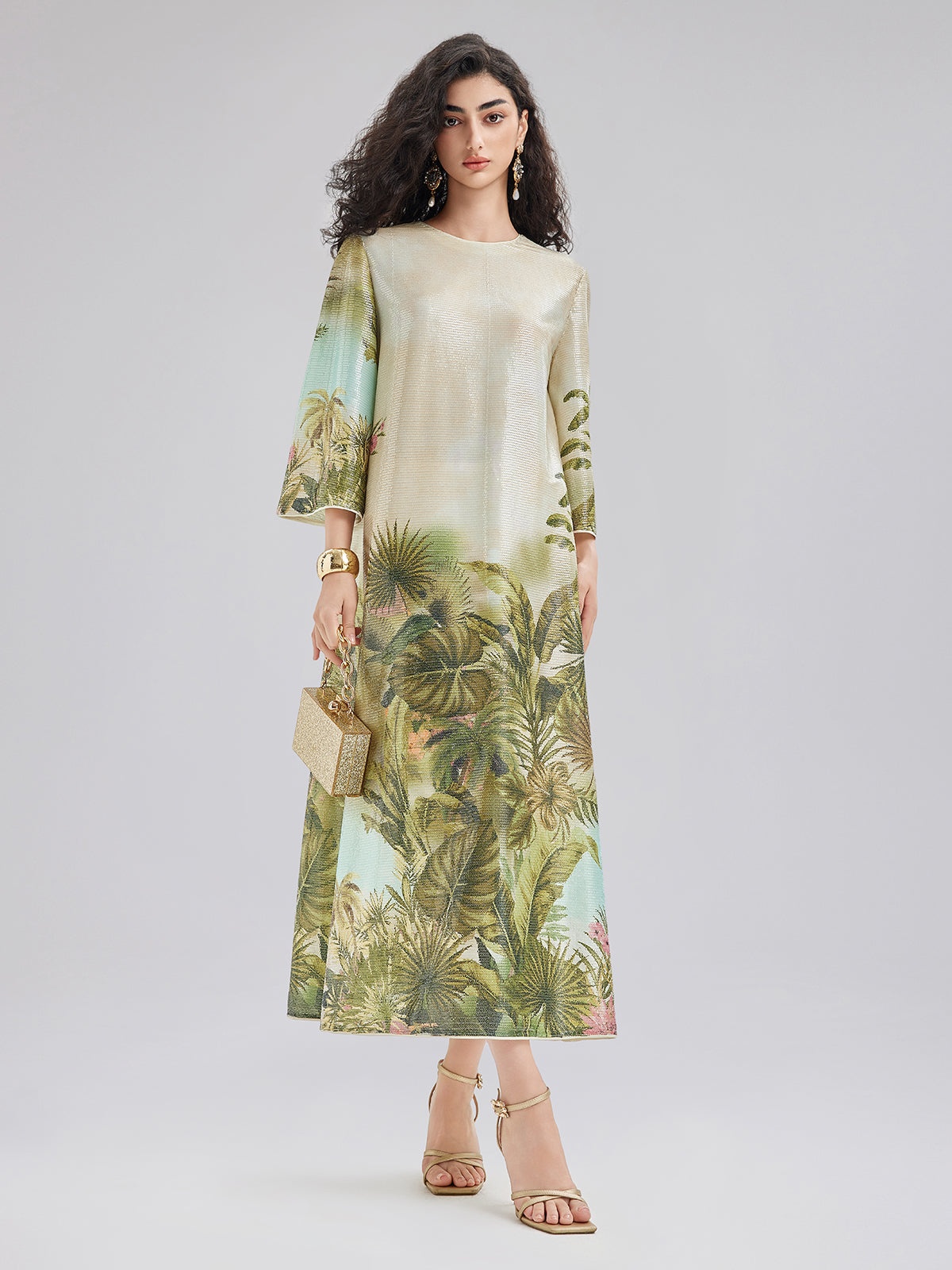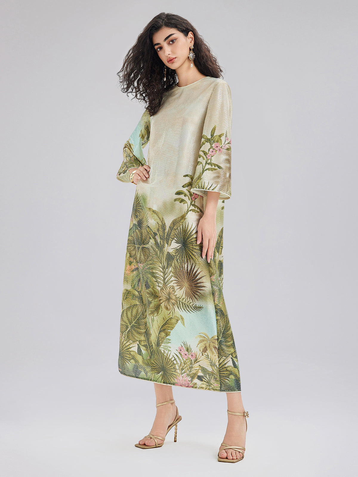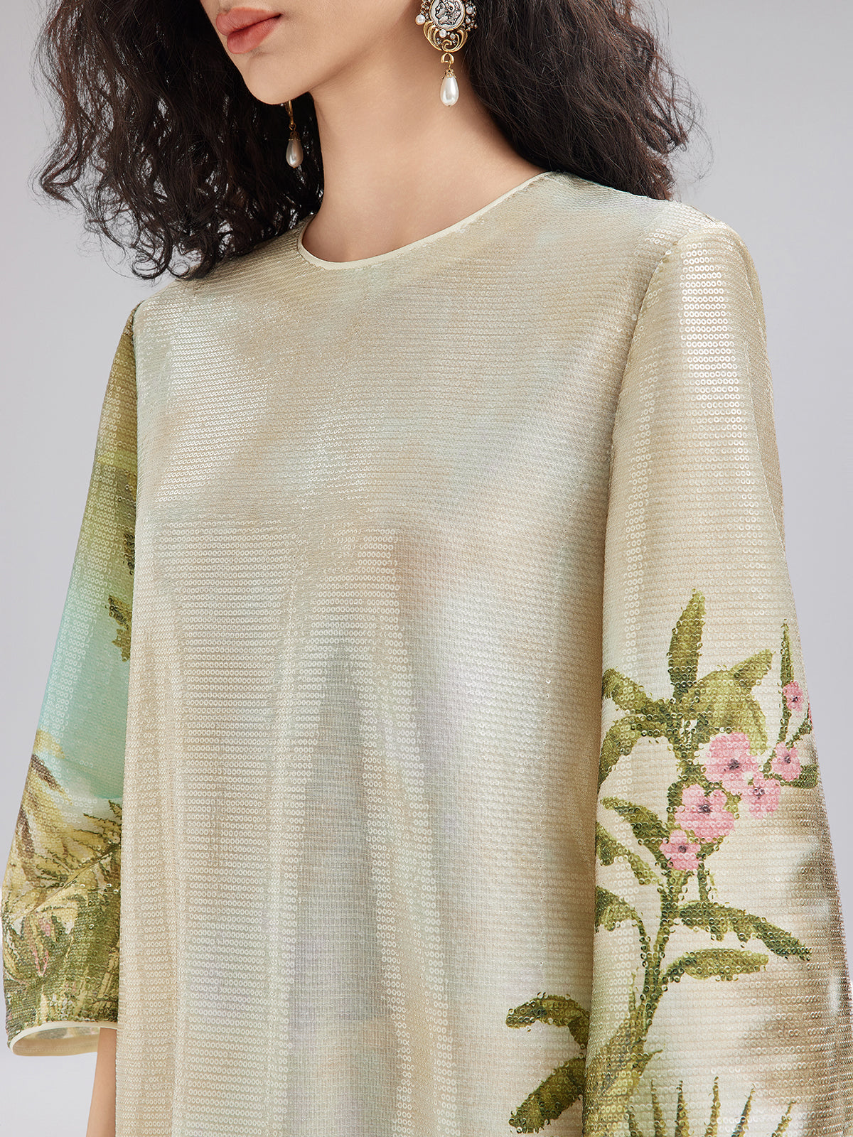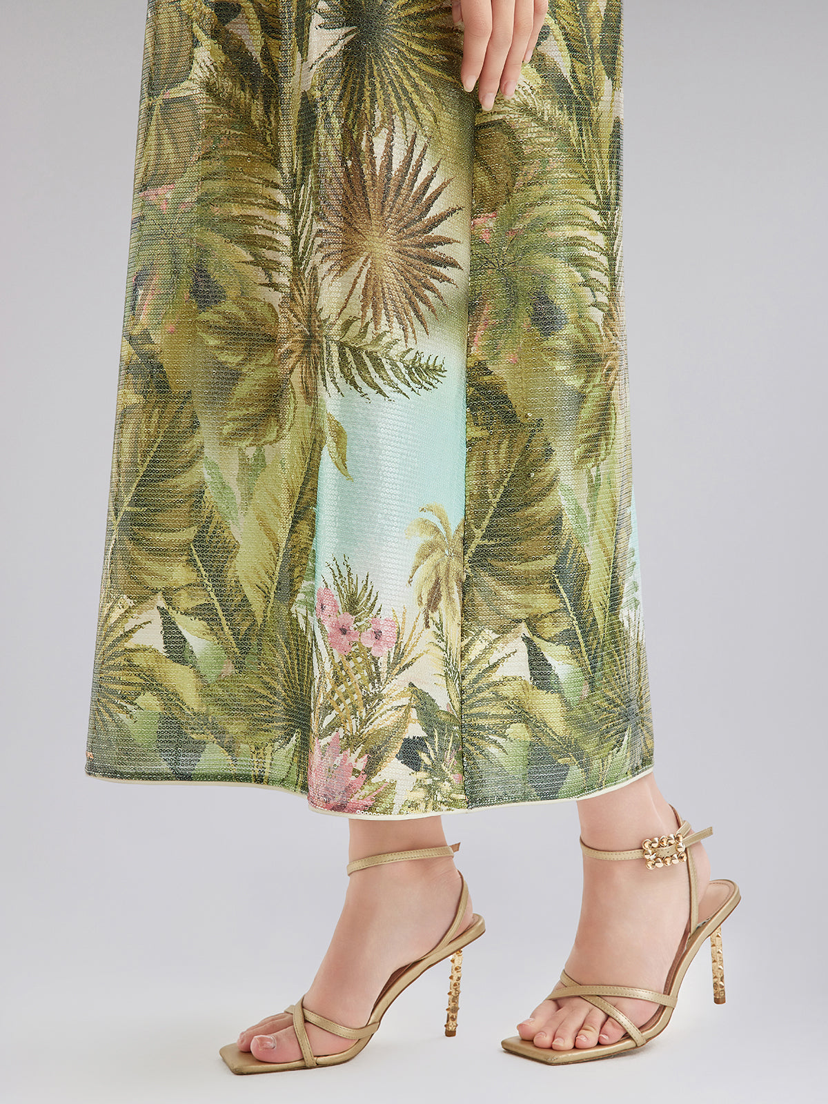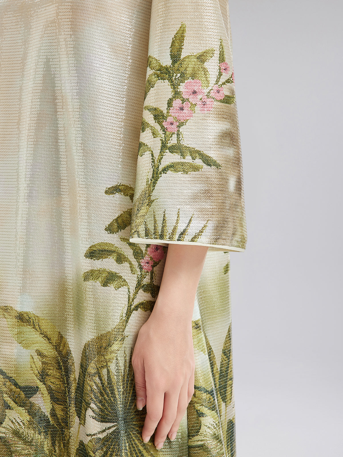 Crafted from a custom shiny sequin-knit fabric with delicate tropical plant patterns, this dress features soft colors that create a fresh, natural vibe. The hidden back zipper ensures easy wear, while the relaxed, stretchy fit provides comfort and movement. The fabric drapes beautifully, flowing effortlessly for a sleek, fluid look.