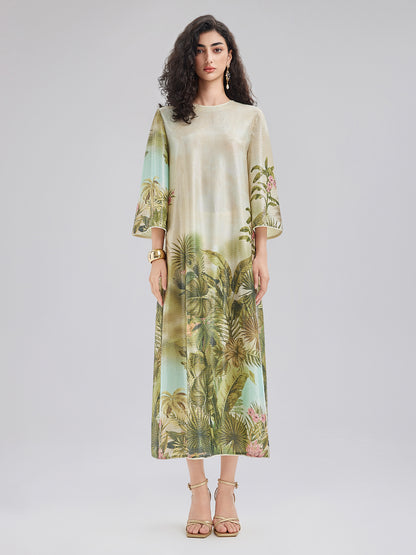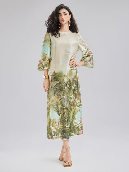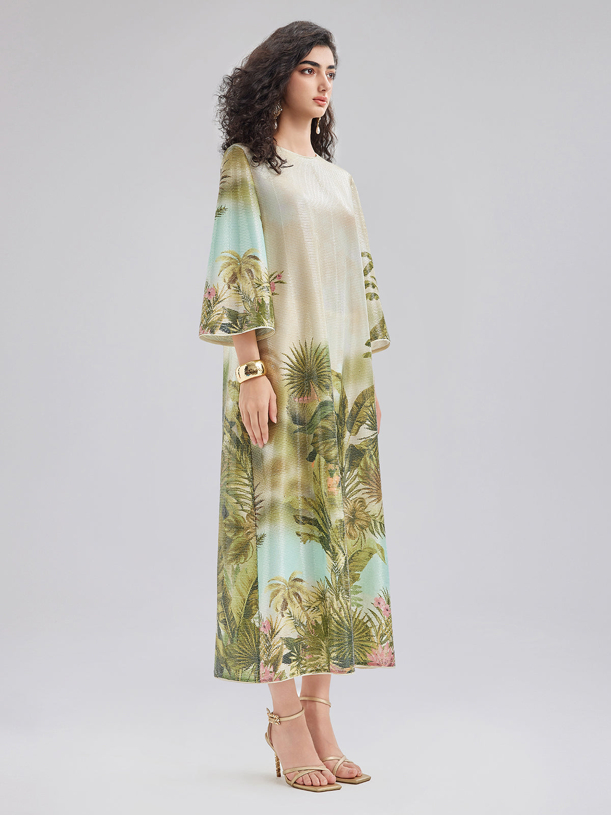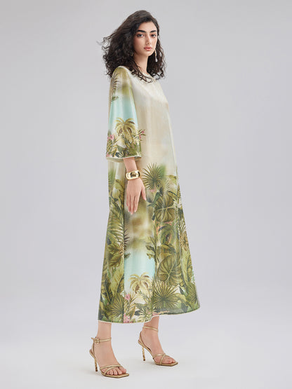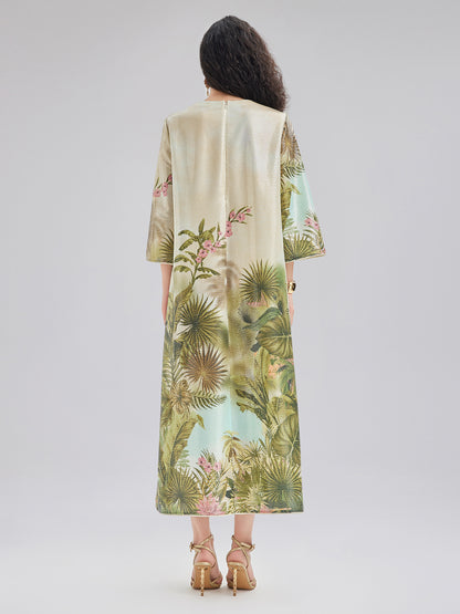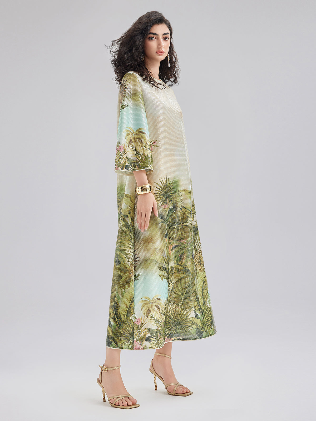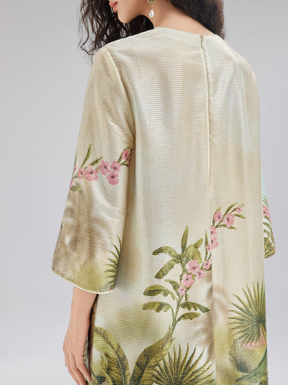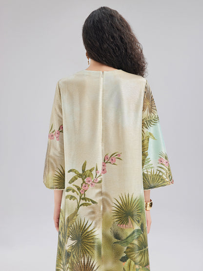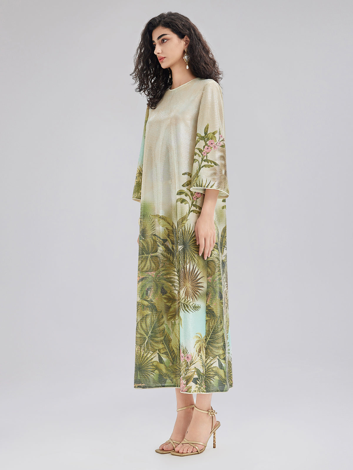Crafted from a custom shiny sequin-knit fabric with delicate tropical plant patterns, this dress features soft colors that create a fresh, natural vibe. The hidden back zipper ensures easy wear, while the relaxed, stretchy fit provides comfort and movement. The fabric drapes beautifully, flowing effortlessly for a sleek, fluid look.
