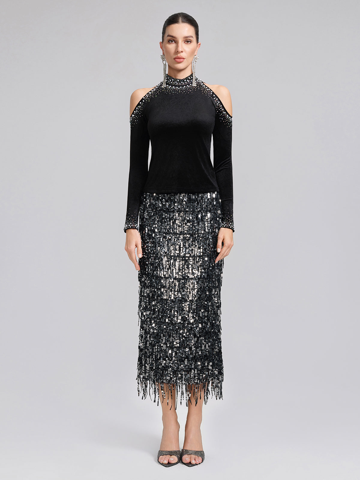 Velvet Cold-Shoulder Beaded Rhinestone Top