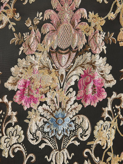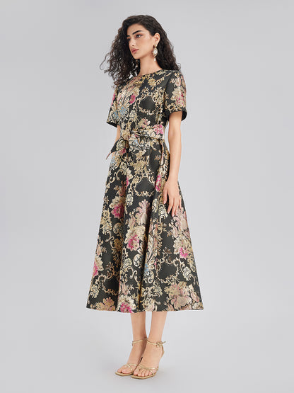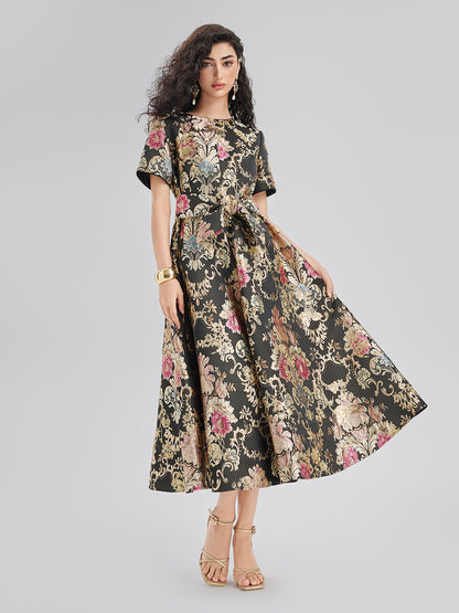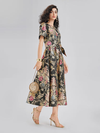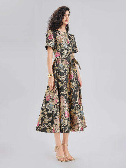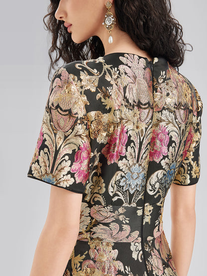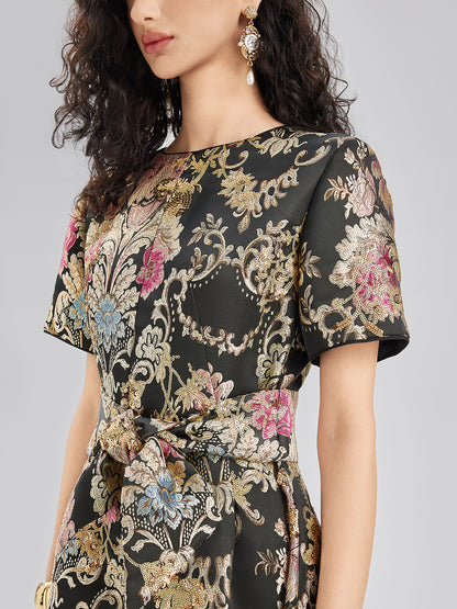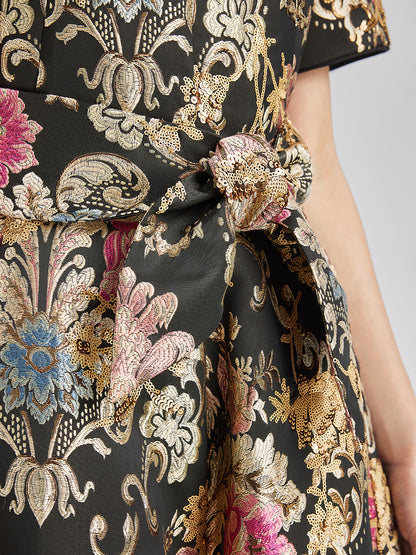Gold-thread jacquard with sequin embroidery adds Baroque-inspired richness. Self-fabric bow belt. Structured yet breathable with a soft lining. The classic crew neck and short sleeves subtly highlight the arms. Concealed back zip for a smooth, easy fit.