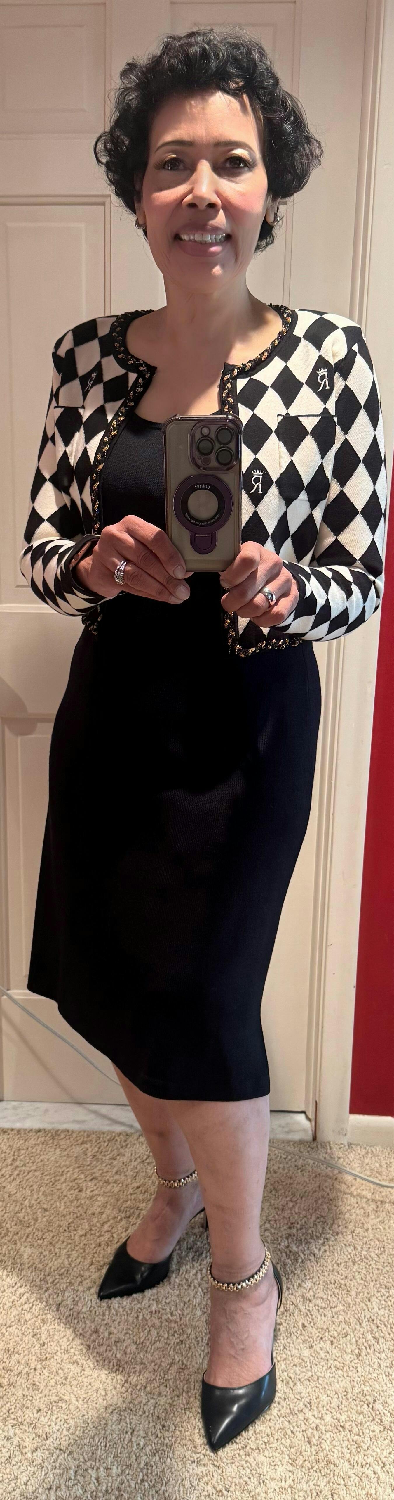 The classic checkerboard pattern with the brand letter embroidery R and exquisite brided trim as embellishment exudes elegant temperament and intellectual sophistication.