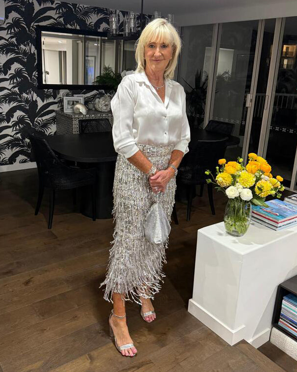Love the look? Explore @leylamoaser's exact Silk Embroidered Blouse and Layered Sequin Skirt here.