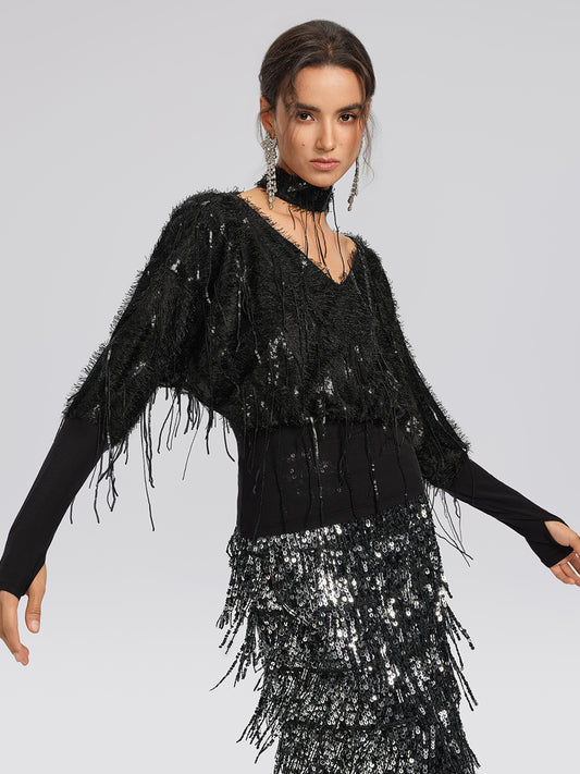 Batwing Stretch Sequin Fringe Top