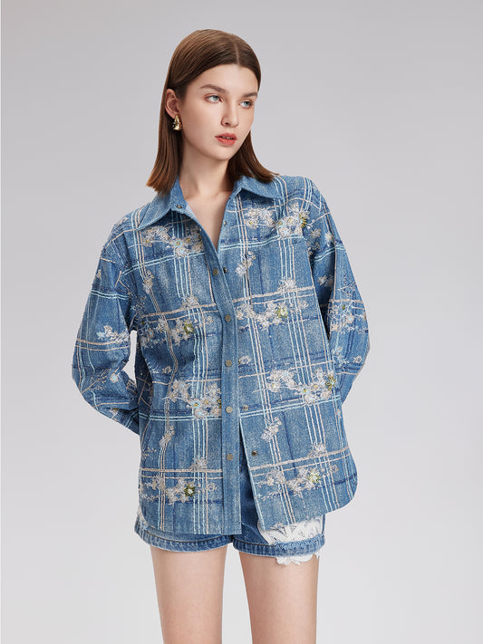 Two-Tone Check Tweed Hand-Beaded Floral Jacket (Matching Scrunchie Included)