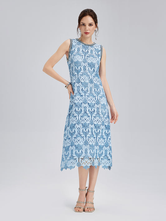Vine Silver-Thread Embroidered Beaded Lace Dress (Belt Included)