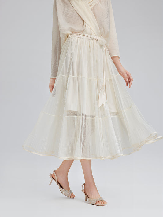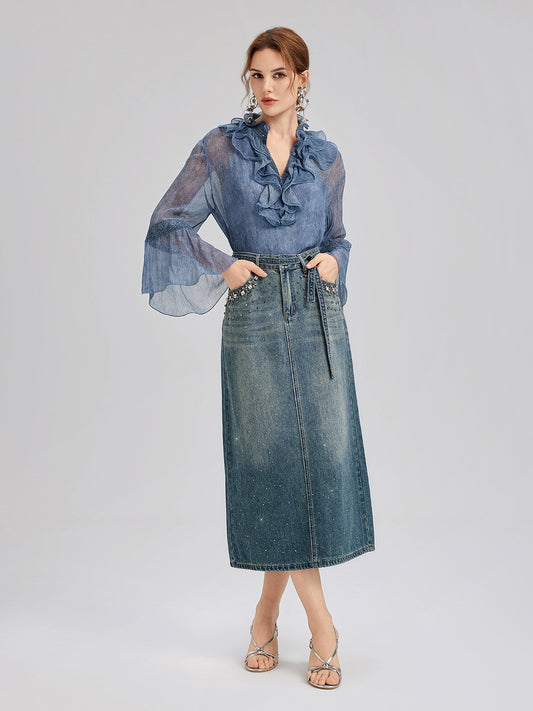 Hand-Beaded Rhinestone Waist Denim Skirt