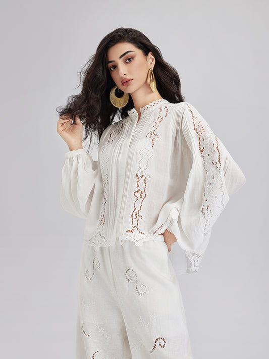Pleated Lace-Ruffle Trim Bow-Tie Blouse