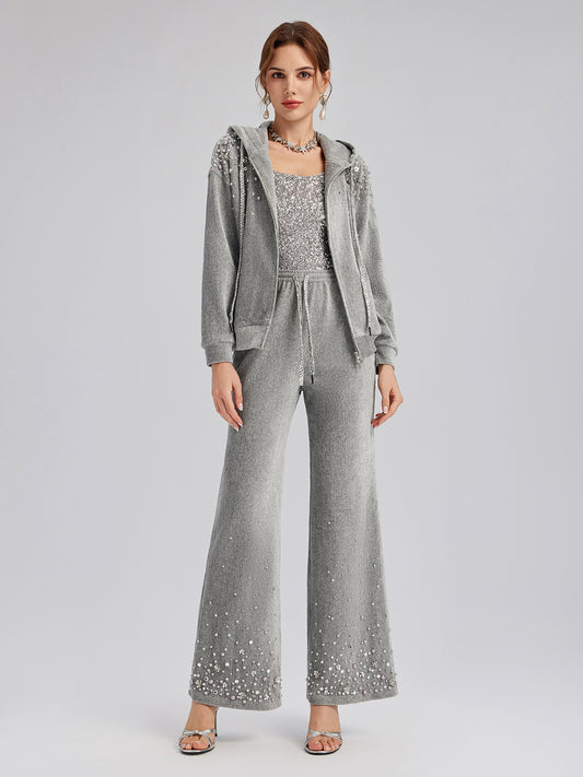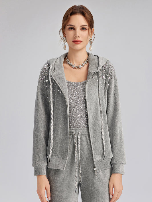 Chenille Ribbed Beaded Hooded Zip Jacket