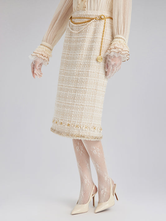Two-Tone Check Tweed Hand-Beaded Floral Skirt