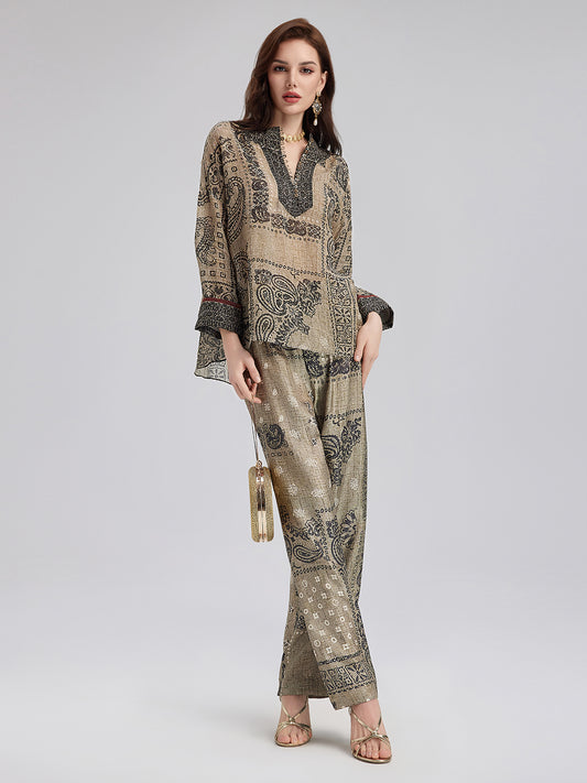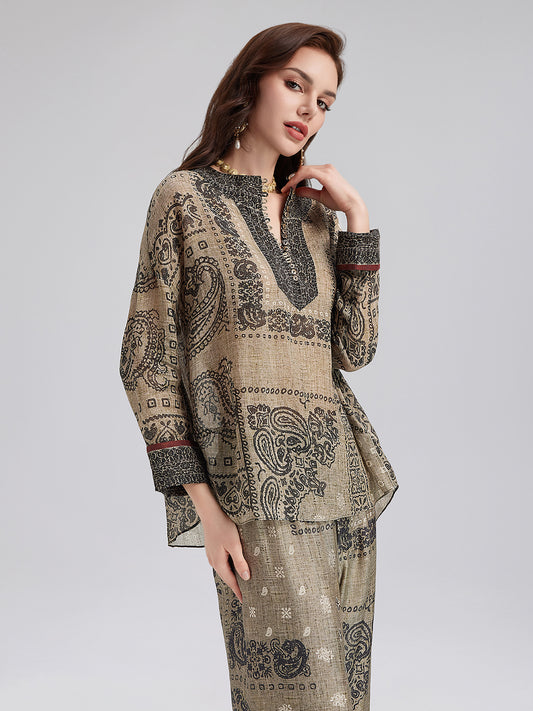 Paisley Cotton-Linen Vacation Relaxed Blouse