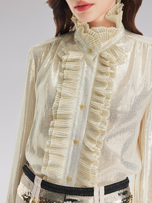 Ruffled Stand Collar Beaded Shirt