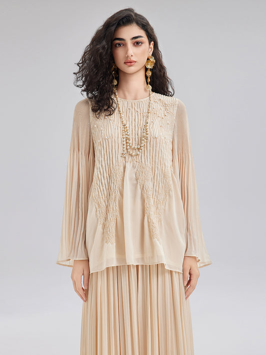 Textured Pleated Ruffle Blouse (Detachable Ribbon Tie Included)