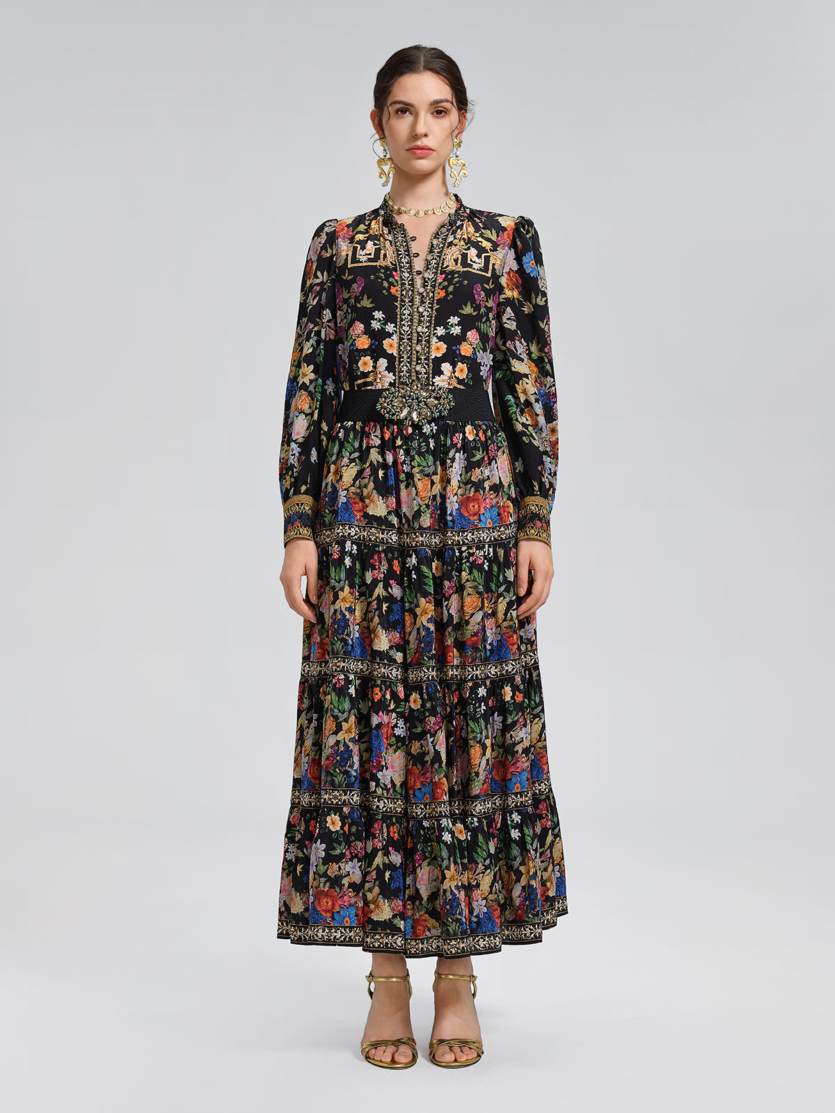 Crafted from fluid, breathable silk with an elegant drape, this blouse features precisely placed rhinestone embellishments that subtly echo the printed motifs. A classic stand collar refines the neckline, while the relaxed silhouette offers effortless elegance for everyday wear, travel, or city occasions.