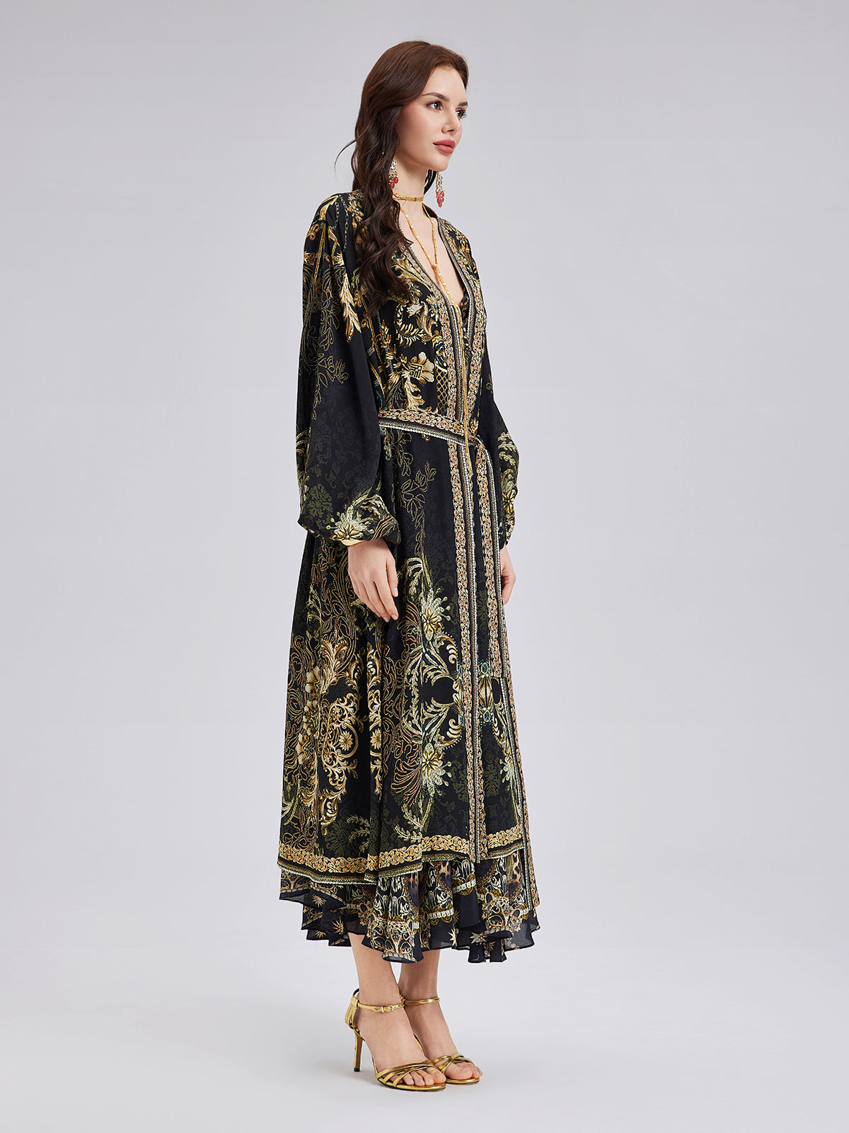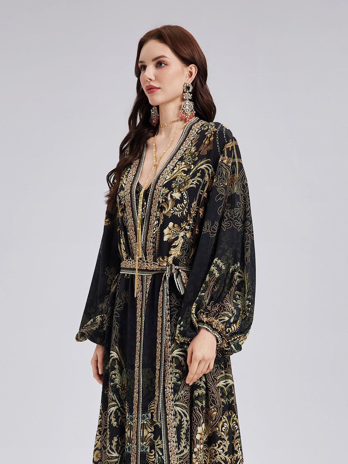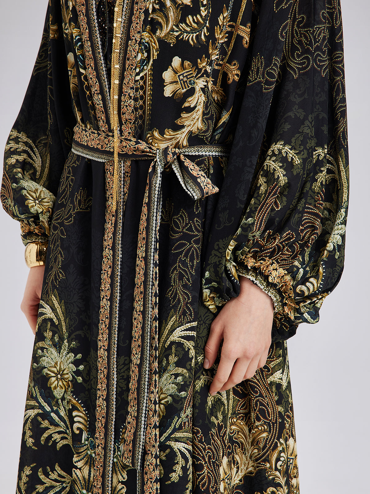 Made from high-quality Baroque print silk, this fabric is soft, breathable, and skin-friendly. The detailed, luxurious print enhances its elegant appeal. The loose-fit design offers comfort and movement, while the V-neckline accentuates the figure. The adjustable belt defines the waist with great flexibility.