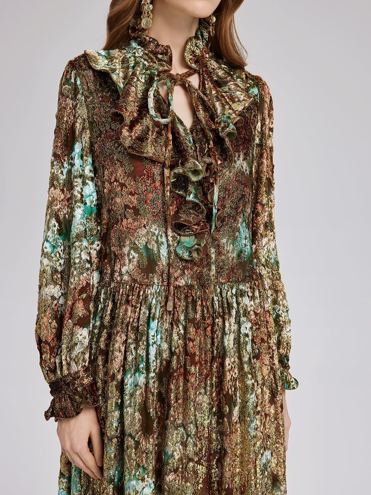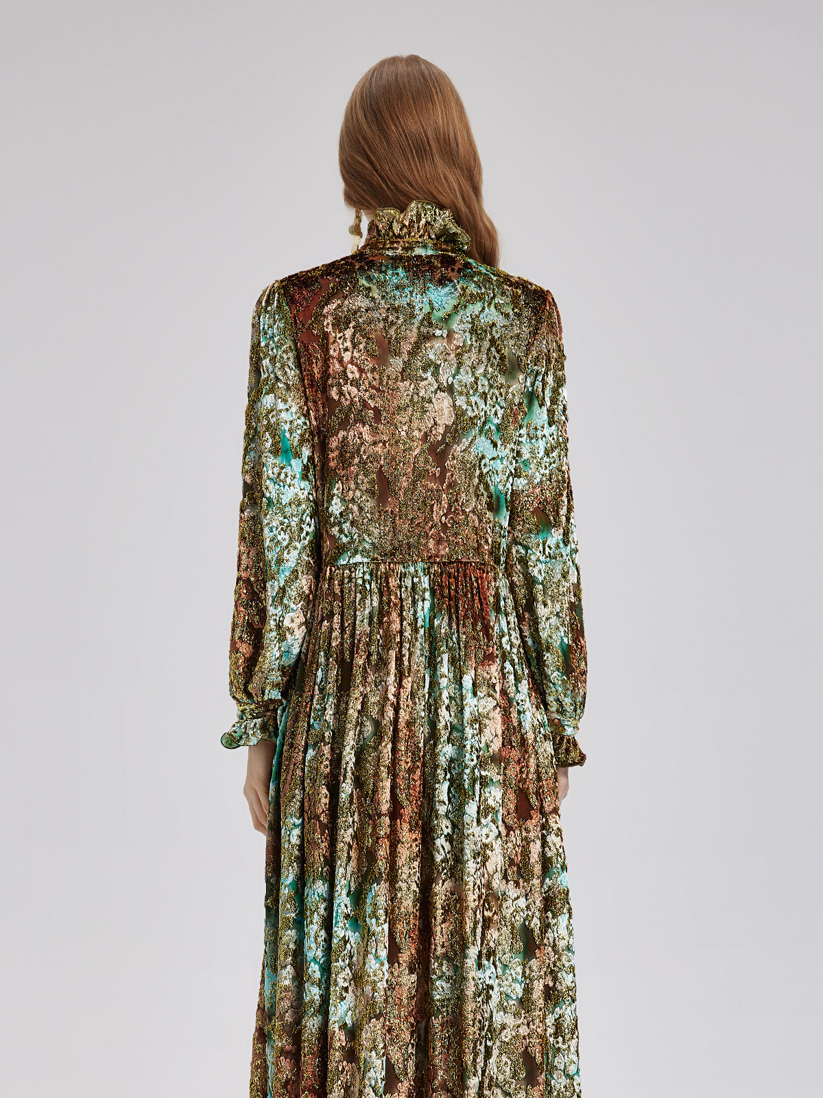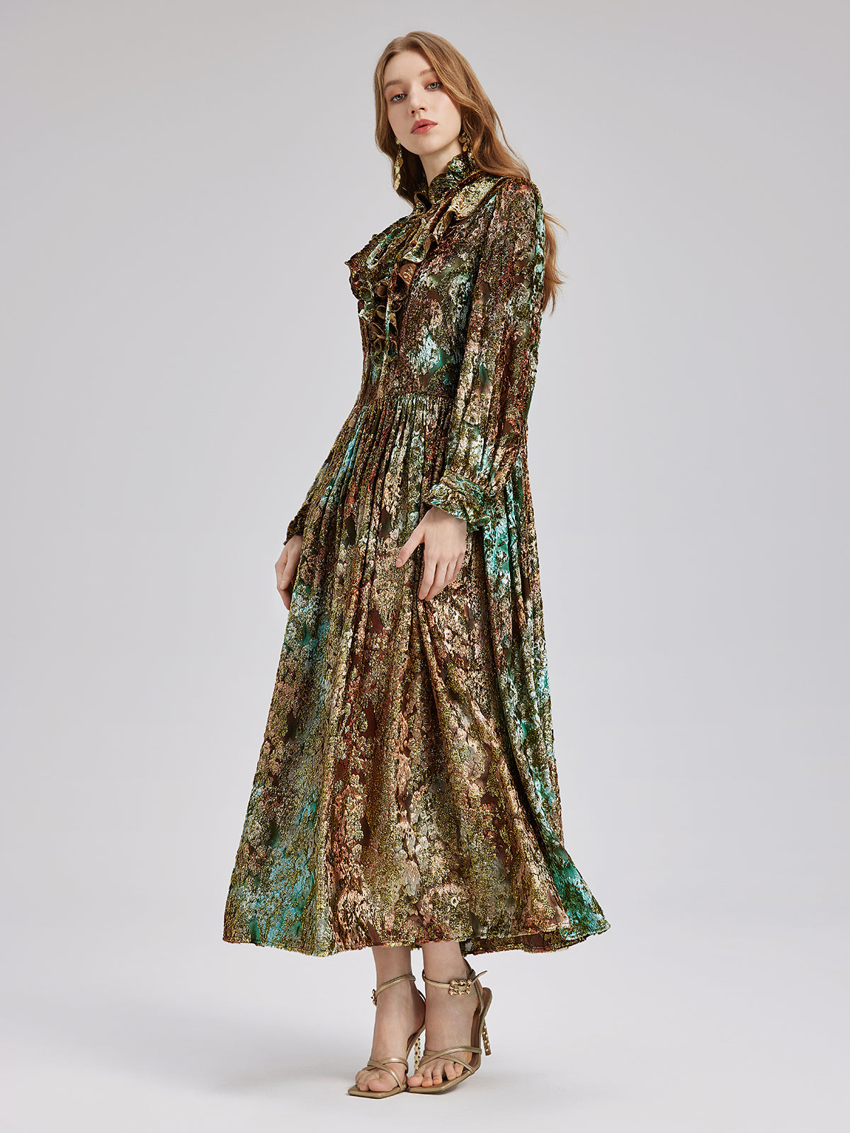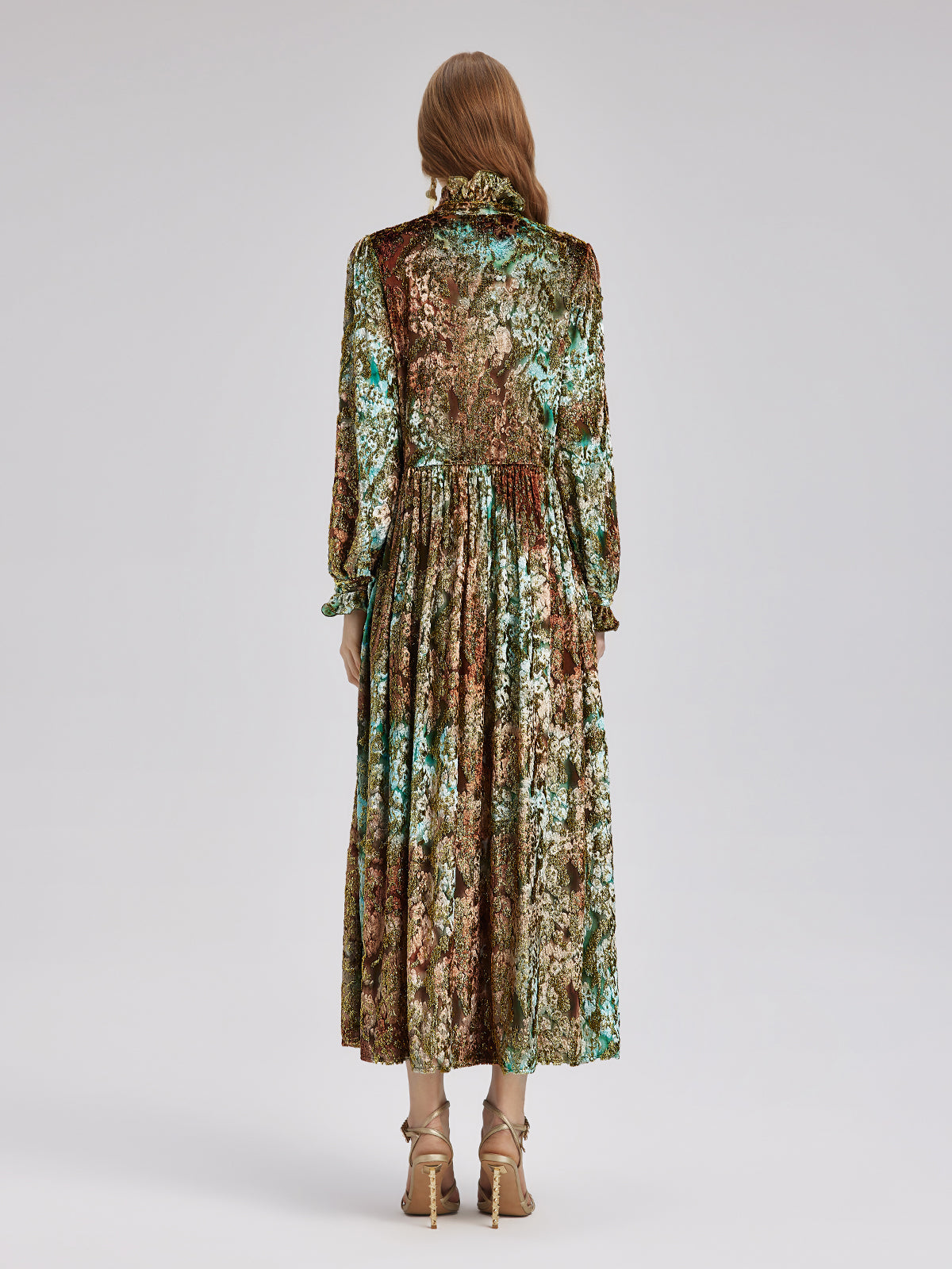 Burnt Velvet Gold Smudge Printed Lotus Collar Dress