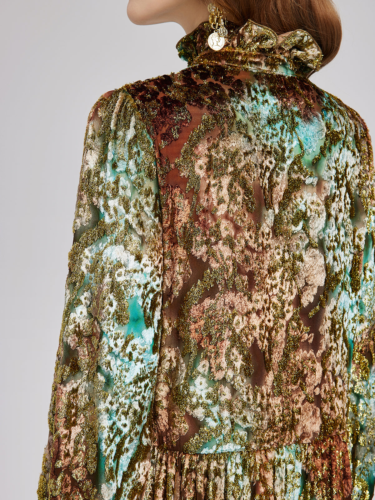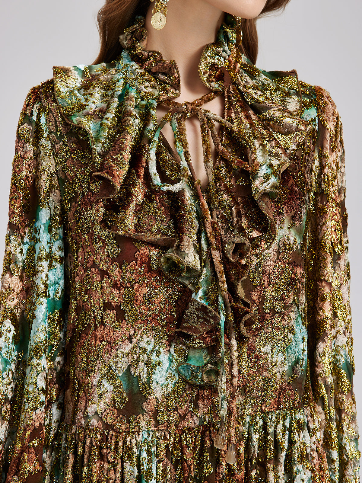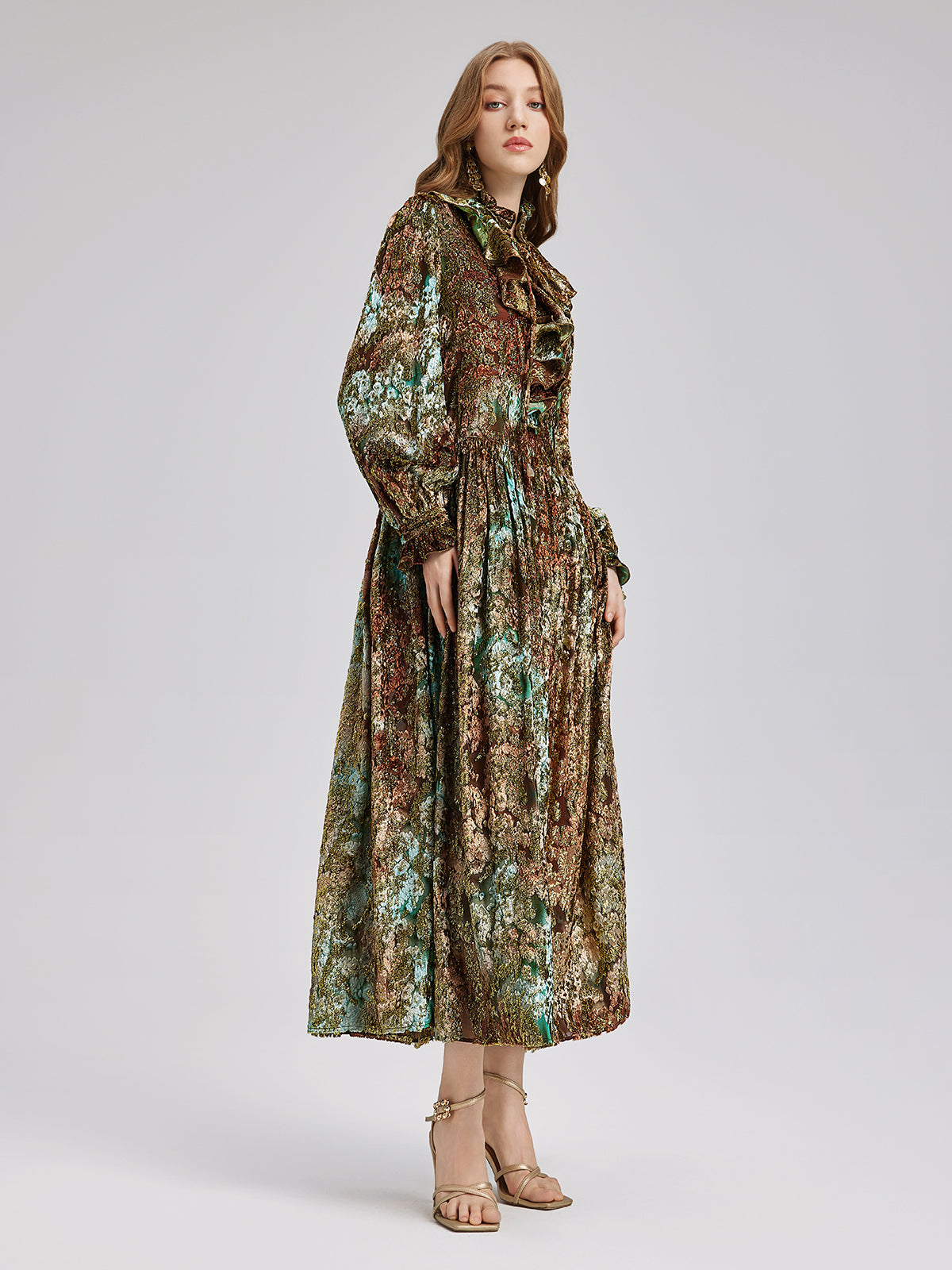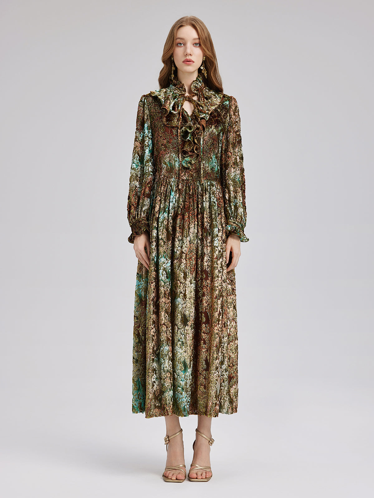 Burnt Velvet Gold Smudge Printed Lotus Collar Dress
