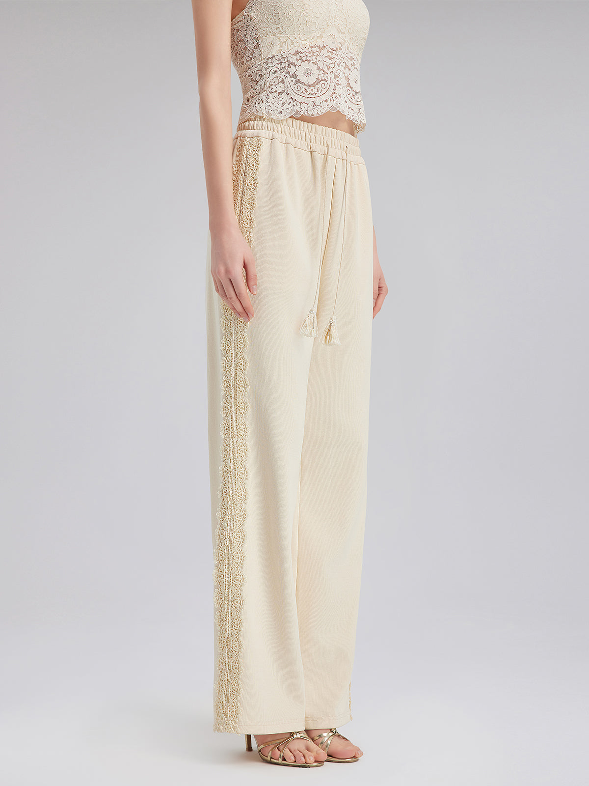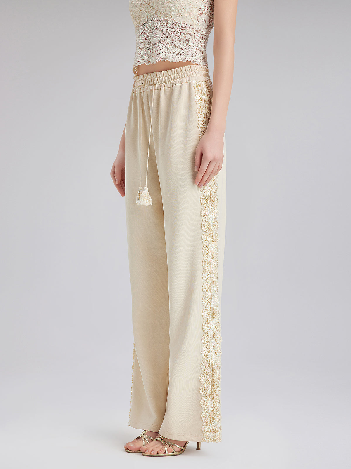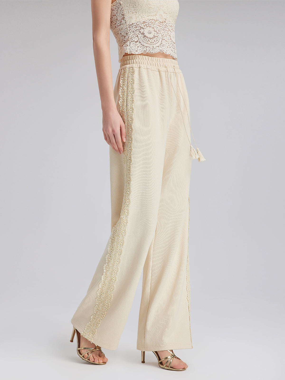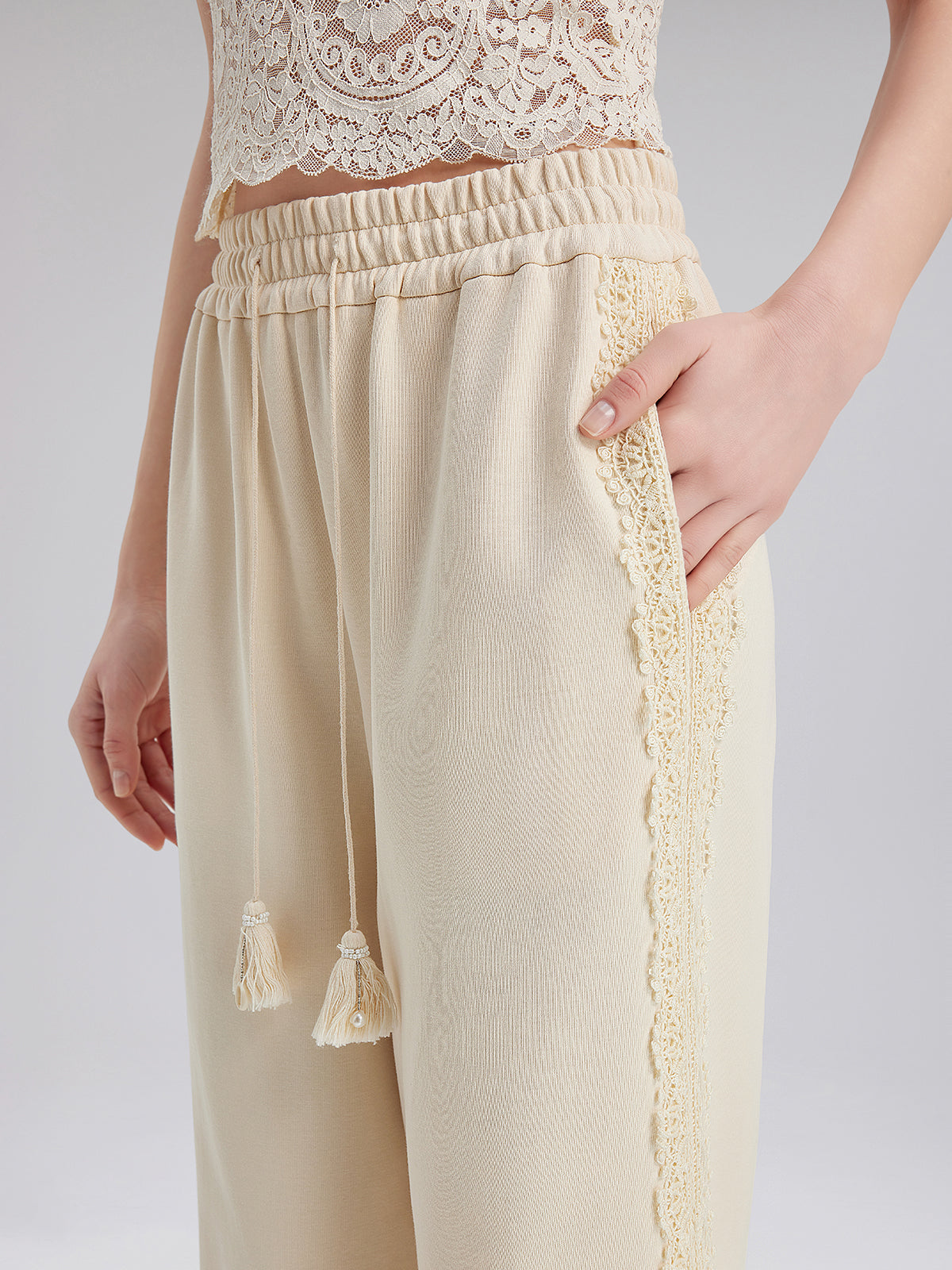Soft, breathable cotton-linen blend with stretch. Relaxed straight-leg cut for all body types. Adjustable elastic waist with drawstring. Hand-sewn lace trim for boho charm. Practical side pockets included.