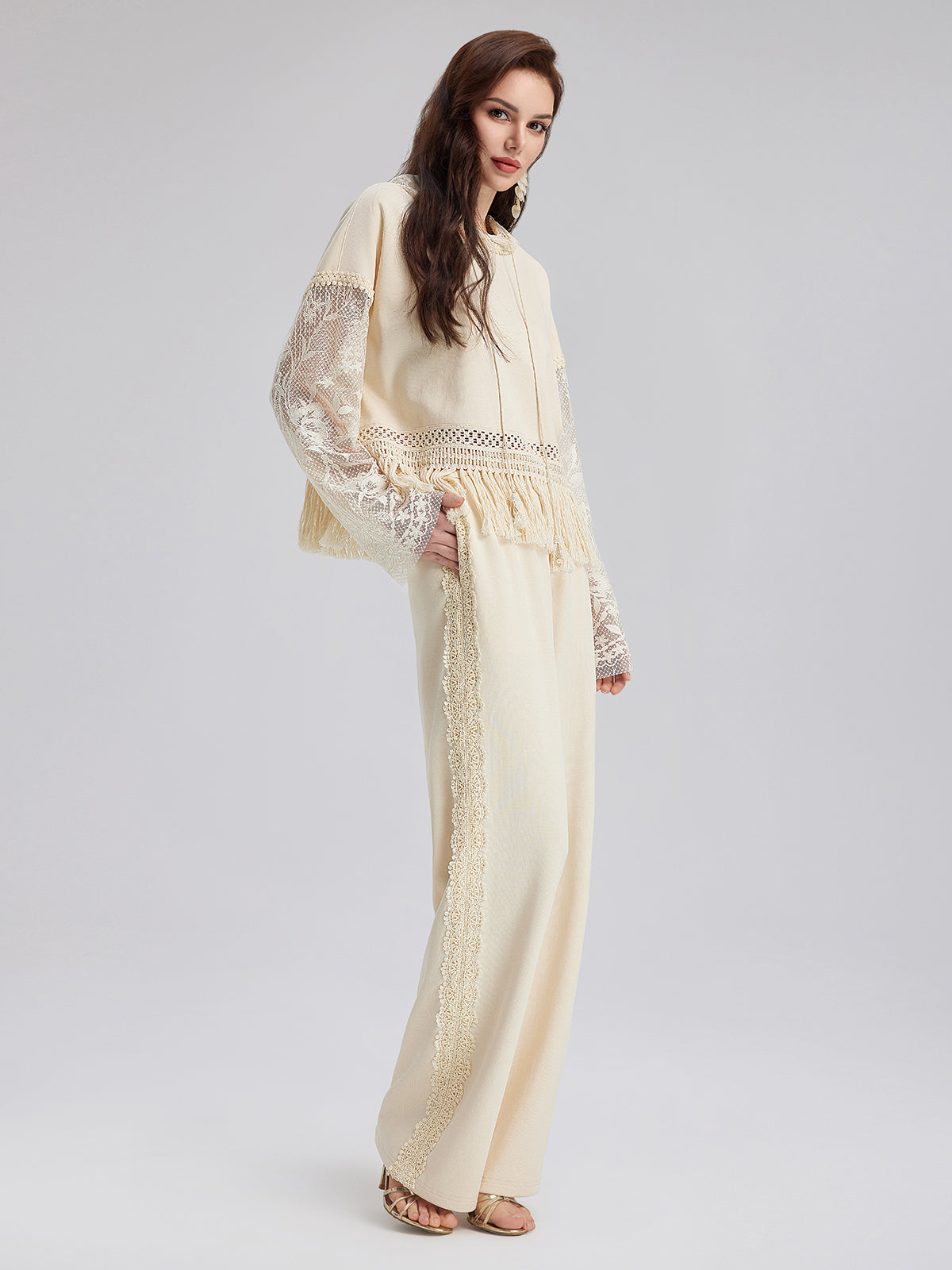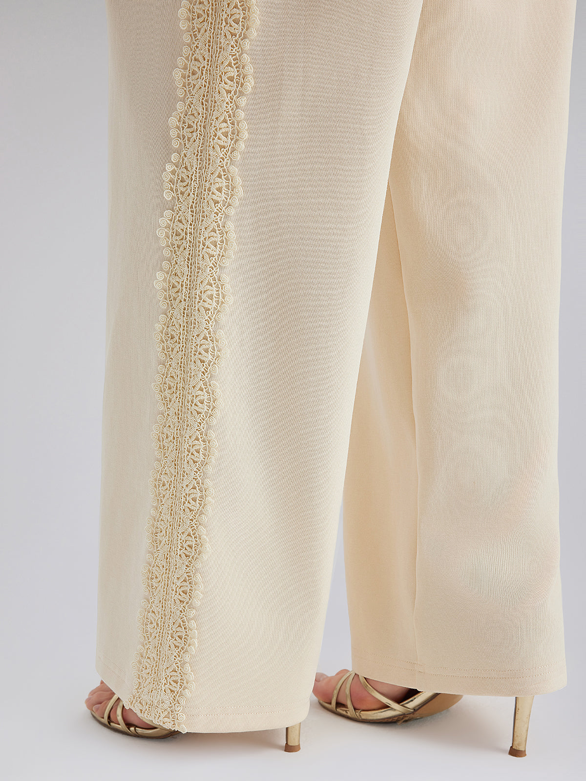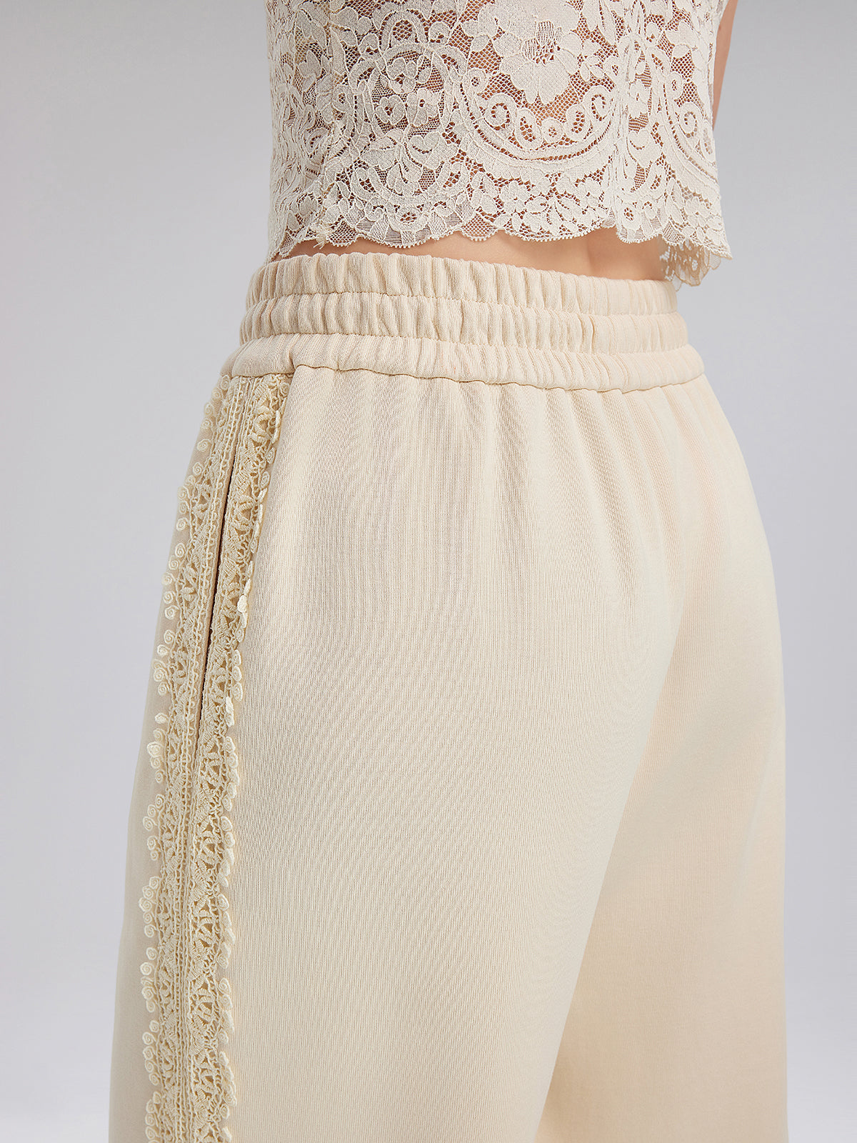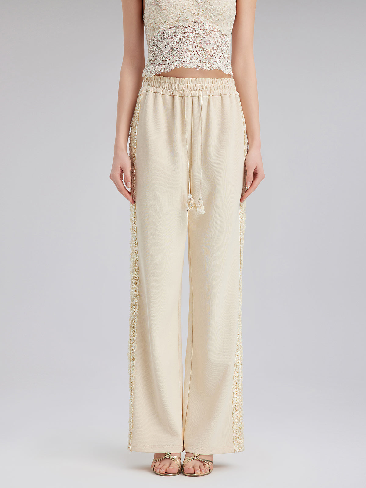 Soft, breathable cotton-linen blend with stretch. Relaxed straight-leg cut for all body types. Adjustable elastic waist with drawstring. Hand-sewn lace trim for boho charm. Practical side pockets included.