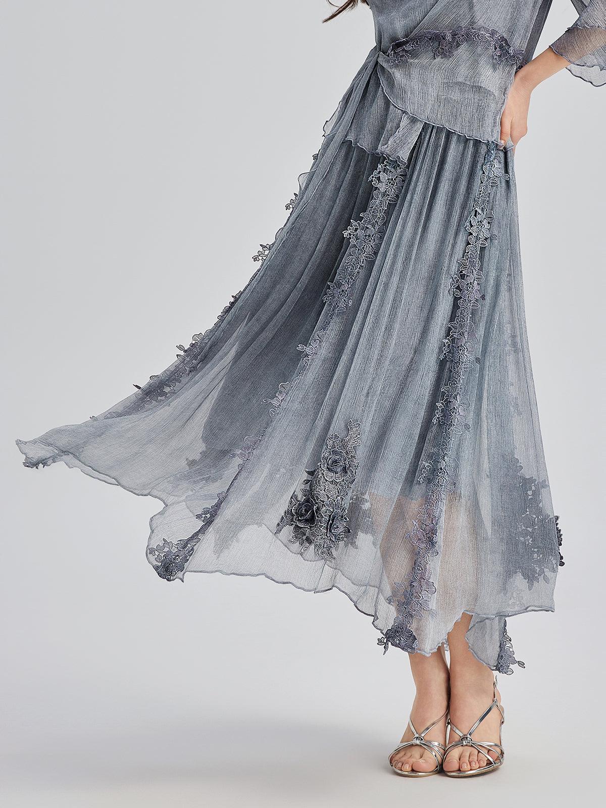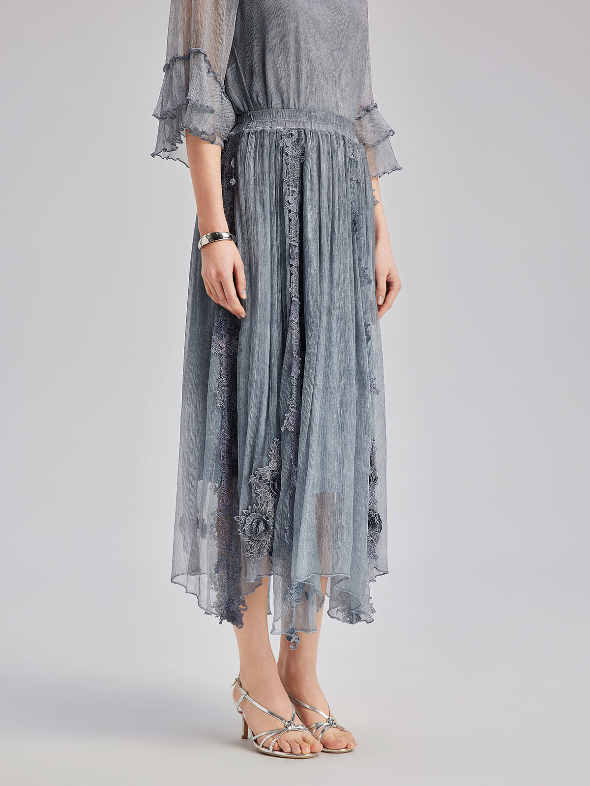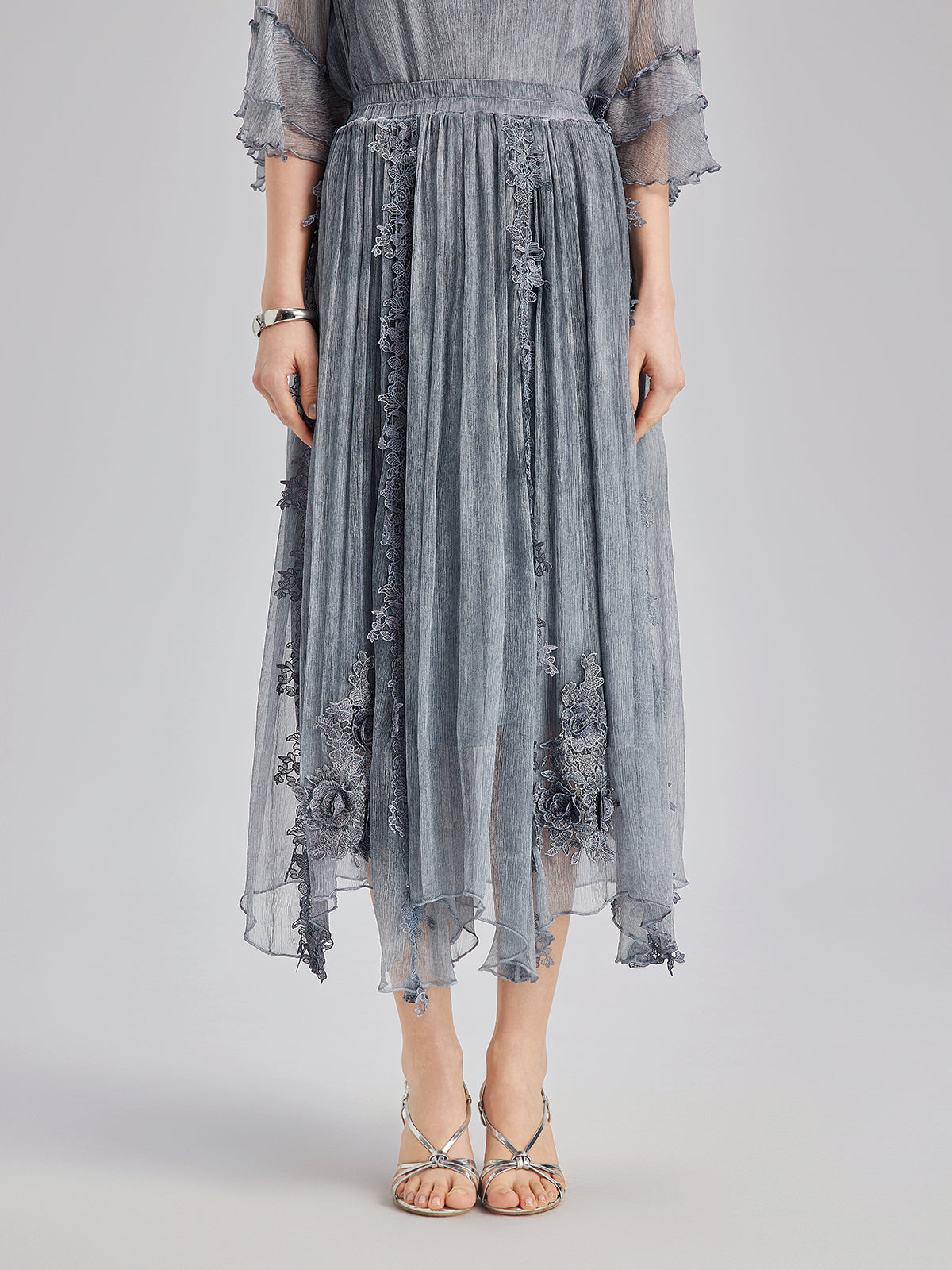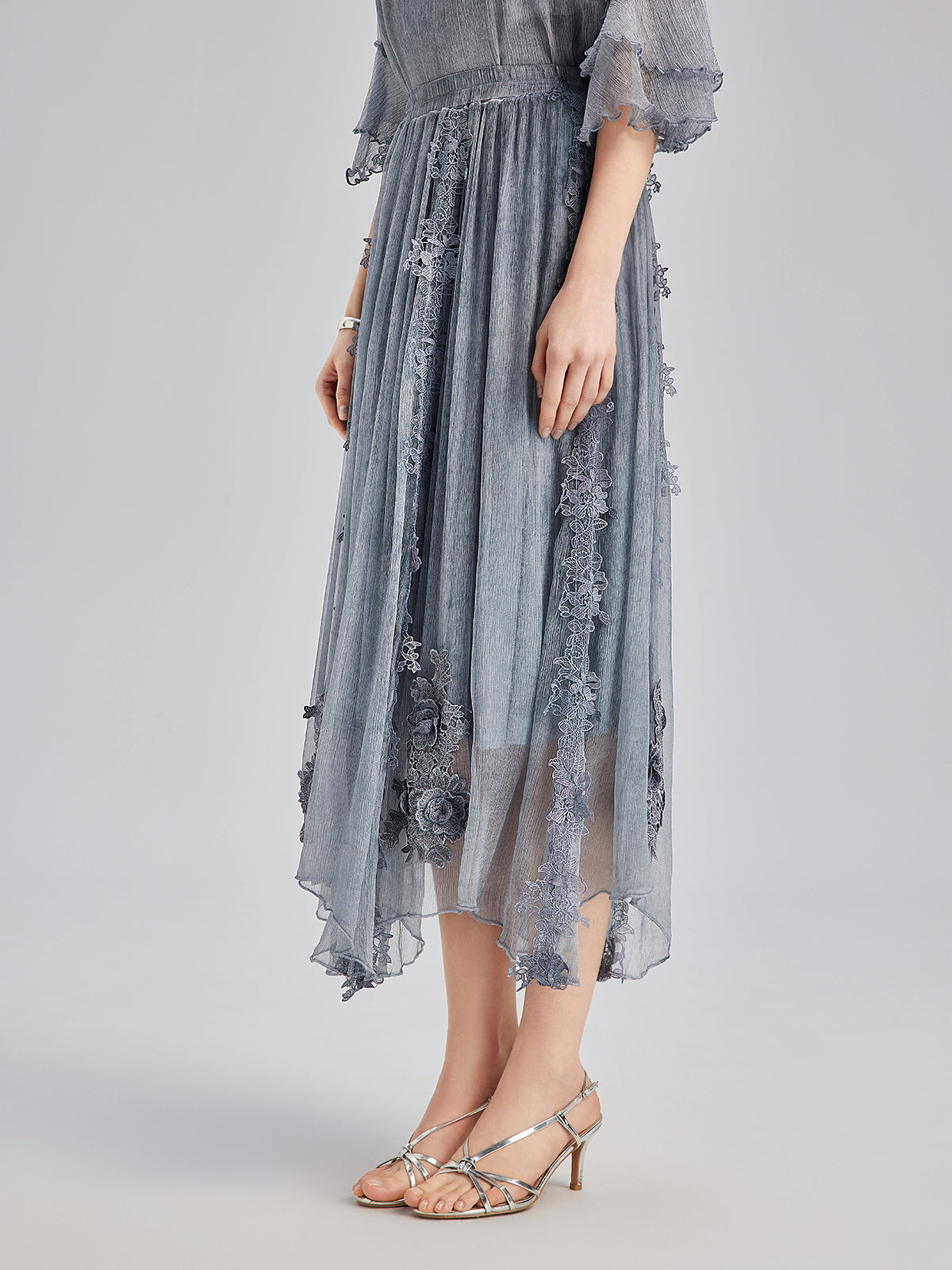 Made from lightweight, breathable silk dyed fabric, perfect for spring, summer, and fall. 3D handcrafted lace trim adds a feminine, romantic touch. Elastic waistband for high comfort and flexibility. Ankle-length, flowy and versatile with an asymmetrical hem for a unique, stylish look.