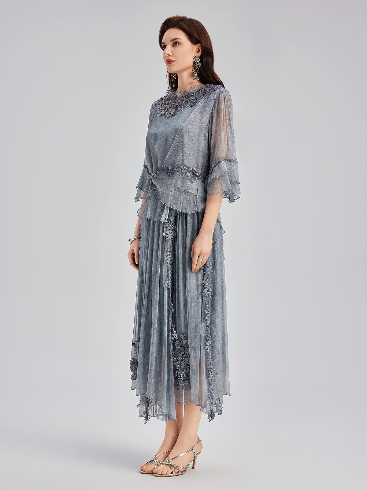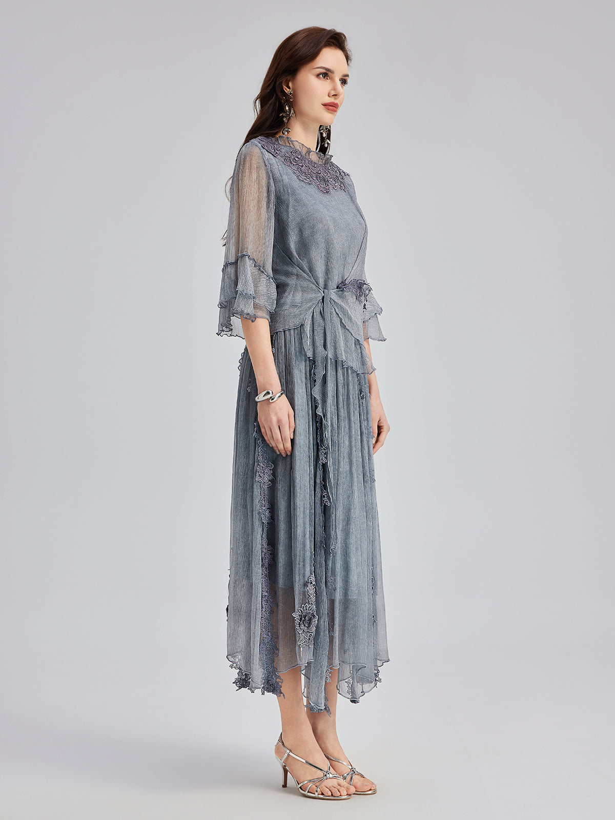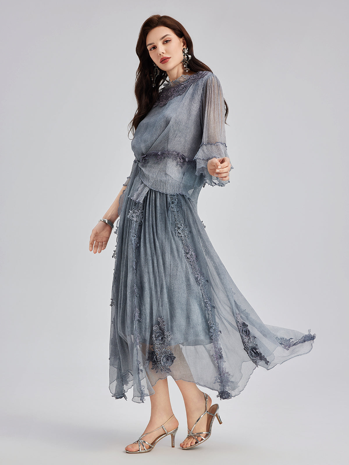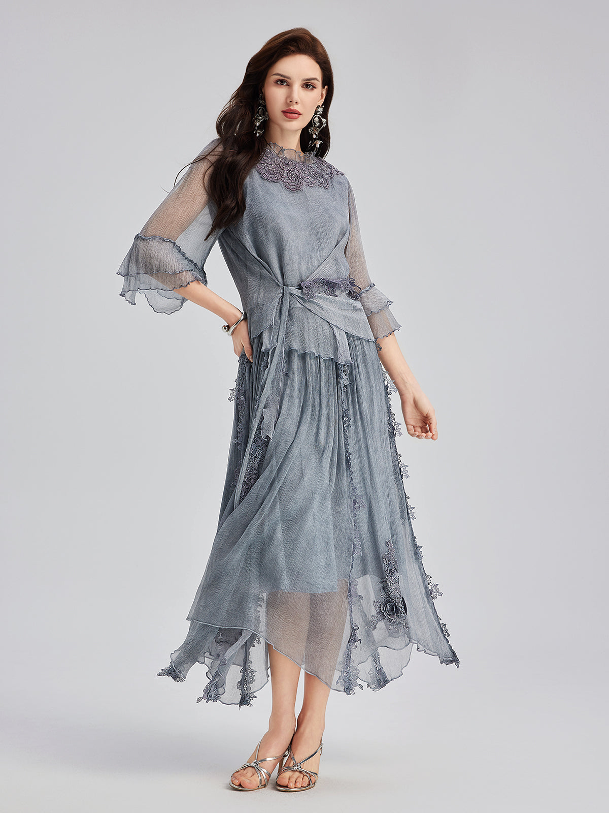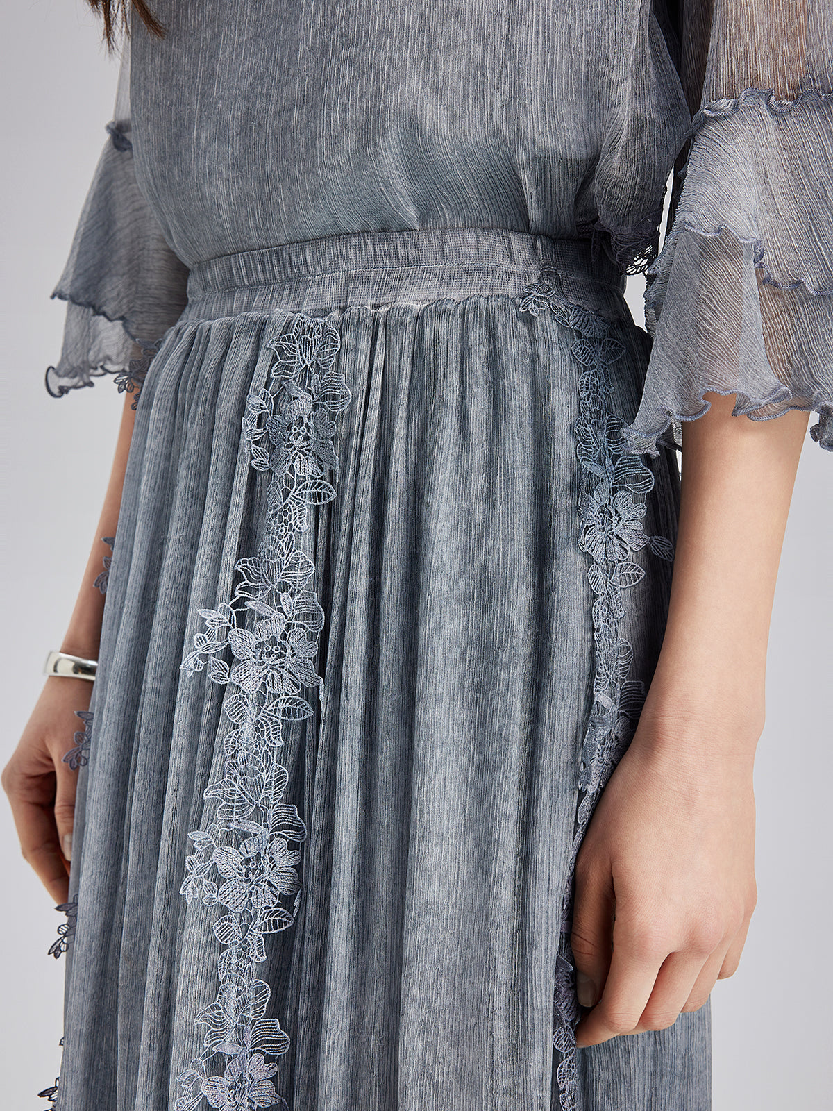 Made from lightweight, breathable silk dyed fabric, perfect for spring, summer, and fall. 3D handcrafted lace trim adds a feminine, romantic touch. Elastic waistband for high comfort and flexibility. Ankle-length, flowy and versatile with an asymmetrical hem for a unique, stylish look.